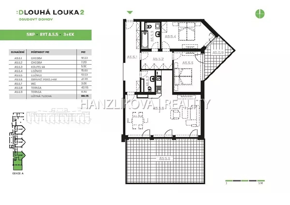 Nabízíme k pronájmu luxusní bytovou jednotku číslo A.5.5. Jedná se o byt 3+kk o výměře 99,25 m2 se dvěma terasami (8,40 a 42,95 m2), který se nachází v 5.NP rezidenčního komplexu DLOUHÁ LOUKA 2.etapa. Byt se skládá z: prostorné předsíně s vestavěnými skříněmi, koupelny s toaletou, dvou samostatných pokojů a obývacího pokoje s kuchyní. Přístup na terasy je ze všech pokojů. Byt je orientovaný na jiho-východ. Byt je pronajímán včetně kompletního vybavení - postele, vestavěné skříně, pohovka, jídelní stůl s židlemi, kuchyňská linka vč. spotřebičů (lednice s mrazákem, trouba, varná deska, digestoř, myčka), v koupelně pračka se sušičkou. Dům je vybaven výtahem, videotelefony, kabel. rozvody, internetem. V přízemí jsou umístěny společné prostory - kolárna, kočárkárna. Ideální poloha v centru krajského města a přesto uprostřed zeleně vytváří z bytů na DLOUHÉ LOUCE osudový domov. Vhodná orientace komplexu zajišťuje majitelům bytů výhledy na řeku Vltavu a historické centrum Českých Budějovic. Byt je k dispozici ihned.