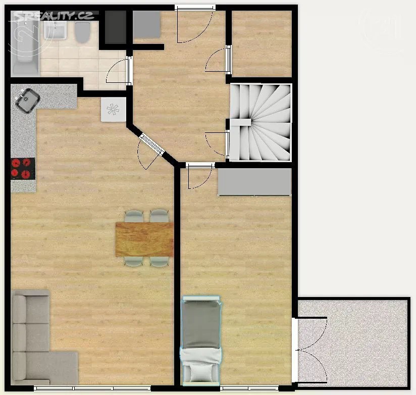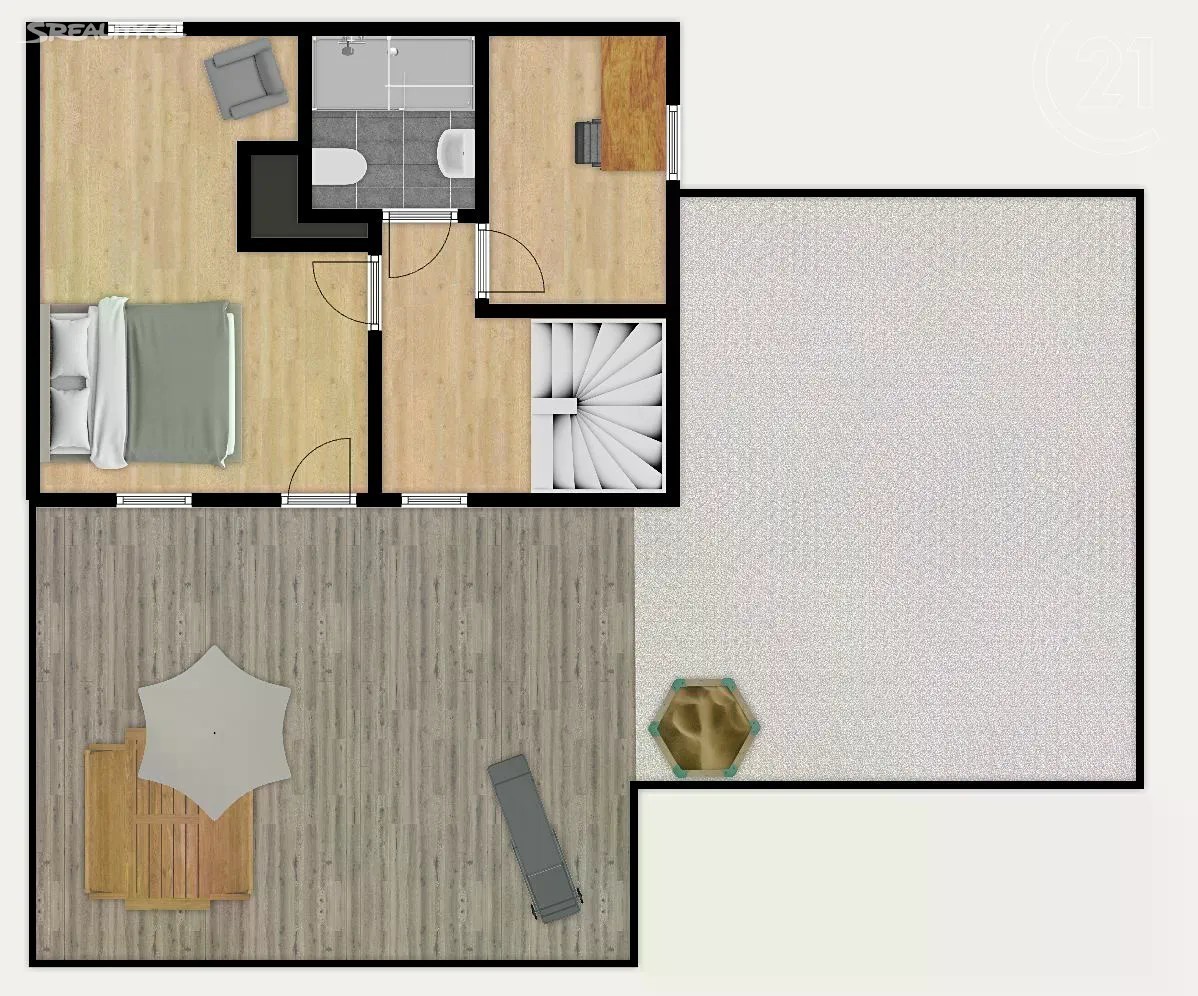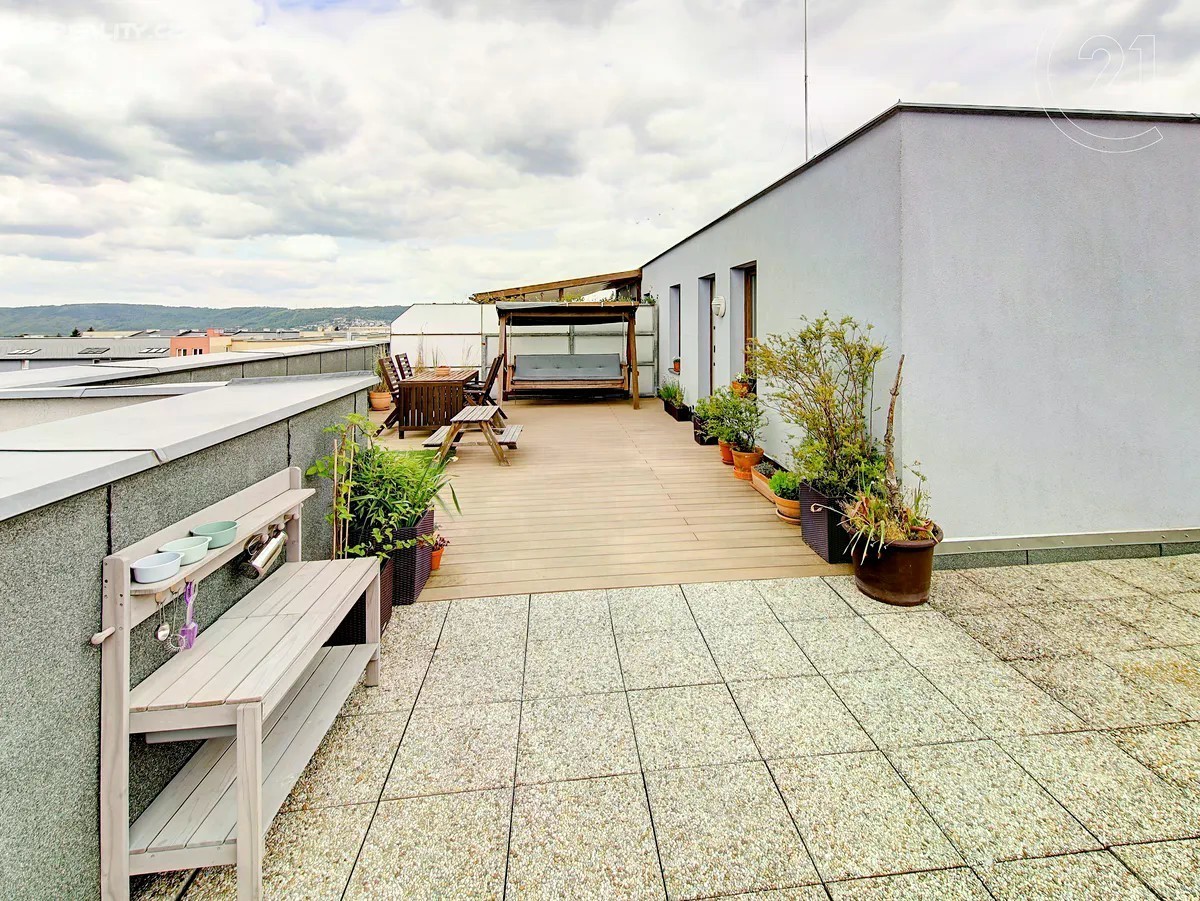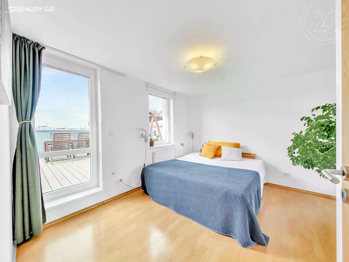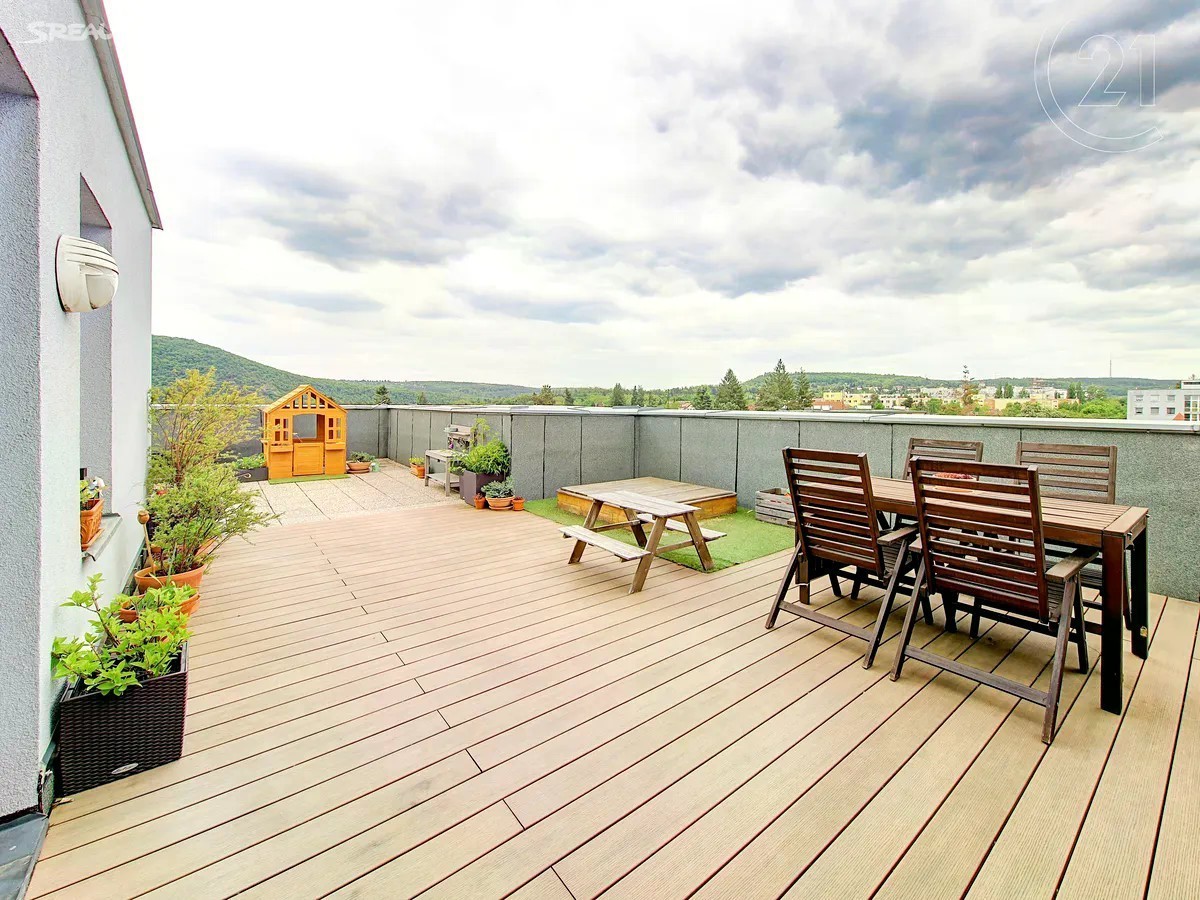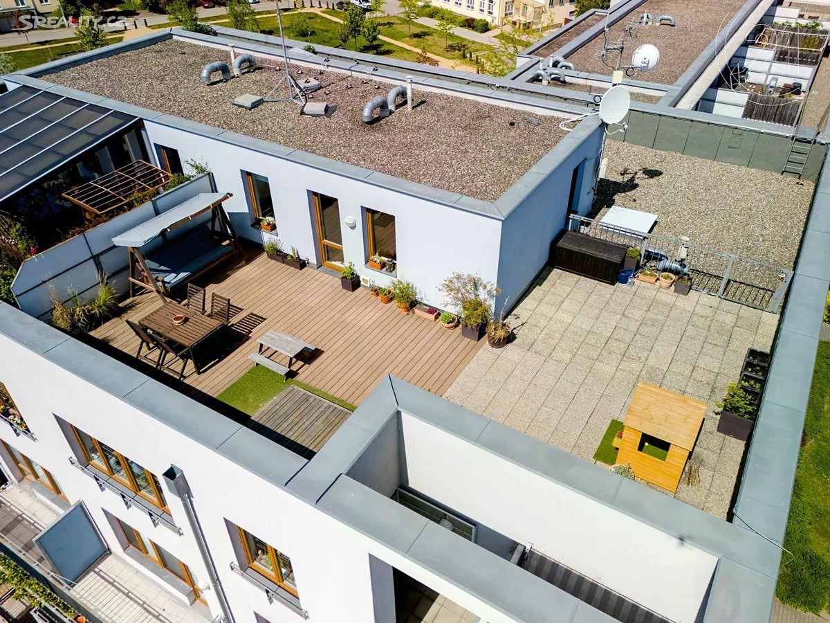 Úžasný slunečný byt 4+kk s výměrou 91 m2 a obrovskou terasou 63 m2 orientovanou na jih v novostavbě na Zbraslavi z roku 2006. Byt je rozdělen do dvou plnohodnotných podlaží v prvním se nachází vstupní hala, obývací pokoj s kuchyní, ložnice s lodžií, koupelna s toaletou a vanou a dvě komory. V horním patře je druhá ložnice, menší pracovna, druhá koupelna se sprchovým koutem a toaletou a velká terasa. Celý byt je orientován na jihozápad, vrchní patro navíc i na jihovýchod a severovýchod. Dům vybaven výtahem. Lze přikoupit 1 nebo 2 garážová stání. Buď se zásuvkou 230 V pro nabíjení elektromobilů, nebo druhé širší „invalidní“ parkovací stání. Jedná se o perfektní lokalitu plnou zeleně, ale s dobrou občanskou vybaveností. Přímo před domem je park, supermarket a řada malých obchodů, v okolí dále škola, školka, poliklinika nebo pošta. Stanice MHD je přímo u domu a Zbraslavské náměstí je vzdáleno jen dvě stanice jízdy. Na Smíchovské nádraží (metro B) cesta trvá zhruba 16 minut. Nájezd na Strakonickou je vzdálen 2 minuty jízdy autem.