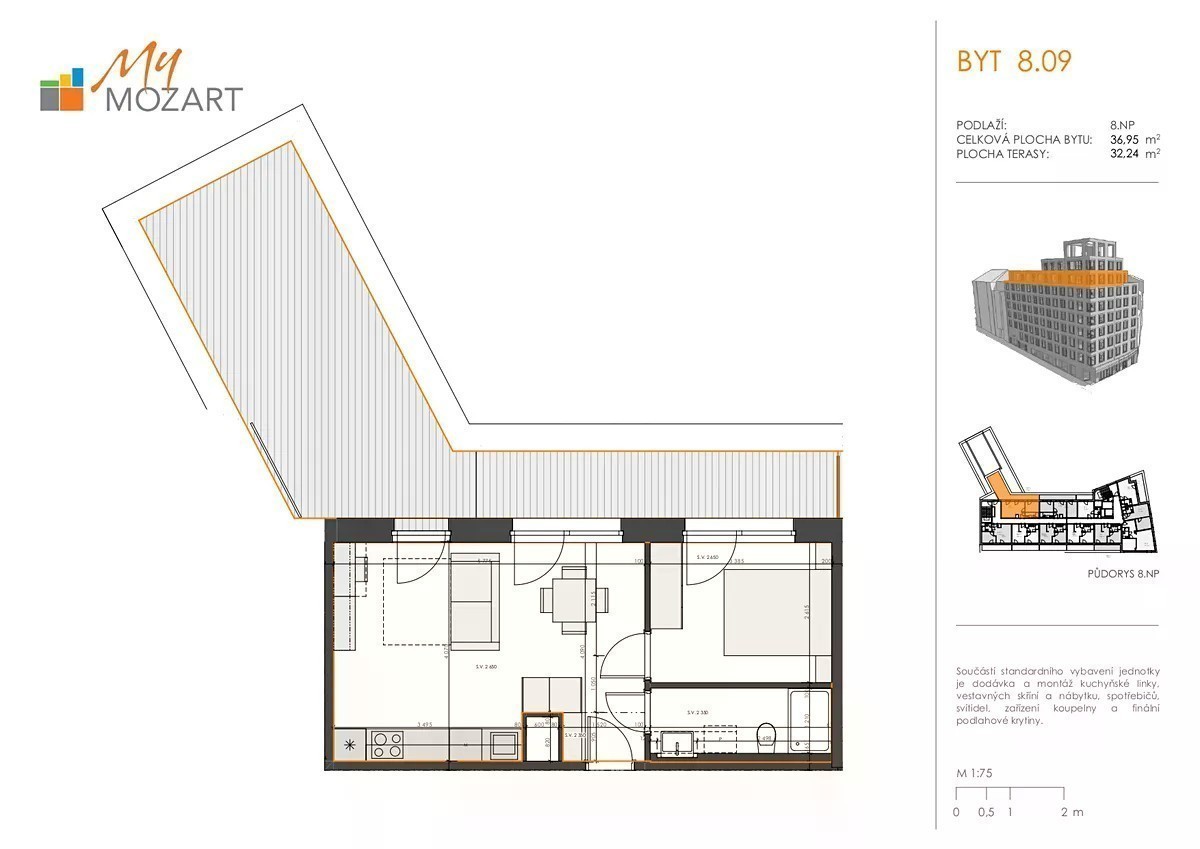 Představujeme Vám tento byt k pronájmu v srdci Prahy. Tento moderne vybavený byt 2+kk se nachází v cihlové novostavbě a je ideální volbou pro ty, kteří hledají komfortní městské bydlení. S užitnou plochou 40 m² nabízí prostornou terasu o velikosti 32 m², kde si můžete vychutnat nejen svůj ranní šálek kávy, ale i krásný výhled na město. Byt je umístěn v 8. patře, což zajišťuje dostatek přirozeného světla a jedinečný pohled na panorama Prahy. Kromě toho byt disponuje sklepem o rozloze 2 m², což poskytuje další úložné prostory. Součástí pronájmu je také parkovací místo, což je velkou výhodou v této lokalitě. Byt je vybaven klimatizací, rekuperací pro zajištění kvalitního vnitřního prostředí a recepcí, která přidává na exkluzivitě a pohodlí bydlení. V ceně nájmu, která činí 28 000 Kč měsíčně, nejsou zahrnuty poplatky ve výši 6 000 Kč. Byt bude k nastěhování od 1.12.2025, což Vám poskytuje dostatek času na plánování Vašeho přestěhování do tohoto moderního bydlení v osobním vlastnictví. Pokud Vás byt zaujal, neváhejte nám napsat nebo zavolat a rádi Vám vše ukážeme osobně. Prohlídky jsou možné po předchozí domluvě. Rádi Vám pomůžeme s veškerými dotazy a zařídíme vše potřebné.