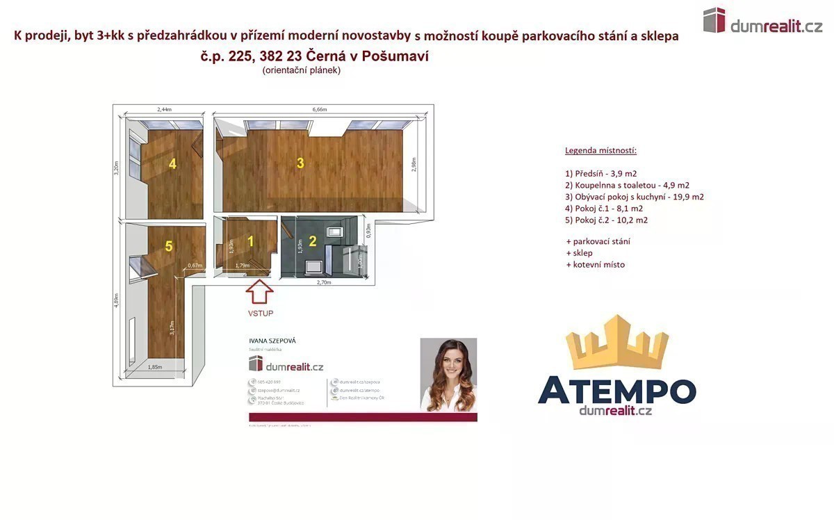 Naše společnost Vám zprostředkuje prodej bytové jednotky 3+kk s balkónem v moderní novostavbě, s parkovacím stáním a sklepem v obci Černá v Pošumaví, č.p. 225, u Lipenské vodní nádrže. Dispozice bytové jednotky naleznete na orientačním plánku mezi fotografiemi. Byt je situovaný na jižní a západní světovou stranu. Dostatek světla v bytě zajišťují posuvná francouzská okna s izolačními trojskly. Prodávaný byt o výměře 52,82 m² se nachází v zatepleném zděném bytovém domě s výtahem. Bytový dům byl zkolaudován v roce 2023. Dále je možno dokoupit kotevní místo za 250.000,-Kč. Vytápění zajišťuje tepelné čerpadlo napojené na podlahové topení. Bytový dům je napojen na elektřinu, veřejný vodovod a obecní kanalizaci. Úklid společných prostor zajišťuje úklidová služba. Veškerá občanská vybavenost (škola, mateřská školka, obchod, restaurace, pošta, autobusová zastávka) je v docházkové vzdálenosti. Byt se nachází přímo u Lipenské vodní nádrže - Malé Lipno a u cyklostezky. Okolí Lipenské vodní nádrže je známé tím, že se zde nachází zázemí pro letní i zimní sporty (sjezdovky, cyklostesky, stezka korunami stromů, bobová dráha, lanový park, atd.). Doporučuji osobní prohlídku, byt je po nainstalování kuchyňské linky připraven ihned k nastěhování. Více informací Vám poskytne makléřka Ivana Szepová z realitní kanceláře A TEMPO fungující pod ochrannou známkou naše společnost. Zajistíme Vám financování a veškerý právní servis. Ev. číslo: 652499.