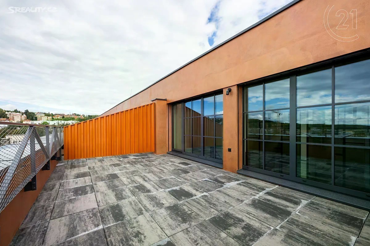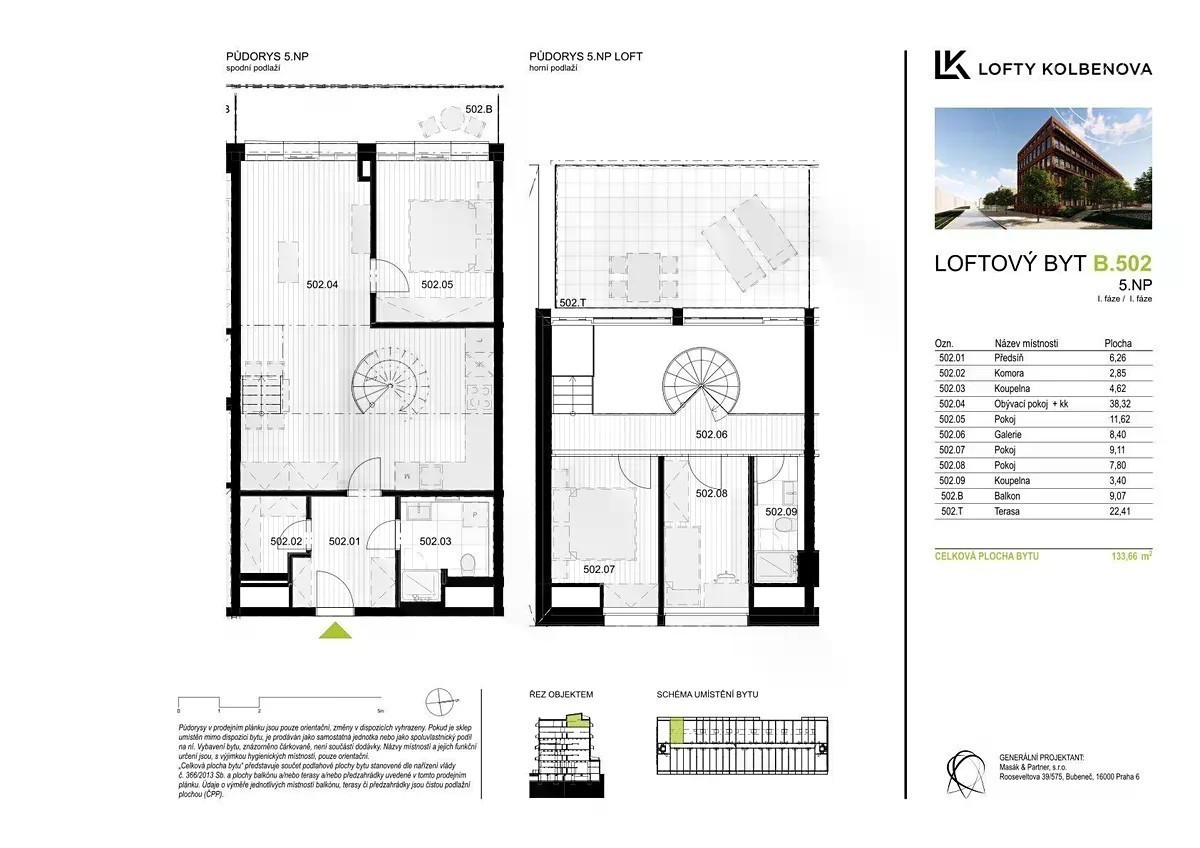 Pokud hledáte tuctový čtyřpokojový byt, není tahle nabídka pro vás. Tohle není běžný čtyřpokoják, ale stylový loft 4+kk v 5. nadzemním podlaží, s 9 m² velkým balkonem ve spodním patře bytu a velkorysou střešní terasou o velikosti 22 m² v horní části bytové jednotky, která má celkovou plochu 133 m². Ano, jedná se o střešní byt, do kterého svítí slunce i po příchodu z práce, a západ slunce můžete pozorovat během posezení na terase se sklenkou v ruce. Odteď už nejsou industriální lofty synonymem jen pro brooklynské Dumbo, teď je najdete i v Kolbenově ulici, v bývalé tovární budově pražské Kolbenky. Velká hala za vstupními dveřmi nabídne dostatek místa pro vestavěné skříně, a co se nevejde do nich, to budete moci uskladnit za dveřmi komory v levé části haly. Dveřmi napravo, před vstupem do hlavní obytné místnosti, se vchází do jedné ze dvou koupelen se sprchou a toaletou. Dominantním prvkem hlavní obytné místnosti je restaurované točité schodiště, za nímž je příprava na instalaci kuchyňské linky. Nejen z ní, ale i z vedlejšího pokoje je pak vstup na společný balkon. Po schodišti vystoupáte do klidové zóny bytové jednotky. Nalevo od schodiště je druhá koupelna, vedle ní třetí pokoj a pak ještě čtvrtý pokoj, ten úplně napravo. Z obou horních pokojů je výhled přes okna na terasu, na kterou vede pouhých pět schodů. Je trochu zvláštní psát o standardní výbavě nadstandardního bytu, ale zkusím stručně zmínit kvalitní dřevěné podlahy ve všech místnostech bytu vyjma koupelen, podlahové vytápění, klimatizační jednotky v obytných místnostech, rekuperaci, elektricky ovládané venkovní žaluzie, dále pak designové schodiště, prosklené stěny a požární bezpečnostní dveře. Při všem bohatém prosklení bytů má dům energetický štítek skupiny B dle nejnovější normy. V domě nenajdete recepci ani společný biliár či další služby, které by zbytečně zvyšovaly poplatky spojené s provozem bytu. K bytové jednotce je možné za příplatek objednat garážové stání a sklep. Industriální design, bohaté prosklení a terasa s ohromujícím výhledem jsou tím, co dělá tuto nabídku opravdu výjimečnou. Lofty Kolbenova jsou neoddiskutovatelnou dominantou nové rozvíjející se čtvrti. Skvělá dopravní dostupnost do centra hlavního města díky 300 m vzdálené zastávce metra nebo možnost cesty tramvají ze zastávky kousek od domu činí tuto nabídku ještě atraktivnější. Za 10 minut jste v centru, to je realita. Fotografie dokumentují stav bytu po dokončení. Ilustrační fotografie představují jednu z možností designového stylu vybavení bytu. Máte zájem o prohlídku nebo doplňující informace u skvělé kávy v kavárně přímo naproti domu? Zavolejte mi a domluvíme se.