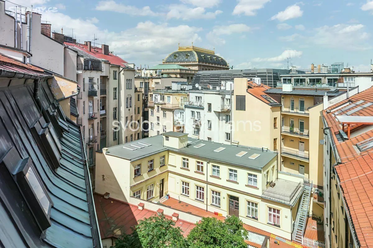 Klimatizovaný čtyřpokojový byt s balkónem a střešní terasou zaujímá celé 6. podlaží kompletně zrenovovaného historického domu se zachovanými původními architektonickými prvky a novým výtahem v klidné ulici v historickém centru Prahy, pár kroků od nábřeží Vltavy, Žofína a Národního divadla. Dispoziční uspořádání nabízí obývací pokoj s balkónem poskytujícím výhled do vnitrobloku a na střechu Národního divadla, dále průchozí pracovnu / společenskou místnost s jednou ložnicí po každé straně, koupelnu (vana, sprchový kout, toaleta), technickou místnost, samostatnou toaletu a prostornou vstupní halu. K bytu náleží střešní terasa. Světlý interiér působí díky vysokým stropům mimořádně vzdušně, okna jsou dřevěná, podlahy tvoří kvalitní parkety. Součástí vybavení je kuchyňská linka na míru a klimatizace. Vytápění zajišťuje vlastní plynový kotel. Bydlení v samotném srdci města, na dohled od Národního divadla, přináší pestrý výběr kaváren, bister, restaurací, obchodů, butiků i nákupních center. Atmosféru doplňuje bohatý společenský a kulturní život. K odpočinku poslouží klidné prostředí nedalekého parku na Střeleckém ostrově nebo rozlehlé Petřínské sady na opačném břehu Vltavy. Pohodlné spojení po celé Praze zajišťují tramvajové linky i stanice metra Národní třída a Karlovo náměstí. Jednota je aktuálně pronajata za obvyklé tržní nájemné. Podlahová plocha 120,4 m2, terasa 55 m2, balkón 2,7 m2.