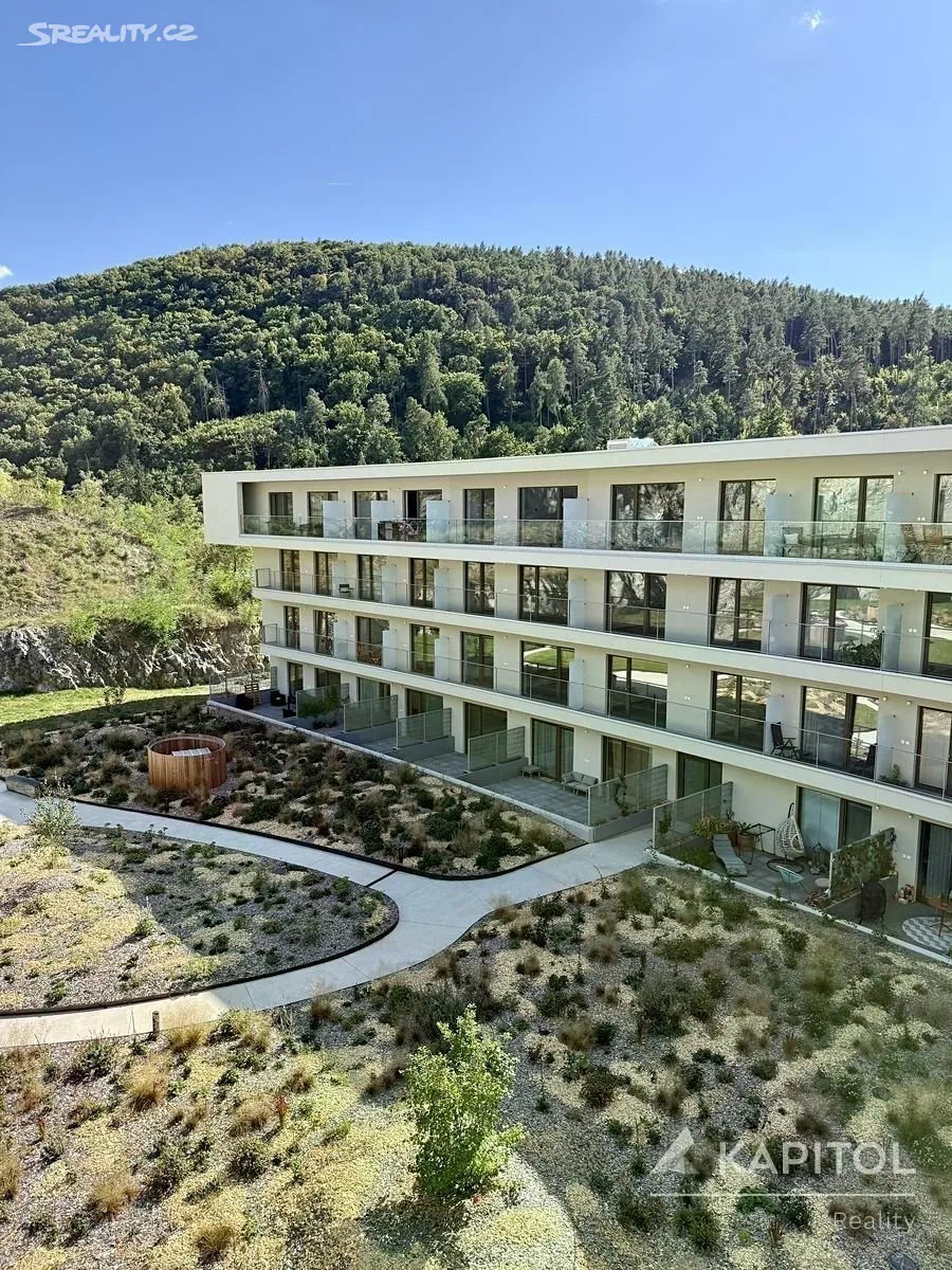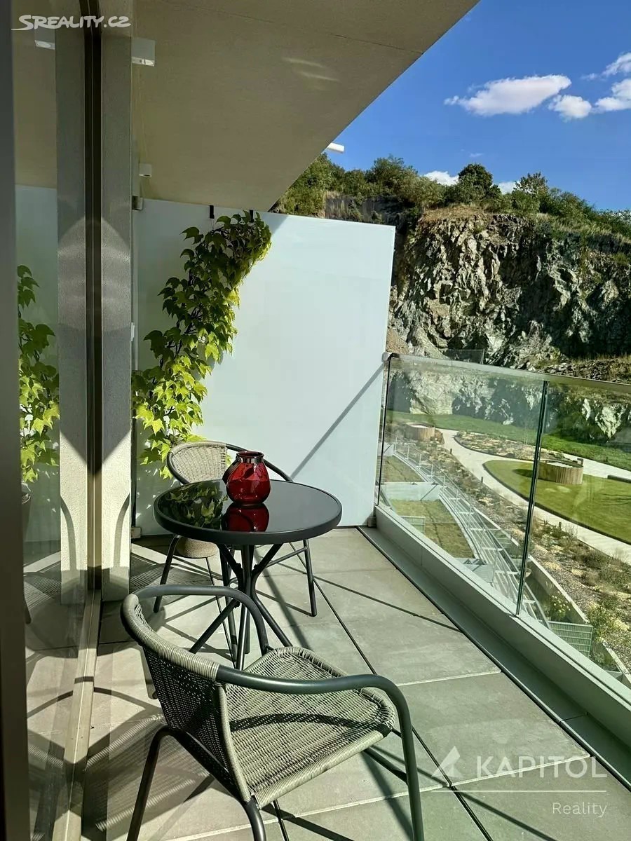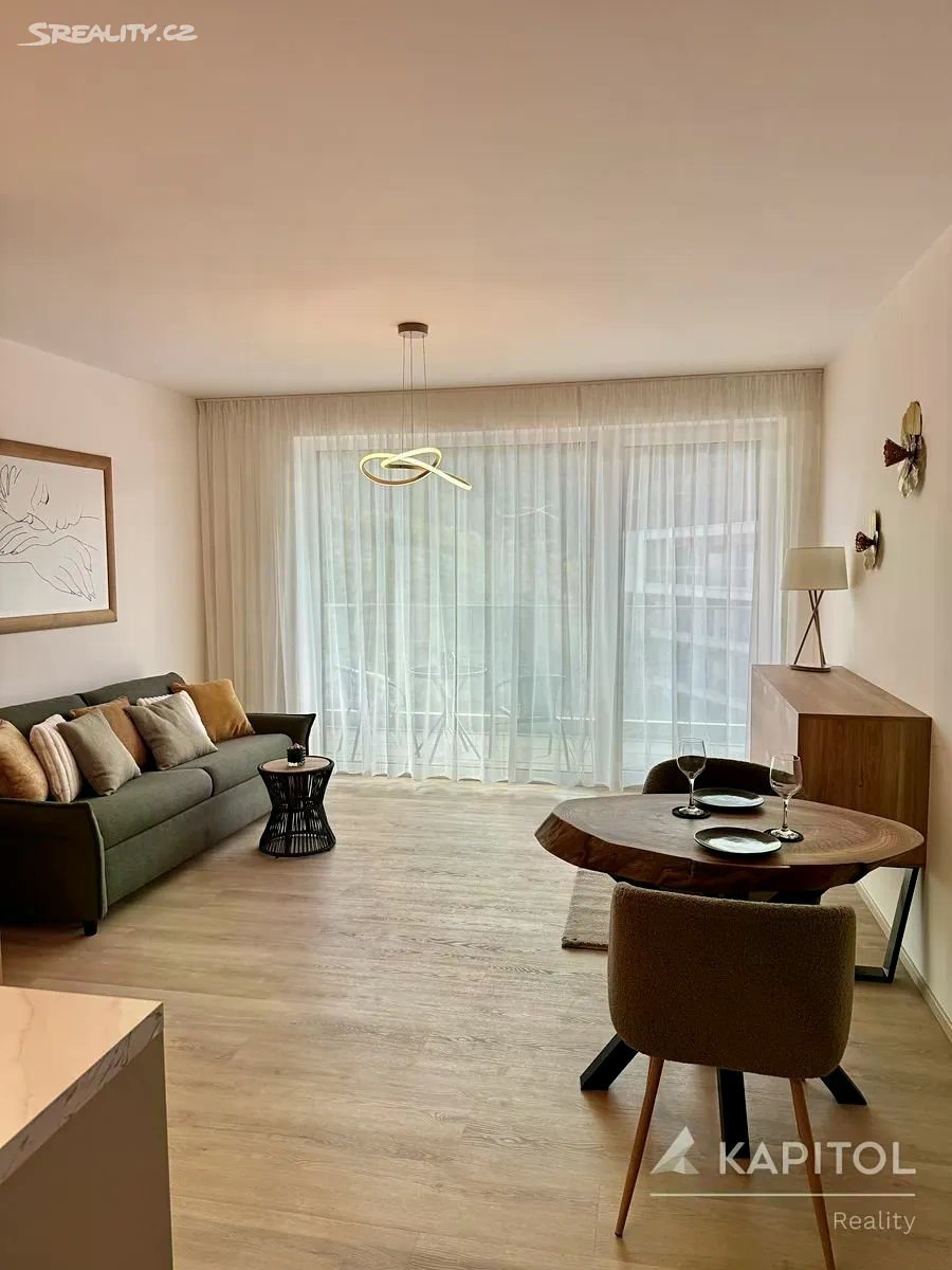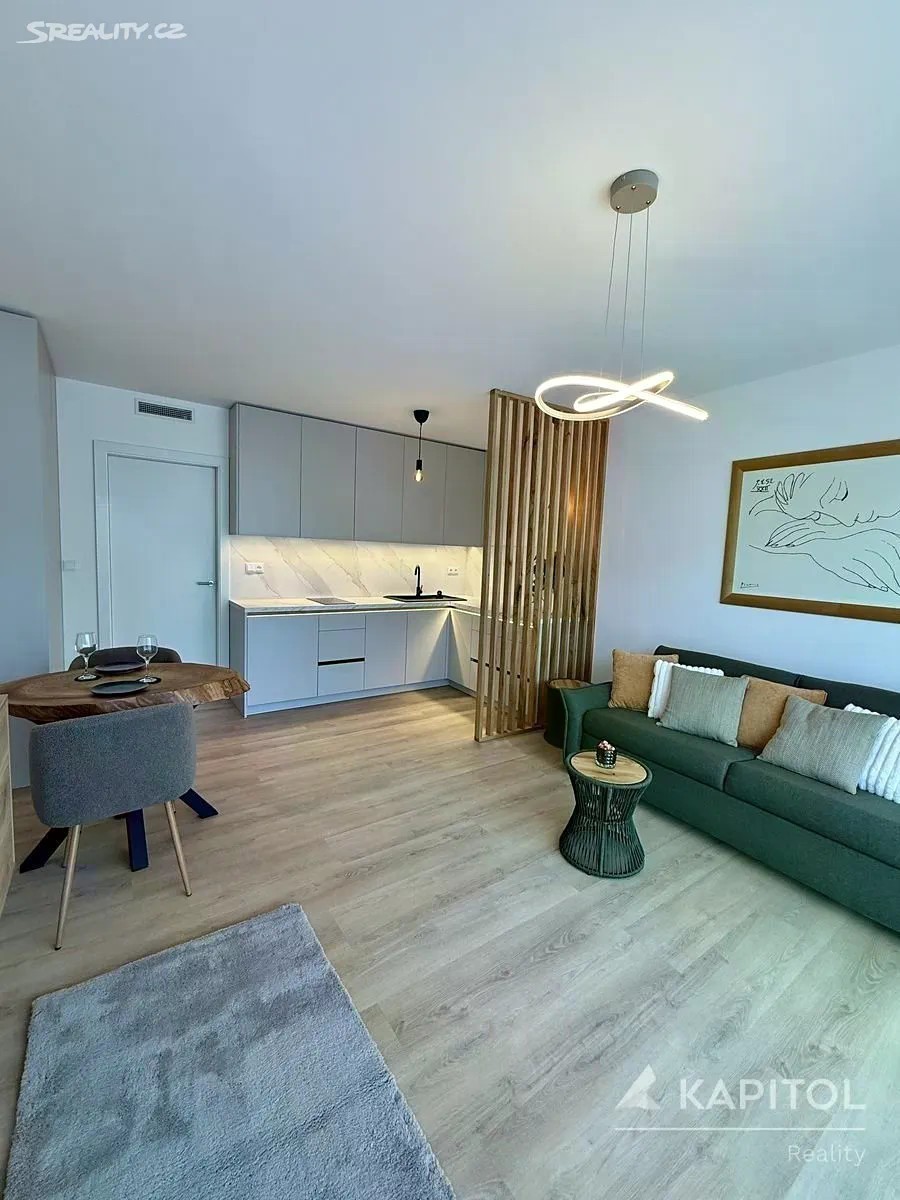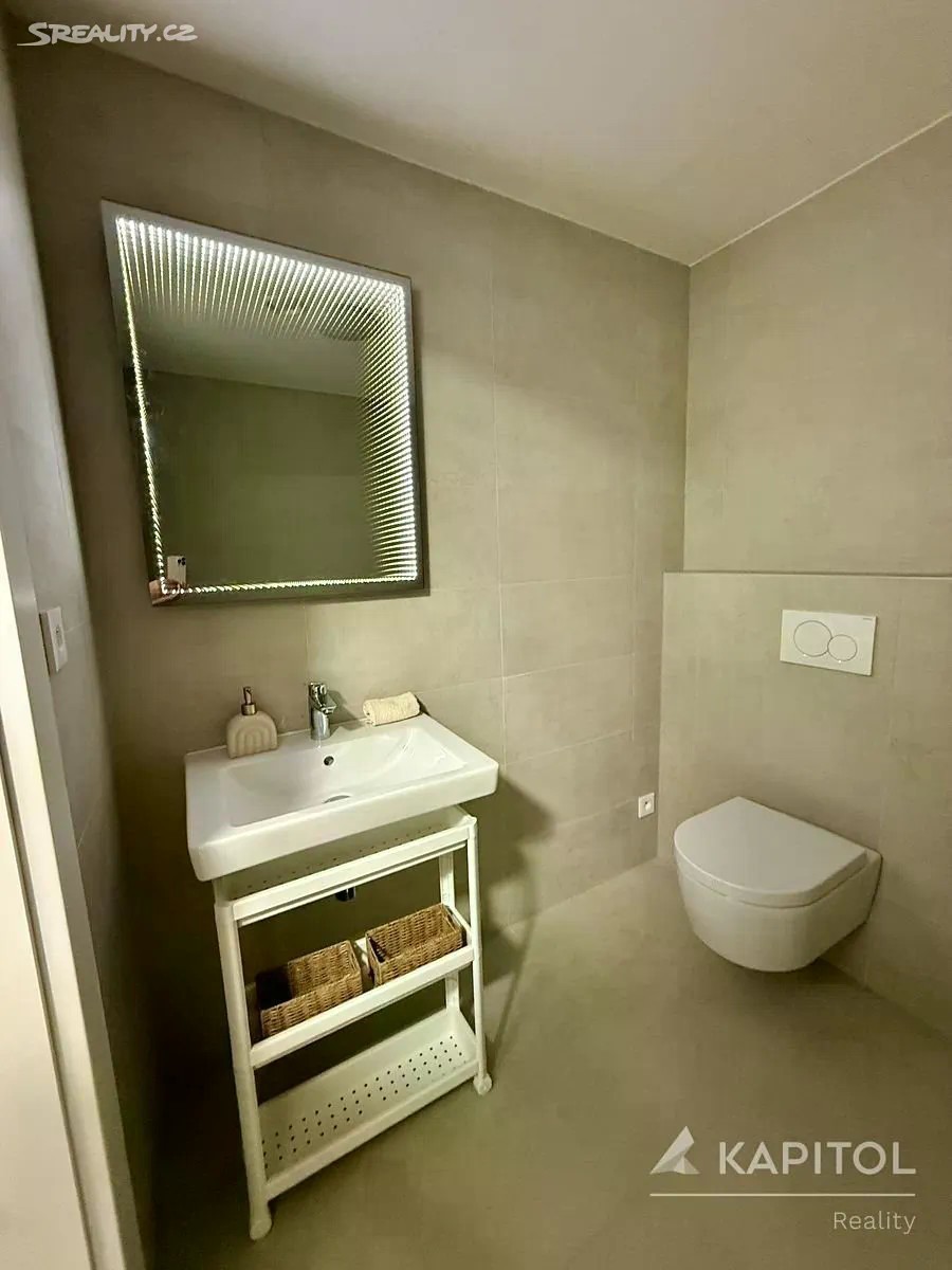 Ve 4. patře novostavby rezidence Diorit v Brně-Komíně čeká na nové nájemce útulný a prosluněný zařízený byt 1+kk, který nabízí moderní bydlení obklopené zelení. Budova stojí mezi vzrostlými stromy, pod domem protéká řeka Svratka a z prostorné lodžie se otevírá výhled do přírody. Dispozice bytu: - předsíň 4 m² s vestavěnou skříní a úložným prostorem - koupelna s toaletou 4 m², vybavená moderními obklady a sprchovým koutem - obytný prostor s kuchyní a jídelní částí 22,5 m² - s kuchyňskou linkou na míru, myčkou a lednicí, doplněný nábytkem a rozkládací sedací soupravou vhodnou i pro každodenní spaní - lodžie 6 m² s proskleným zábradlím, ideální pro ranní kávu nebo večerní odpočinek - sklep 2 m² - parkovací stání v garáži Byt je laděn v elegantním a čistém designu, vytvářející útulnou atmosféru, která působí harmonicky a nadčasově. Součástí bytu je moderní systém rekuperace, který zajišťuje stálý přísun čerstvého vzduchu a zároveň šetří energie. Byt řízen systémem inteligentní domácnosti zn. Loxone. Pohodlný život zajistí komplexní občanská vybavenost v okolí. Přímo před domem se nachází zastávka HMD, odkud se rychle dostanete do centra. V bezprostřední blízkosti domu se nachází cyklostezka a stezky pro pěší kolem řeky Svratky nebo v oboře Holedná. Nedaleko se rozprostírá Brněnská přehrada, ZOO, sportovní letiště a další. Lokalita tak nabízí ideální kombinaci městského bydlení a klidu přírody. Další výhody: parkovací místo přímo v domě přístup na čip výtah kolárna pravidelný úklid společných prostor a profesionální péče o okolní zeleň Energetická náročnost budovy ve třídě A. Rezidence Diorit přináší moderní bydlení s ekologickým vytápěním, rekuperací i chytrými technologiemi - vše s důrazem na komfort a nízké náklady. Byt je volný k okamžitému nastěhování.