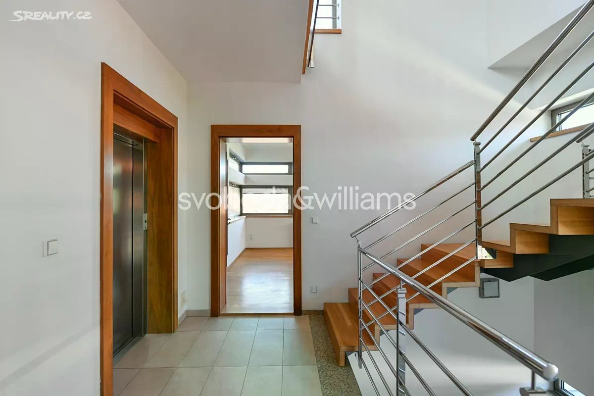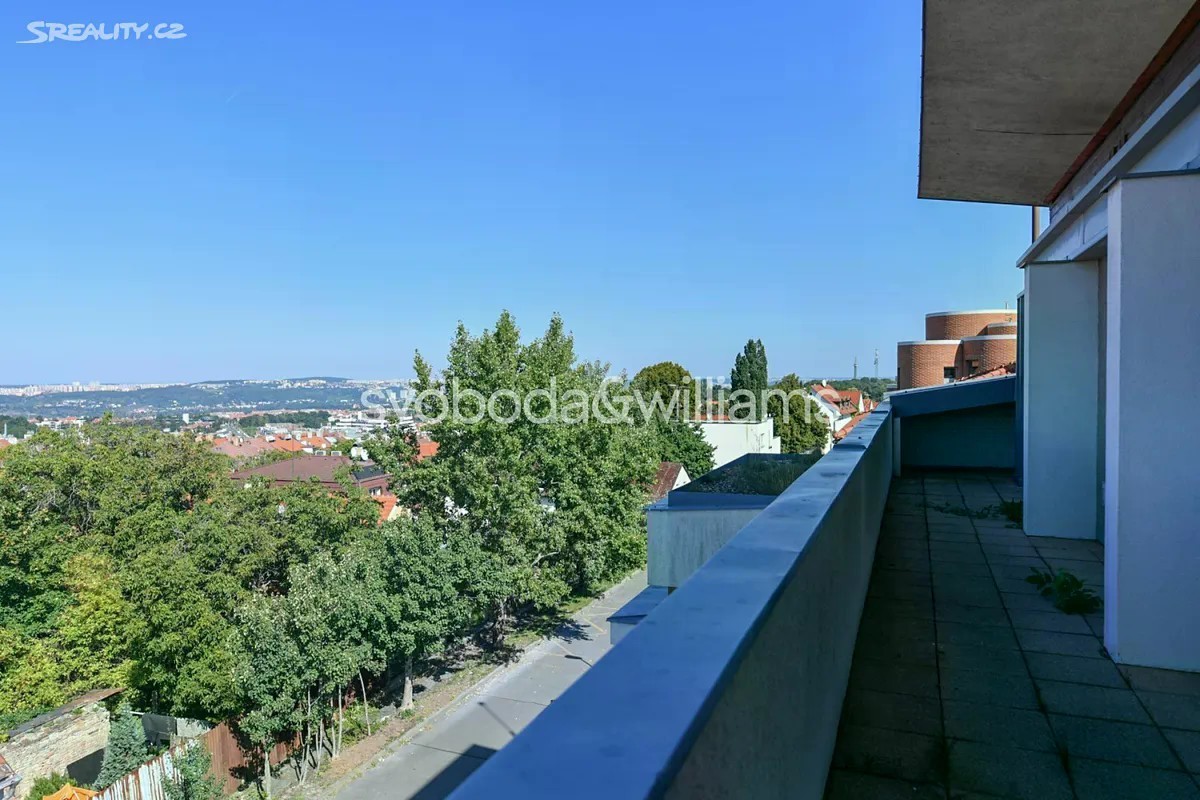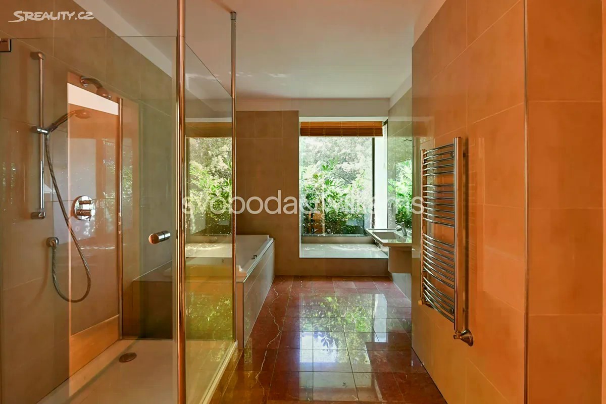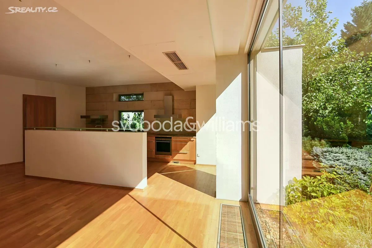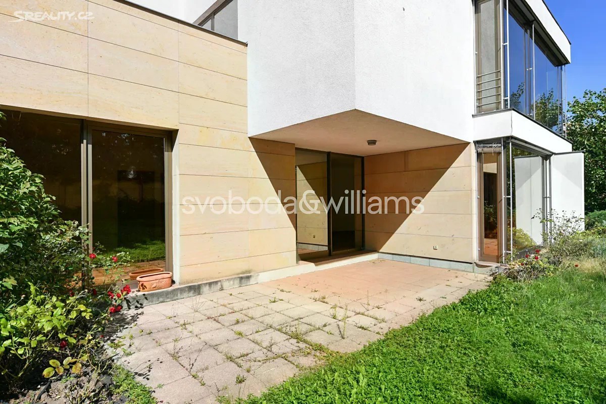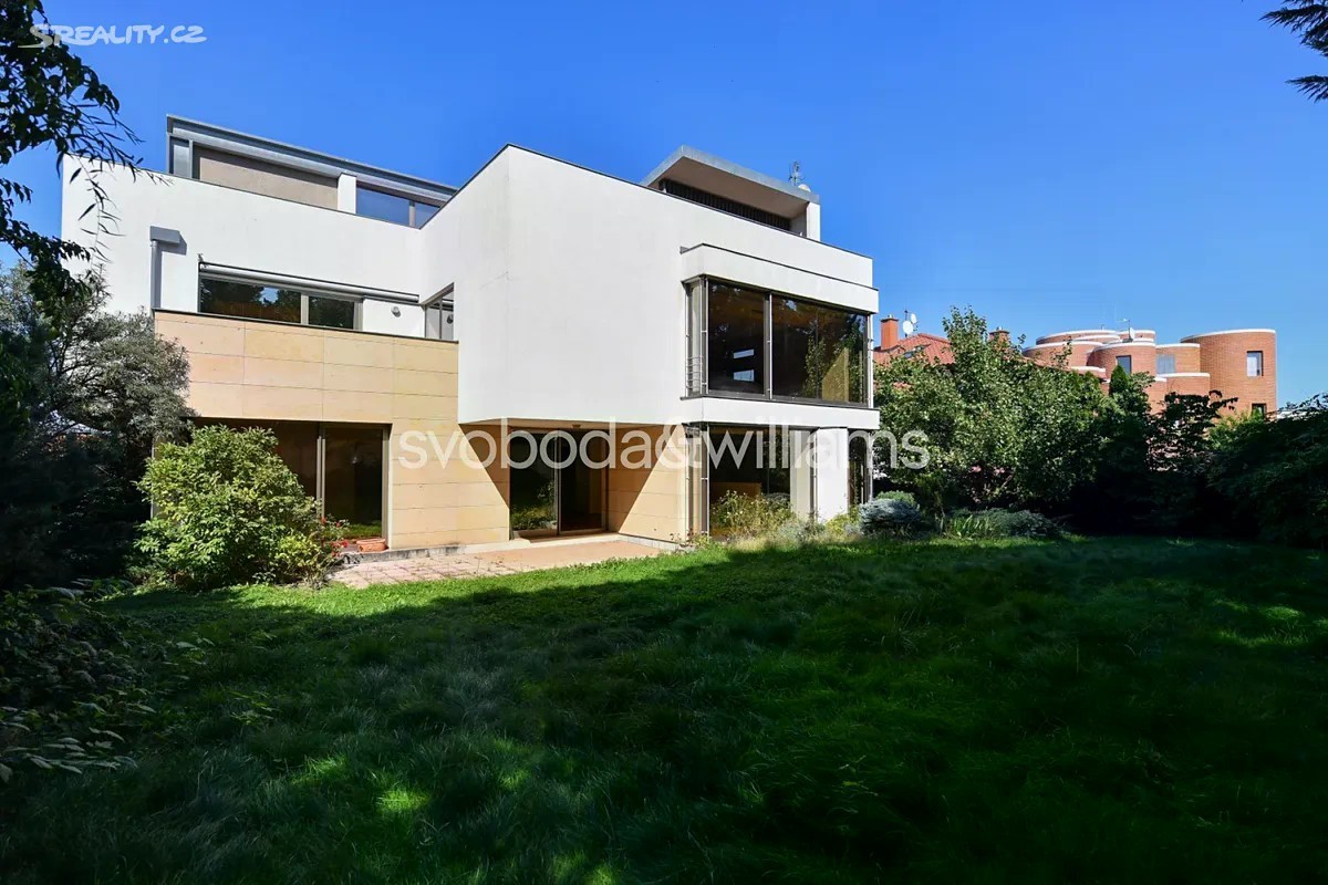Bezbariérová vila s nerušenými výhledy do širokého okolí a s možností vícegeneračního bydlení stojí obklopena upravenou zahradou v jedné z nejatraktivnějších vilových čtvrtí v Praze na Břevnově, nedaleko parku Ladronka nebo Pražského hradu, v rychlém dosahu centra i letiště. Interiér se rozkládá ve 4 úrovních, které jsou kromě schodiště propojeny pro pohodlí obyvatel též hydraulickým výtahem. Přízemí je vyhrazeno pro šatnu, prádelnu, posilovnu s přípravou na saunu, kotelnu, sklady, zádveří, strojovnu výtahu a garáž, odkud se lze k výtahu či schodišti dostat "suchou nohou". V 1. patře se nachází 180metrový byt 4+kk. Dispoziční řešení poskytuje obývací pokoj s jídelnou, kuchyní a vstupem na zahradní terasu, spíž, pokoj pro hosty s kuchyňkou a koupelnou, 2 ložnice s vlastními koupelnami a sdílenou šatnou. Ve 2. patře je umístěn byt se 190 m2 o dispozici 4+kk, tvořený obývacím pokojem s kuchyní a jídelnou, spíží, ložnicí s koupelnou, dalšími 2 ložnicemi se šatnami, koupelnou s WC, východně orientovaným balkonkem a jižní terasou. Na společné podestě je komora s toaletou. V nejvyšší úrovni je samostatný apartmán s ložnicí, kuchyňským koutem a koupelnou s WC. Apartmán lze využívat jako samostatnou garsoniéru nebo jako společenský prostor se zázemím pro hosty. Téměř po celém jeho obvodu se rozkládá velká střešní terasa s pěknými výhledy. Vila navržena Ing. arch. Radkem Martiškem byla zkolaudována v r. 2005, nyní je vhodná k renovaci. Stavba má pískovcový obklad a sokl obložen opukou, velkoplošná hliníková okna mají izolační dvojskla a žaluzie. Podlahy jsou dřevěné, schodiště je obložené leštěnou žulou, do podkroví vedou schody dřevěné. Součástí vybavení jsou také dýhované interiérové dveře, plně vybavené kuchyně, masážní vany, 3 klimatizační jednotky, domovní videotelefon, TV signál, EZS nebo centrální vysavač. Centrální vytápění je zajištěno plynovými kotli, parkování v garáži pro 5 vozů, která je přímo propojena s domem. Zahrada udržovaná automatickým závlahovým systémem je osázena ovocnými a okrasnými porosty. K bytu v 1. patře lze vybudovat bazén. Místo poskytuje úžasný klid, dostatek zeleně i pohodlný přístup ke všem službám. V pěším dosahu fungují 2 mezinárodní mateřské školy nebo soukromá základní škola Cesta k úspěchu, blízko je do restaurací, kaváren, obchodů i k lékařským službám. Jen pár kroků je vzdálen park Ladronka, dojít je možné i na Petřín nebo k Pražskému hradu. Autem se lze rychle dostat na letiště i do tunelového komplexu, při využití MHD je výhodou blízkost autobusové zastávky se spoji ke stanici metra Petřiny nebo Anděl. Užitná plocha 717 m2, zastavěná plocha 229 m2, zahrada 588 m2, pozemek 811 m2.