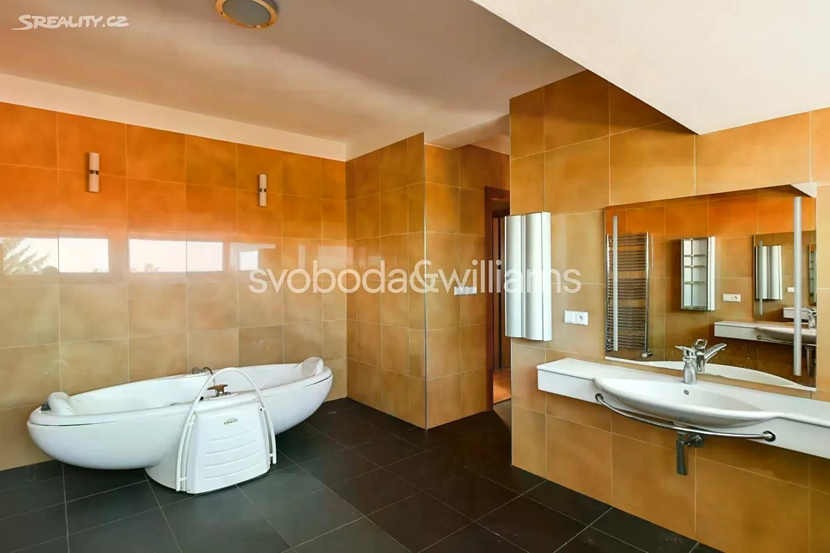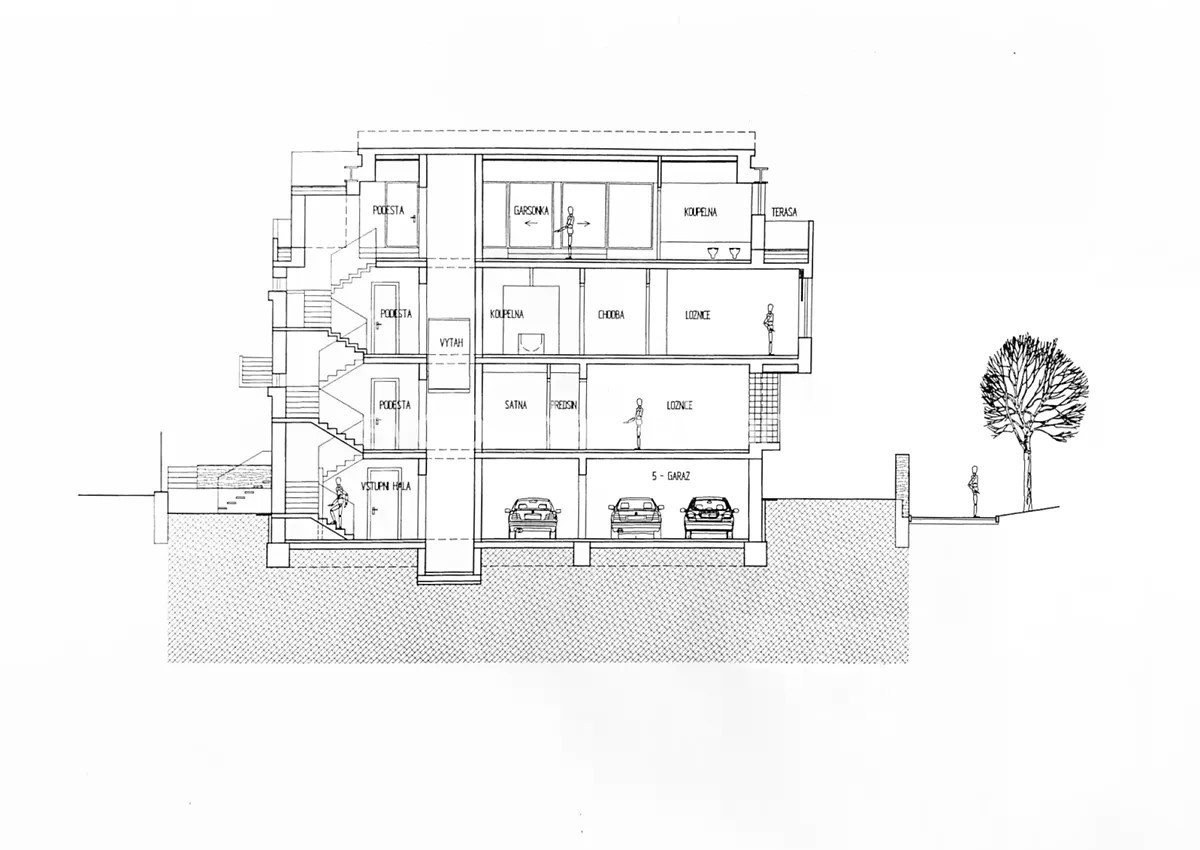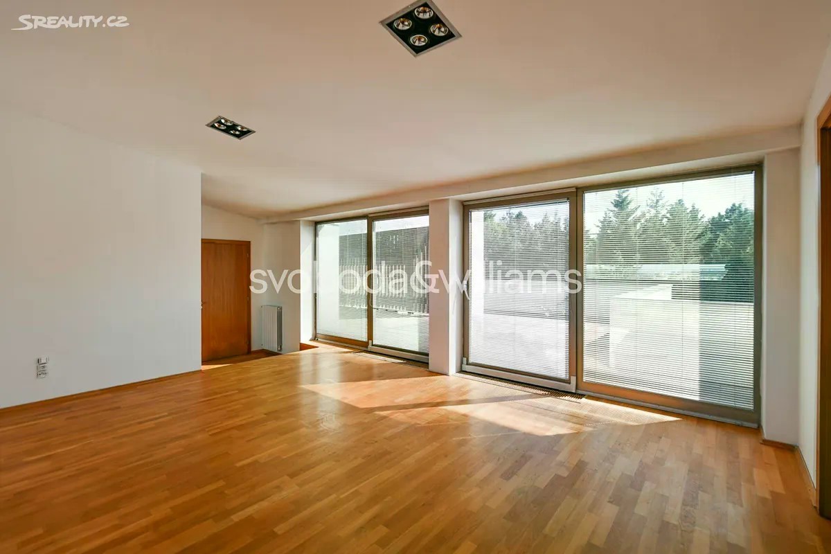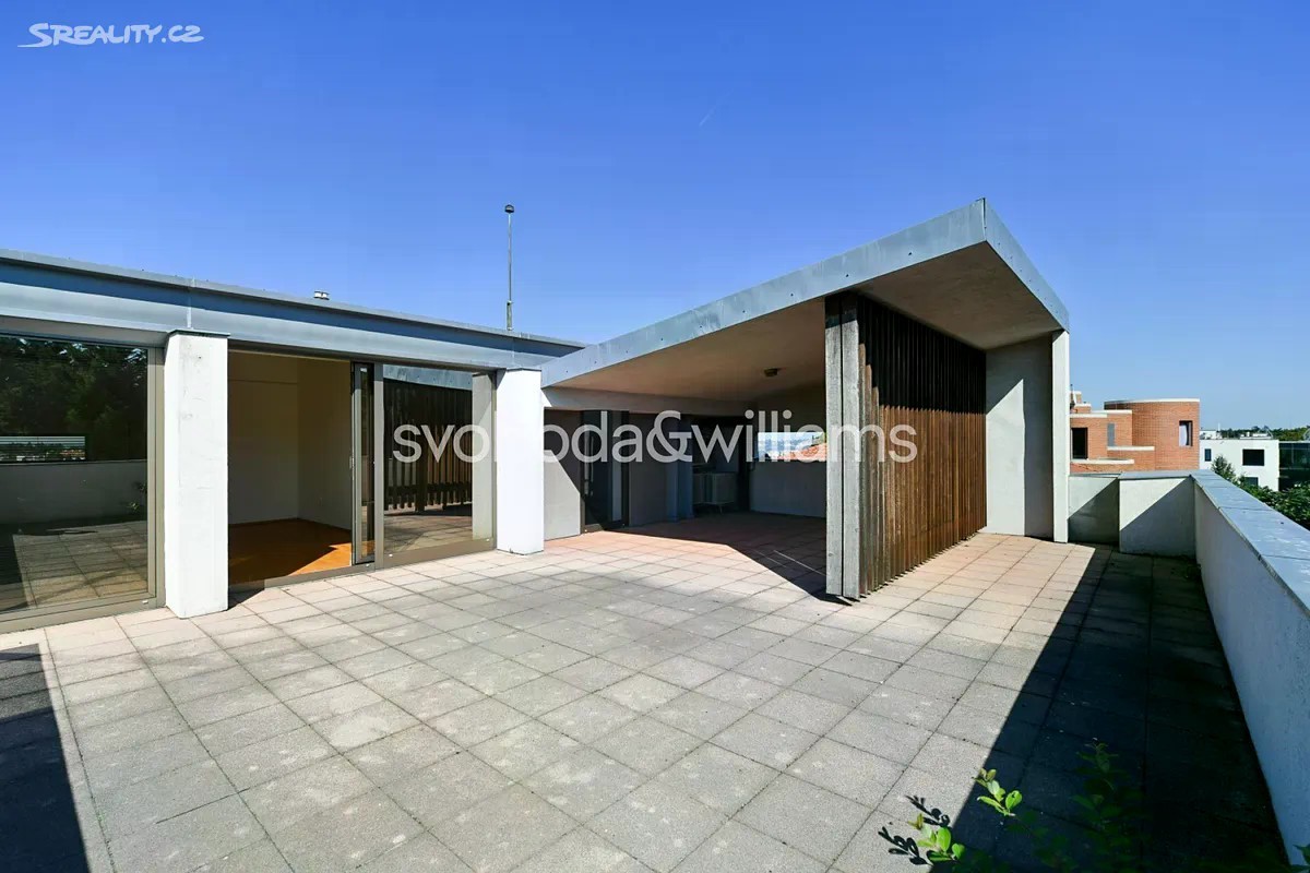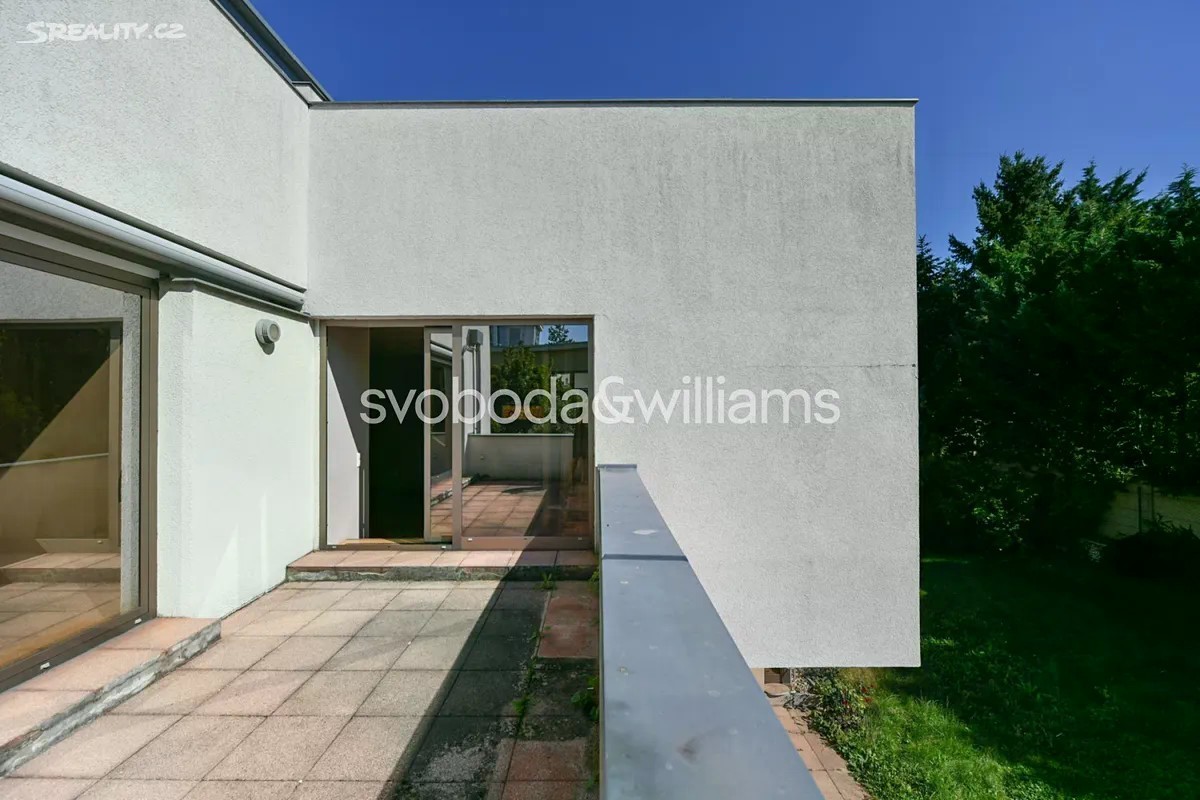 Bezbariérová vila s nerušenými výhledy do širokého okolí a s možností vícegeneračního bydlení stojí obklopena upravenou zahradou v jedné z nejatraktivnějších vilových čtvrtí v Praze na Břevnově, nedaleko parku Ladronka nebo Pražského hradu, v rychlém dosahu centra i letiště. Interiér se rozkládá ve 4 úrovních, které jsou kromě schodiště propojeny pro pohodlí obyvatel též hydraulickým výtahem. Přízemí je vyhrazeno pro šatnu, prádelnu, posilovnu s přípravou na saunu, kotelnu, sklady, zádveří, strojovnu výtahu a garáž, odkud se lze k výtahu či schodišti dostat "suchou nohou". V 1. patře se nachází 180metrový byt 4+kk. Dispoziční řešení poskytuje obývací pokoj s jídelnou, kuchyní a vstupem na zahradní terasu, spíž, pokoj pro hosty s kuchyňkou a koupelnou, 2 ložnice s vlastními koupelnami a sdílenou šatnou. Ve 2. patře je umístěn byt se 190 m2 o dispozici 4+kk, tvořený obývacím pokojem s kuchyní a jídelnou, spíží, ložnicí s koupelnou, dalšími 2 ložnicemi se šatnami, koupelnou s WC, východně orientovaným balkonkem a jižní terasou. Na společné podestě je komora s toaletou. V nejvyšší úrovni je samostatný apartmán s ložnicí, kuchyňským koutem a koupelnou s WC. Apartmán lze využívat jako samostatnou garsoniéru nebo jako společenský prostor se zázemím pro hosty. Téměř po celém jeho obvodu se rozkládá velká střešní terasa s pěknými výhledy. Vila navržena Ing. arch. Radkem Martiškem byla zkolaudována v r. 2005, nyní je vhodná k renovaci. Stavba má pískovcový obklad a sokl obložen opukou, velkoplošná hliníková okna mají izolační dvojskla a žaluzie. Podlahy jsou dřevěné, schodiště je obložené leštěnou žulou, do podkroví vedou schody dřevěné. Součástí vybavení jsou také dýhované interiérové dveře, plně vybavené kuchyně, masážní vany, 3 klimatizační jednotky, domovní videotelefon, TV signál, EZS nebo centrální vysavač. Centrální vytápění je zajištěno plynovými kotli, parkování v garáži pro 5 vozů, která je přímo propojena s domem. Zahrada udržovaná automatickým závlahovým systémem je osázena ovocnými a okrasnými porosty. K bytu v 1. patře lze vybudovat bazén. Místo poskytuje úžasný klid, dostatek zeleně i pohodlný přístup ke všem službám. V pěším dosahu fungují 2 mezinárodní mateřské školy nebo soukromá základní škola Cesta k úspěchu, blízko je do restaurací, kaváren, obchodů i k lékařským službám. Jen pár kroků je vzdálen park Ladronka, dojít je možné i na Petřín nebo k Pražskému hradu. Autem se lze rychle dostat na letiště i do tunelového komplexu, při využití MHD je výhodou blízkost autobusové zastávky se spoji ke stanici metra Petřiny nebo Anděl. Užitná plocha 717 m2, zastavěná plocha 229 m2, zahrada 588 m2, pozemek 811 m2.