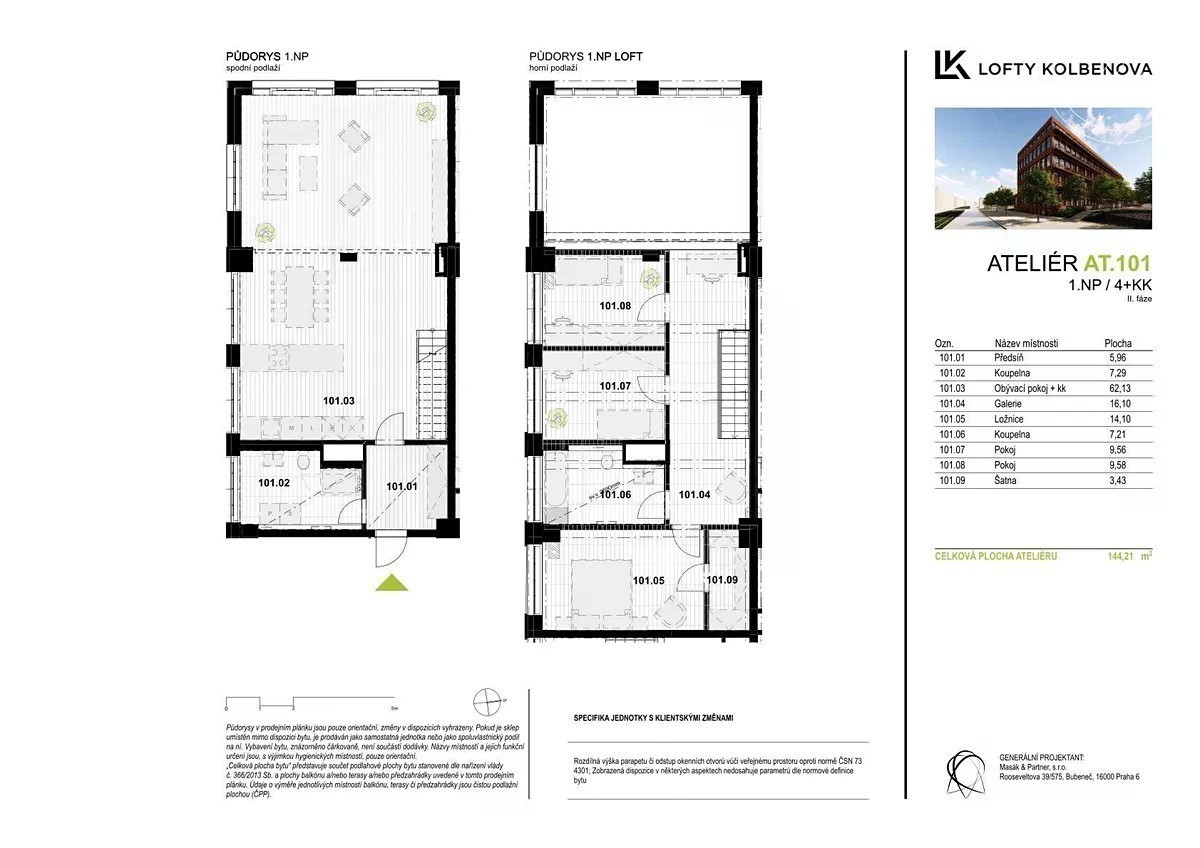Hledáte jedinečnou, světlou a vzdušnou kancelář pro Vaši firmu? Nebo chcete zazářit před svými klienty? V tom případě nabízíme k prodeji tento ateliér s dispozicí 4+kk o celkové výměře 144,21 m2. Jde o zcela jedinečnou dispozici velkého ateliéru s velkými okny v každé místnosti a prostorností danou loftovým řešením. Tento ateliér je vhodný pro firemní využití, nachází se v 1. patře budovy hned vedle schodiště a výtahu. Ateliér je vybaven rekuperací vzduchu, klimatizacemi a předokenními elektro žaluziemi. Teplo zajišťuje podlahové topení. Je zde použita vícevrstvá dřevěná podlaha bělený dub. Vysoké industriální stropy a velká okna s ohromujícím výhledem ve Vás vyvolají pocit výjimečnosti. Skvělá dopravní dostupnost a blízkost centru hlavního města činí tento byt ještě atraktivnější. Přímo naproti je komplex Pragovka, nabízející jak kulturní, sportovní tak kulinářské vyžití. Skoro za rohem se nacházejí obchodní centra jako Fénix a Galerie Harfa. Pro fanoušky sportovních zápasů a velkých koncertů ideální bydlení v blízkosti O2 arény a zároveň blízkosti přírody jako Klíčovské sady. Jedná se o již nově dostavěný developerský projekt Lofty Kolbenova. Pro více informací o objektu a jiných dispozic bytů/ateliérů mě prosím kontaktujte.