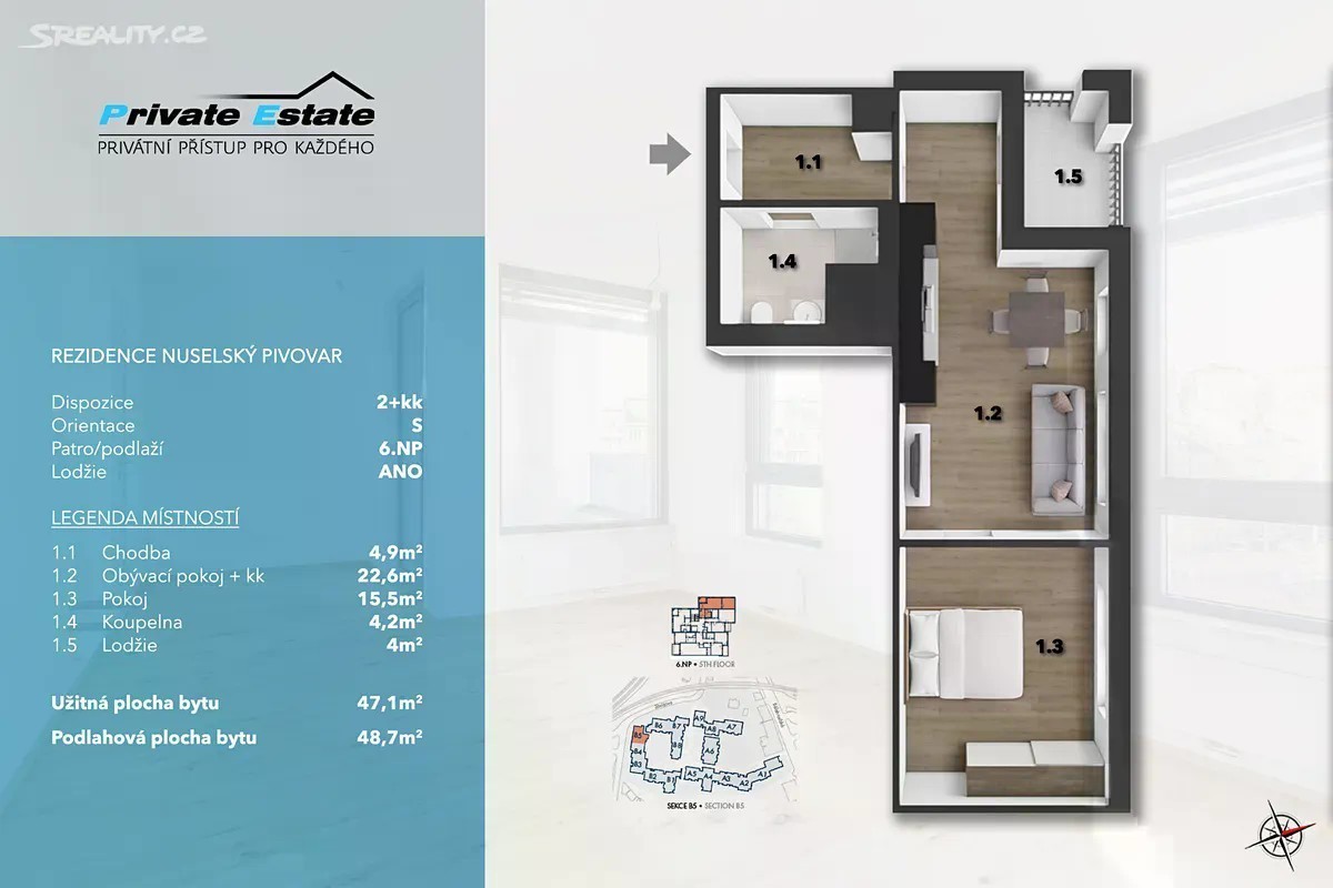 ! Možnost odpočtu DPH ! Pokud hledáte historii propojenou s moderním bydlením, pak jste tu správně! Nabízím k prodeji čerstvě zkolaudovaný byt o dispozici 2+kk s lodžií (4 m2) v 6. nadzemním podlaží budovy Rezidence Nuselský pivovar. Byt disponuje vstupní chodbou (4,9m2) s prostorem pro vestavěnou skříň, následuje vstup do obývacího pokoje a nebo koupelny. Koupelna nabízí podlahové vytápění, sprchovou zástěnu s podomítkovou baterií, WC s bidetovou sprškou, topný žebřík a přípravu pro připojení pračky a sušičky. V obývacím pokoji (22,6m2) najdete přípravu pro kuchyňskou linku, je zde také vstup na lodžii (4m2) a dále se vchází do ložnice (15,5m2). Byt je v provedení Premium (EURO okna - trojskla, předokenní elektrické žaluzie, bezfalcové 2100mm vysoké interiérové dveře, lepená dřevěná podlaha, podlahové vytápění v koupelně a mnoho dalšího). K bytu náleží prostorná betonová sklepní kóje o výměře 4,2m2 a také garážové stání. Cena garážového stání je 800.000,-Kč a je podmínkou pro koupi bytu. Energetický štítek (PENB) je “B” - velmi úsporný. Zálohové měsíční platby činí 3.750,-Kč. Rezidence Nuselský pivovar je nově zrevitalizovaná čtvrť s bohatou historií, jednotlivé domy propojuje vnitroblok plný zeleně a relaxačních zón. Rezidence se nachází na hranici Vinohrad a Nuslí, nedaleko parku Folimanka a Grébovka a v blízkosti skvělých restaurací, kaváren či bister. V okolí je veškerá občanská vybavenost, MHD je minutu od domu. Pro více informací či při zájmu o prohlídku mě neváhejte kontaktovat.