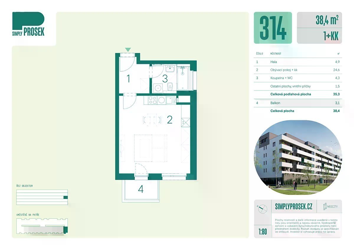 Exkluzivní nabídka bytů 1+kk přímo od developera v nově vznikajícím projektu Simply Prosek. Byt č 314, 1+kk o předpokládané podlahově ploše 35,3 m2 s balkonem o velikosti 3,1 m2 se bude nacházet ve třetím podlaží domu na adrese Bohušovická. V bytě budou použité nadstandardní materiály: vinylová podlaha, bezfalcové interiérové dveře, bezpečností vstupní dveře, v koupelně zařizovací předměty Ideal standard. V bytě bude rekuperace. V rámci volitelného nadstandardu si můžete dokoupit předokenní elektrické žaluzie, videotelefon. Na střeše budou umístěny fotovoltaické panely. Vyrobená elektřina se bude využívat na spotřebu společných částí domu. Energetická náročnost domu "A". V ceně není zahrnutý sklep, který si můžete dokoupit. Cena sklepa je od 175 000 Kč v závislosti na velikosti. Sklepy budou umístěné v prvním a druhém podzemním podlaží. Splátkový kalendáře je rozdělený do dvou plateb 15 % a 85 %. První splátka ve výši 15 % je splatná po podpisu Smlouvy o smlouvě budoucí. Doplatek 85 % pak po kolaudaci.