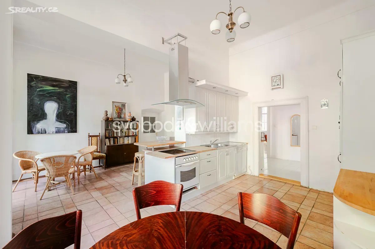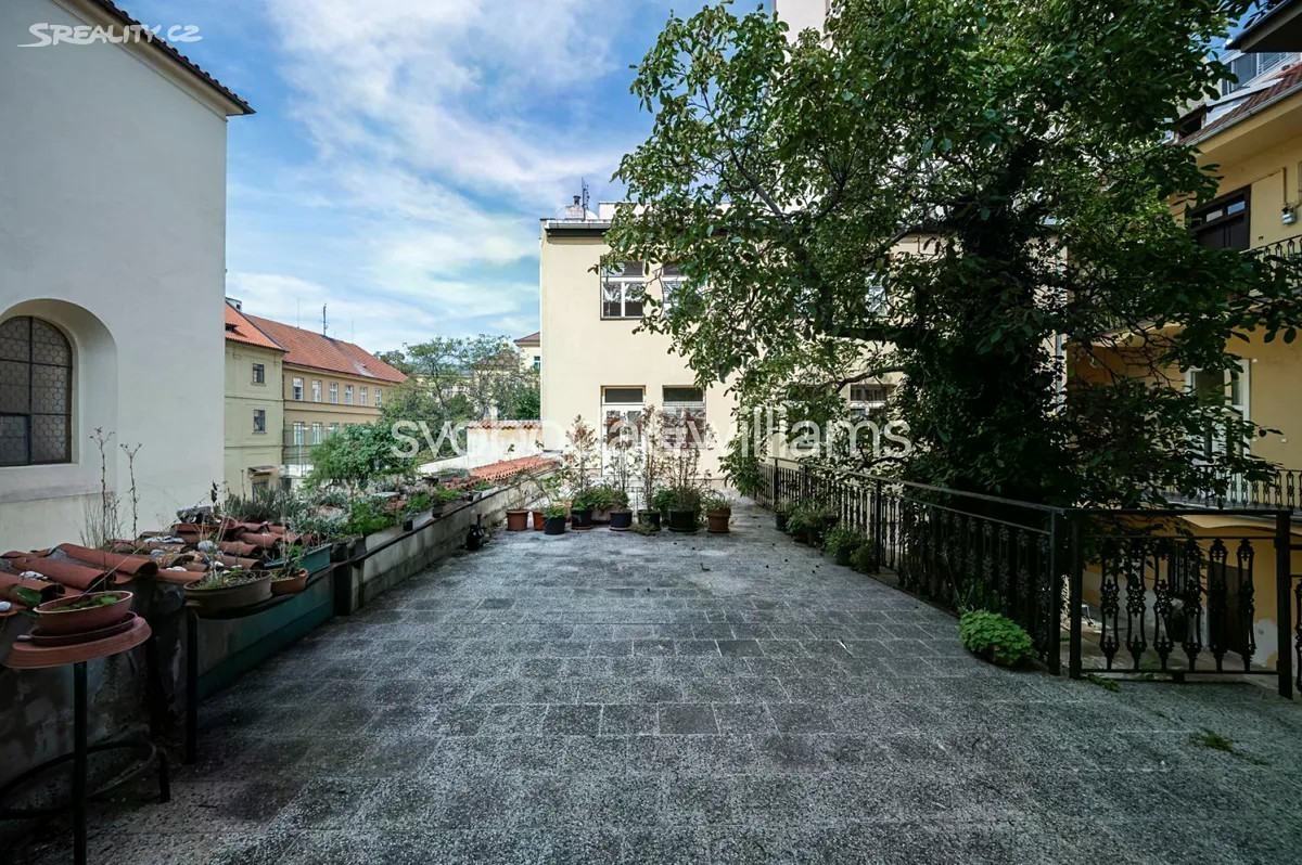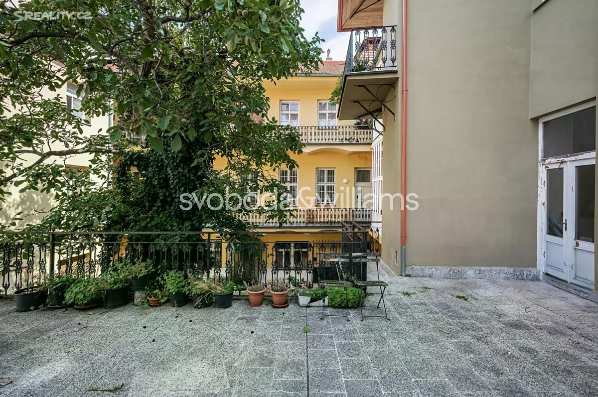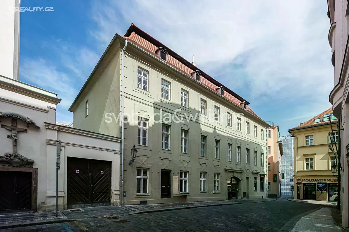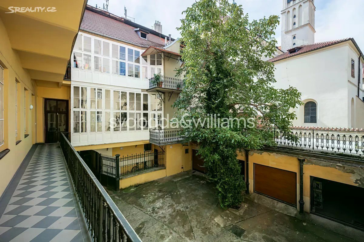Prostorný byt s vysokými stropy, terasou a výhledem na barokní kostel sv. Jakuba Většího je součástí památkově chráněného historického pavlačového domu, který stojí přímo v centru Prahy na rozhraní Starého a Nového Města, blízko náměstí Republiky i Staroměstského náměstí. Plochu bytu umístěného ve 2. podlaží tvoří obývací pokoj, velká kuchyně se vstupem na terasu, ložnice, koupelna, samostatná toaleta, komora a předsíň. K bytu dále náleží pokoj, který původně tvořil součást bytu, byl však stavebně oddělen a upraven na garsoniéru s koupelnou, kuchyňkou a vlastním vstupem. Posloužit může jako bydlení pro hosty, dospívající děti či k pronájmu. Pokoje jsou orientované na jih do jednosměrné ulice, kuchyně s terasou na sever do klidného vnitrobloku. Okna jsou dřevěná špaletová, podlahy parketové nebo prkenné, dveře masivní dvoukřídlé, v kuchyni a koupelně je elektrické podlahové vytápění. Předsíň zdobí vitrážová okna směřující na pavlač, vstup do budovy je na čip. Původně gotický dům, který byl koncem 18. století klasicistně přestavěn, má novou fasádu. V bezprostředním okolí je k dispozici veškerá občanská vybavenost, jen pár kroků vede do obchodního domu Kotva a nákupního centra Palladium, široká je nabídka restaurací, klubů, kin i divadel. Skvělou dostupnost zajišťuje metro linky B a četné tramvajové linky, blízko je i Masarykovo nádraží. Podlahová plocha 169,5 m², terasa 12 m2.