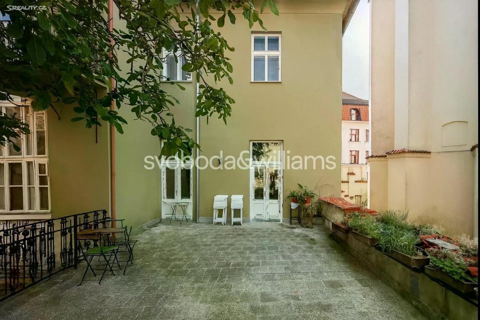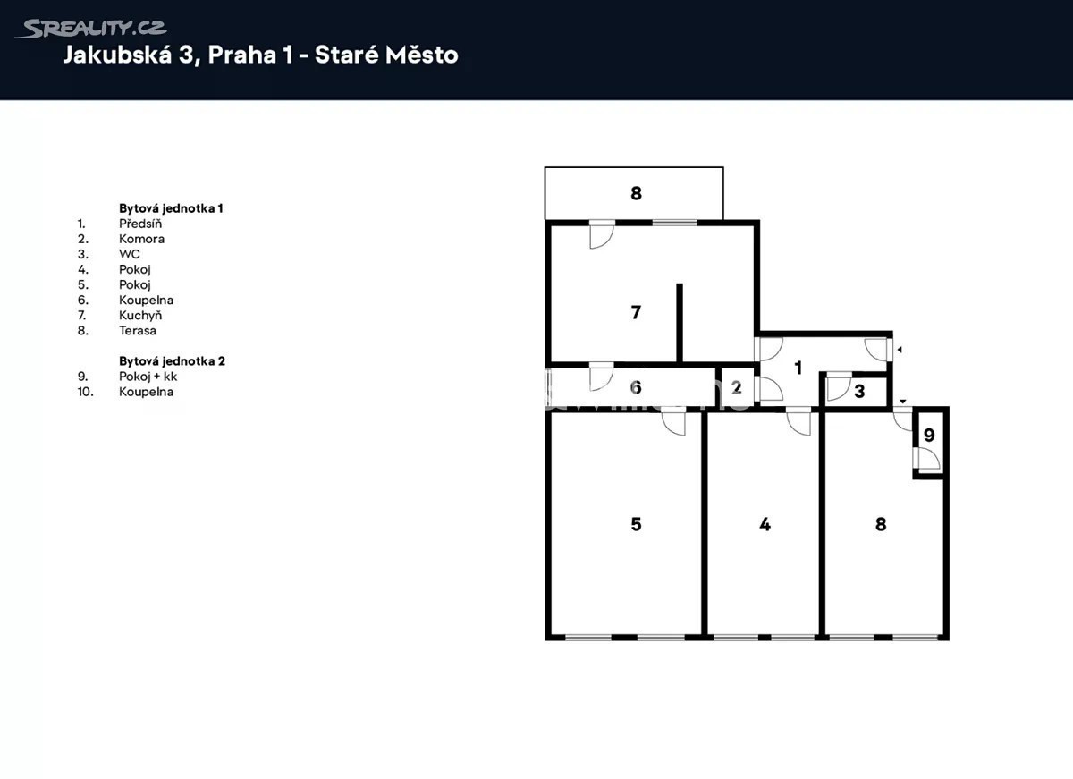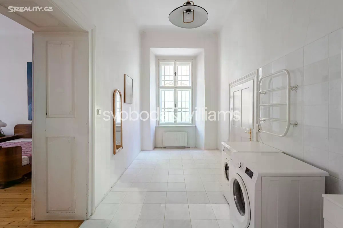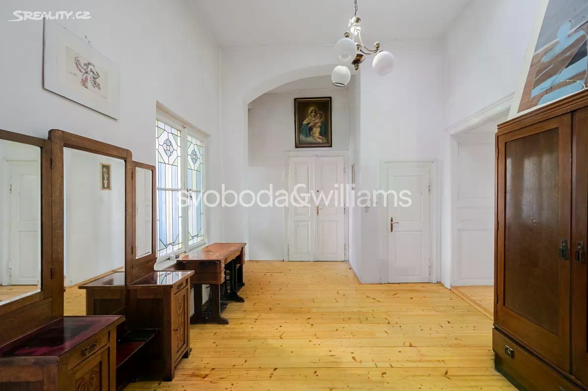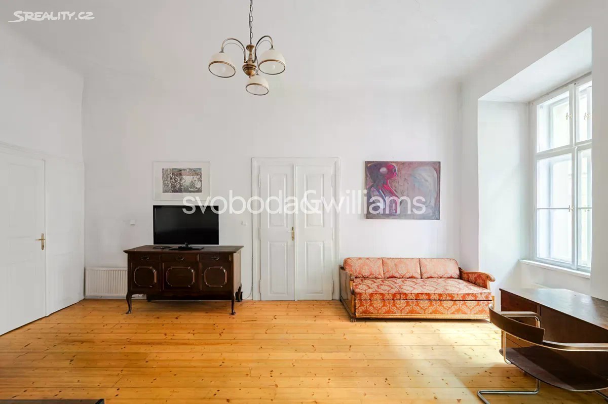 Prostorný byt s vysokými stropy, terasou a výhledem na barokní kostel sv. Jakuba Většího je součástí památkově chráněného historického pavlačového domu, který stojí přímo v centru Prahy na rozhraní Starého a Nového Města, blízko náměstí Republiky i Staroměstského náměstí. Plochu bytu umístěného ve 2. podlaží tvoří obývací pokoj, velká kuchyně se vstupem na terasu, ložnice, koupelna, samostatná toaleta, komora a předsíň. K bytu dále náleží pokoj, který původně tvořil součást bytu, byl však stavebně oddělen a upraven na garsoniéru s koupelnou, kuchyňkou a vlastním vstupem. Posloužit může jako bydlení pro hosty, dospívající děti či k pronájmu. Pokoje jsou orientované na jih do jednosměrné ulice, kuchyně s terasou na sever do klidného vnitrobloku. Okna jsou dřevěná špaletová, podlahy parketové nebo prkenné, dveře masivní dvoukřídlé, v kuchyni a koupelně je elektrické podlahové vytápění. Předsíň zdobí vitrážová okna směřující na pavlač, vstup do budovy je na čip. Původně gotický dům, který byl koncem 18. století klasicistně přestavěn, má novou fasádu. V bezprostředním okolí je k dispozici veškerá občanská vybavenost, jen pár kroků vede do obchodního domu Kotva a nákupního centra Palladium, široká je nabídka restaurací, klubů, kin i divadel. Skvělou dostupnost zajišťuje metro linky B a četné tramvajové linky, blízko je i Masarykovo nádraží. Podlahová plocha 169,5 m², terasa 12 m2.