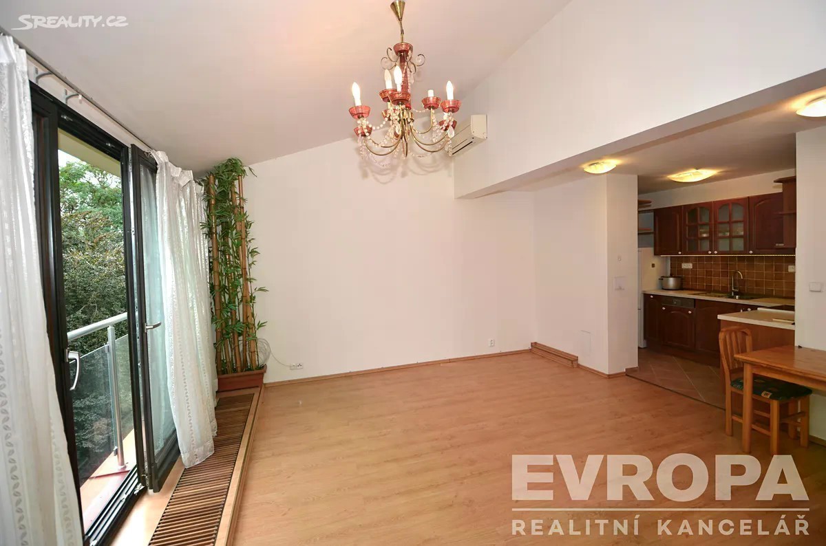 Nabízíme krásný byt, který se nachází ve 2 patře krajního, řadového rodinného domu s vlastním vstupem po schodišti (společná vstupní předsíň v přízemí domu a schodiště se vstupy do jednotlivých bytů). Byt nabízí komfortní a slunný prostor, dispozice bytu je 2+kk, skládá se ze vstupní předsíně, prostorný obývací pokoj s velkoformátovými okny s výhledem do zeleně a na slunnou jižní stranu, kompletně vybavená kuchyňská linka. Dále samostatná ložnice. Byt je částečně vybavený, kuchyňská linka sporák, lednice, pračka, částečně nábytek viz. foto (nábytek možné po dohodě odstranit), koupelna s vanou, wc samostatné. Volné parkování před domem, autobusové spojení na metro Kačerov, nebo Budějovickou. Dům se nachází přímo u vstupu do lesoparku. Majitel preferuje klidnější nájemce, bez domácích zvířat a vzhledem k dispozici bytu 2+kk, maximálně 2 osoby. Garantuje velmi korektní jednání a možný dlouhodobější nájem. Kompletní výše nájmu včetně fixních poplatků je 25000,Kč měsíčně. Byt je k nastěhování volný ihned. Prohlídky možné po dohodě.