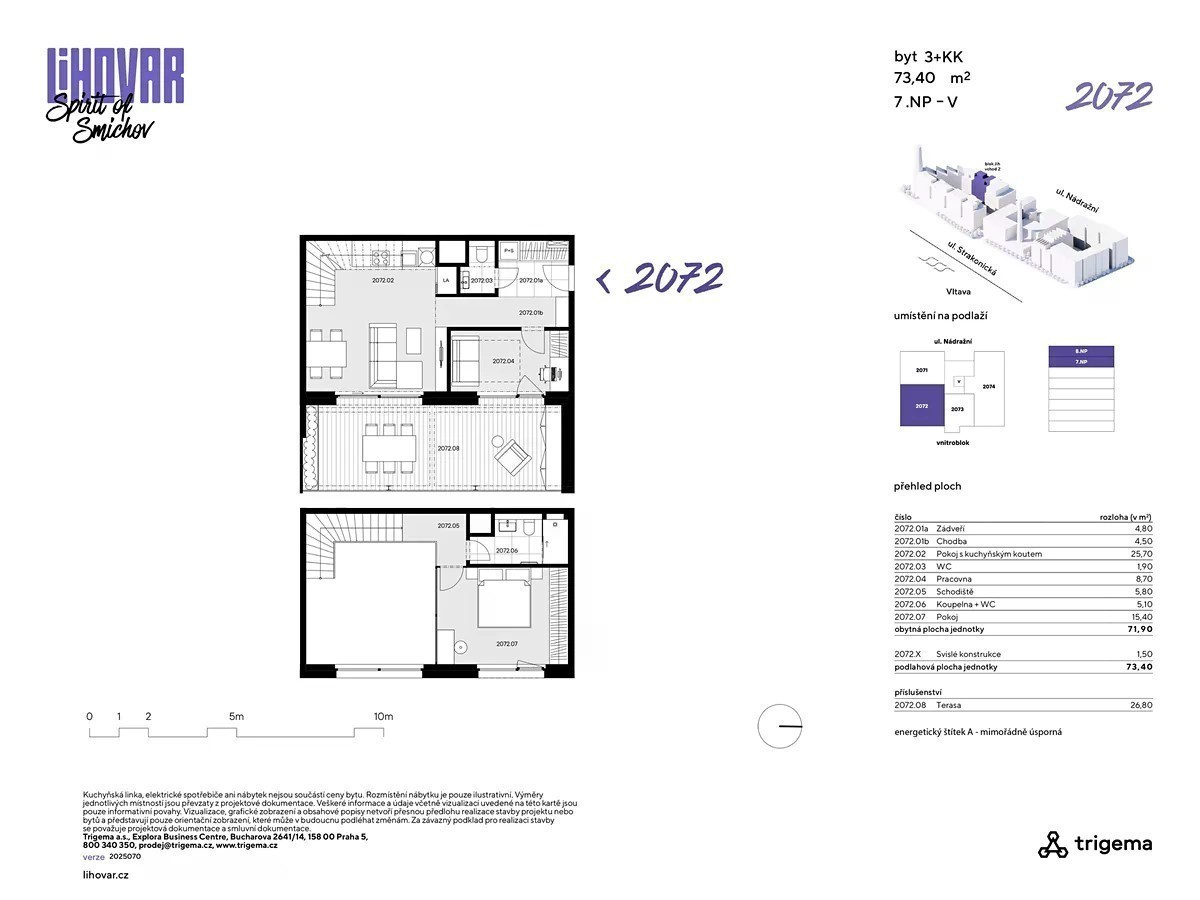 Staňte se součástí výjimečného projektu! Smíchov se mění - a vy můžete být u toho. Třetí a zároveň poslední etapa výjimečného projektu uzavírá vznik nové čtvrti, kde se industriální styl snoubí s moderní architekturou. Na místě vyroste živý prostor plný obchodů, služeb a kulinářských zážitků v rámci rozsáhlého food courtu. Nový Dvorecký most propojí Smíchov s Podolím a rekonstrukce Smíchovského nádraží dodá celé lokalitě ještě větší hodnotu. Prémiové byty ve vyšších patrech nabídnou neopakovatelné výhledy na Vltavu, Vyšehrad a Pankrác. Poslední šance stát se součástí místa, které definuje budoucnost této části Prahy. Exkluzivní 3+kk s pracovnou a rozlehlou terasou Byt č. 2072 o dispozici 3+kk a podlahové ploše 73,40 m² se nachází v 7. nadzemním podlaží a je orientovaný na východ. Jedná se o výjimečnou jednotku s ideálním rozložením místností a bonusem v podobě terasy o velikosti 26,80 m². · Prostorná terasa ideální pro relaxaci, posezení i zahradničení · Pracovna jako oddělený prostor pro home office · Dvě toalety - koupelna s WC + samostatné WC · Světlé, promyšlené uspořádání s maximálním využitím plochy · Energetická třída A - mimořádně úsporná O pohodlí se starají moderní technologie - rekuperace, stropní chlazení, exteriérové žaluzie či izolační trojskla. Vše je řízeno chytrým systémem Loxone, který zajišťuje příjemné a úsporné bydlení v každém ročním období. Byty v LIHOVARU jsou navrženy pro maximální komfort a praktičnost. Každý byt má vlastní terasu nebo lodžii. Promyšlené dispozice přinášejí dostatek světla a vzdušnost, přičemž ideální domov tu najde jak náročný singl, tak rodina s dětmi. Fotografie interiéru jsou pouze referenční. Pro prohlídku nemovitosti kontaktujte makléře společnosti. Nabídka dalších bytů na stránkách developerského projektu.