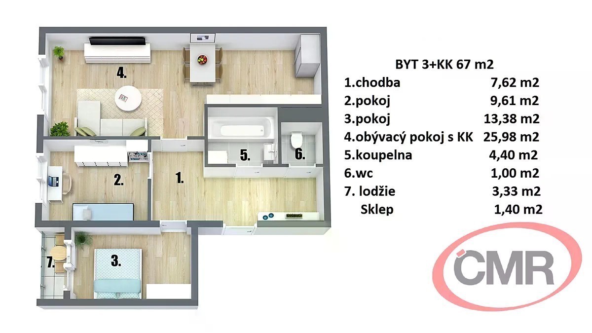 Prostorné 3+kk/L 67 m2 v 7 N.P. zrekonstruovaného panelového domu, Praha 4 - Chodov ( nová fasáda, výtah). Vybavení bytu - plastová okna, kuchyňská linka včetně spotřebičů, koupelna se sprchovým koutem a samostatná toaleta. Zachovalý stav bytu s krásným výhledem do přírody, byt má celkovou podlahovou plochu 67 m² (z toho užitná plocha 62 m² + lodžie 3,3 m² + sklep 1,4 m²). Lokalita nabízí plnou občanskou vybavenost. Ať už děti či dospělí, každý najde vše potřebné na dosah ruky. Nákupní možnosti v široké paletě jsou v docházkové vzdálenosti a k tomu i centrální park s řadou atrakcí, kde můžete trávit volný čas. Na nejbližší zastávku MHD, metro C - Opatov se dostanete za pár minut pohodlnou chůzí a dále pak komfortně kamkoliv budete potřebovat. Doporučuji osobní prohlídku.