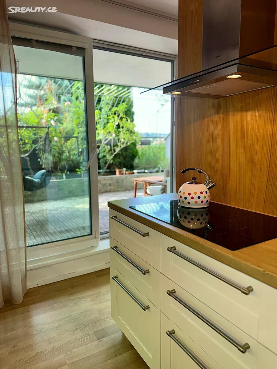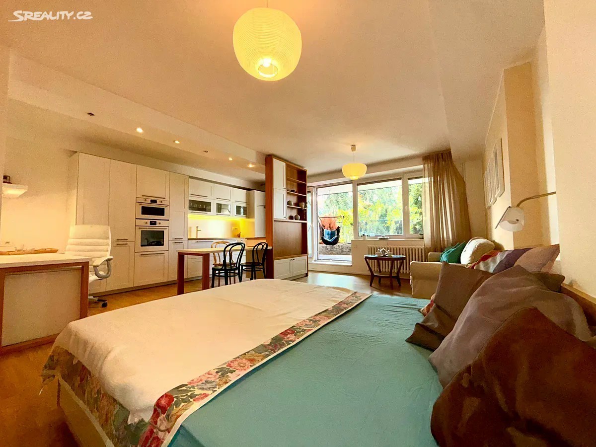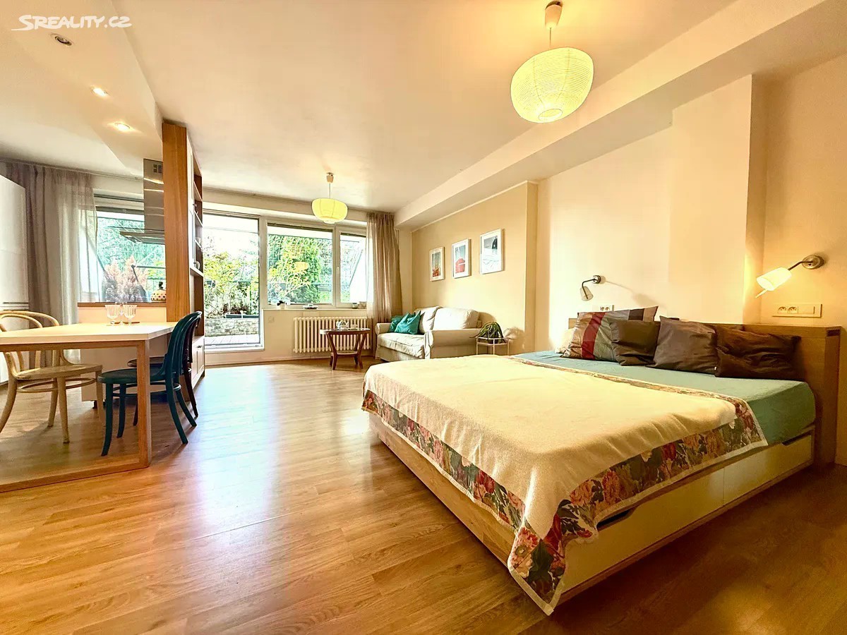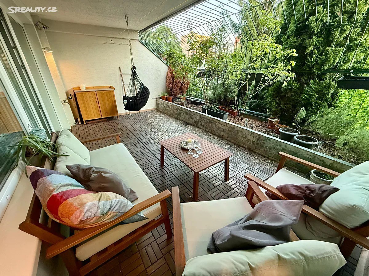 Působivý a přívětivý byt s plochou interiéru 50 m2, k tomu terasa 18 m2 a sklep 4 m2, v osobním vlastnictví, po precizní kompletní rekonstrukci, je koncipován na principu velkého otevřeného obytného prostoru, kde na sebe spojitým způsobem plynule a harmonicky navazují jednotlivé funkční zóny, tvořené kuchyní, stolováním, obývacím posezením i místem pro spánek v podobě plnohodnotného dvoulůžka; dokonce nechybí ani pracovní kout. Z praktického hlediska je důležité zmínit dostatek úložných prostor. Dispozičně jsou jako samostatné místnosti odděleny pouze komora a koupelna s umyvadlem, toaletou, sprchovým koutem a nikou s vestavěným nábytkem i pračkou. Celý interiér je důkladně promyšlený, kompletně nábytkově vybavený a v této formě bude novému vlastníkovi předán. Jedinečný charakter bytu umocňuje částečně krytá prostorná terasa, která je orientovaná na jih a navazuje na obytný prostor bytu, z něhož je přístupná přes posuvné dveře. Výhled je do bohaté zeleně obklopující terasu. Jedná se o zvlášť vhodnou příležitost investice do bydlení pro jedince či pár, který upřednostňuje užívat si jeden větší a vzdušný obytný prostor před jeho tradičním rozdělením na několik samostatných, avšak menších, místností a zároveň netouží po starostech s rekonstrukcí a vybavováním. Byt je volný, připravený k užívání bez velkého stěhování. Byt je situován ve zvýšeném přízemí udržovaného terasovitého domu skeletové konstrukce, kolaudovaného roku 1989. SVJ funguje spolehlivě a není zadlužené. Měsíční poplatky činí přibližně 4000,-Kč plus elektřina. Lokalita je právem oblíbená, má poklidnou atmosféru a dobrou dopravní dostupnost (metro, tramvaj, autobus).