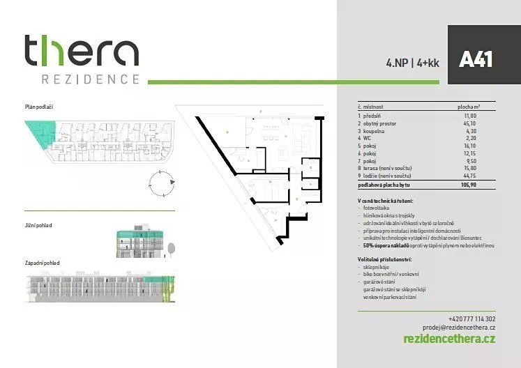 Nenechte si ujít příležitost stát se majitelem jednoho z posledních volných bytů v prestižním developerském projektu Rezidence Thera v Hradci Králové - Kuklenách. Tento projekt je synonymem moderního, zdravého a úsporného bydlení s minimálními měsíčními náklady na energie. Rezidence Thera je developerský projekt o 65 bytových jednotkách, od praktických 1+kk po prostorné 4+kk. Všechny jednotky jsou zkolaudovány a připraveny k okamžitému nastěhování. V současné době jsou k prodeji poslední byty o dispozici 1+kk, 2+kk a 4+kk a poslední z celkem 6ti komerčních prostor. V tomto případě vám nabízíme byt 4+kk s označením A41: • Podlahová plocha 105,95 m² (dle nař. vl. 366/2013 Sb.) + terasa 15,20 m² a balkón 44,75 m² • 4. nadzemní podlaží, orientace - jihovýchod a západ • Dispozice - předsíň 11,00 m², obytný prostor 45,10 m², koupelna 4,30 m², WC 2,20 m², komora 1,50 m², pokoj 9,50 m², pokoj 16,10 m² a pokoj 12,15 m² • Hlukově izolační mezibytové příčky pro klidné bydlení • Velkoformátová hliníková okna s trojskly, venkovní žaluzie • Příprava na klimatizaci a inteligentní domácnost • Inovativní designová podlahová krytina s protihlukovým vyrovnávacím kašírováním z přírodního materiálu, sádrové omítky, bezpečnostní protipožární vchodové dveře • Podlahové vytápění, řízené větrání s rekuperací • Fotovoltaická elektrárna na střeše domu vlastněná SVJ pro energetickou efektivitu Příslušenství na dokoupení: Garážové stání, venkovní parkovací stání. Dokonalý odpočinek: Velkorysé balkony a terasy poskytují dostatek soukromí pro relaxaci a odpočinek. Skvělá lokalita: Život v Hradci Králové přináší bohaté společenské, kulturní a sportovní vyžití. V okolí najdete veškerou občanskou vybavenost - školy, restaurace, kavárny a snadný přístup do centra města. Výborná dopravní dostupnost: Zastávka autobusu je přímo u Rezidence. Nájezd na dálnici D11 je vzdálen pouhých pár minut jízdy. Financování: Zdarma vám pomůžeme zajistit financování koupě bytu prostřednictvím našeho partnera. Rádi vás uvítáme na prohlídce bytu, pro sjednání termínu kontaktujte makléře! Tým Reality Kolenović