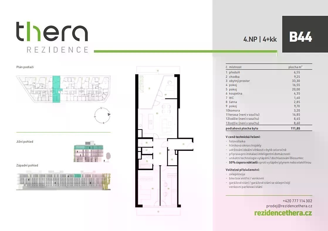 Nenechte si ujít příležitost stát se majitelem jednoho z posledních volných bytů v prestižním developerském projektu Rezidence Thera v Hradci Králové - Kuklenách. Tento projekt je synonymem moderního, zdravého a úsporného bydlení s minimálními měsíčními náklady na energie. Rezidence Thera je developerský projekt o 65 bytových jednotkách, od praktických 1+kk po prostorné 4+kk. Všechny jednotky jsou zkolaudovány a připraveny k okamžitému nastěhování. V současné době jsou k prodeji poslední byty o dispozici 1+kk, 2+kk a 4+kk a poslední z celkem 6ti komerčních prostor. V tomto případě vám nabízíme byt 4+kk s označením B44: • Podlahová plocha 111,70 m² (dle nař. vl. 366/2013 Sb.) + terasa 16,85 m², balkon 8,45 m², a balkon 8,60 m² • 4. nadzemní podlaží, orientace - východ západ • Dispozice - předsíň 6,55 m², chodba 9,25m², obytný prostor 33,30 m², koupelna 4,35 m², WC 1,60 m², komora 3,20 m², šatna 2,85 m², pokoj 9,70 m², pokoj 16,55 m² a pokoj 20,00 m² • Hlukově izolační mezibytové příčky pro klidné bydlení • Velkoformátová hliníková okna s trojskly, venkovní žaluzie • Příprava na klimatizaci a inteligentní domácnost • Inovativní designová podlahová krytina s protihlukovým vyrovnávacím kašírováním z přírodního materiálu, sádrové omítky, bezpečnostní protipožární vchodové dveře • Podlahové vytápění, řízené větrání s rekuperací • Fotovoltaická elektrárna na střeše domu vlastněná SVJ pro energetickou efektivitu Příslušenství na dokoupení: Garážové stání, venkovní parkovací stání. Dokonalý odpočinek: Velkorysé balkony a terasy poskytují dostatek soukromí pro relaxaci a odpočinek. Skvělá lokalita: Život v Hradci Králové přináší bohaté společenské, kulturní a sportovní vyžití. V okolí najdete veškerou občanskou vybavenost - školy, restaurace, kavárny a snadný přístup do centra města. Výborná dopravní dostupnost: Zastávka autobusu je přímo u Rezidence. Nájezd na dálnici D11 je vzdálen pouhých pár minut jízdy. Financování: Zdarma vám pomůžeme zajistit financování koupě bytu prostřednictvím našeho partnera. Rádi vás uvítáme na prohlídce bytu, pro sjednání termínu kontaktujte makléře! Tým Reality Kolenović