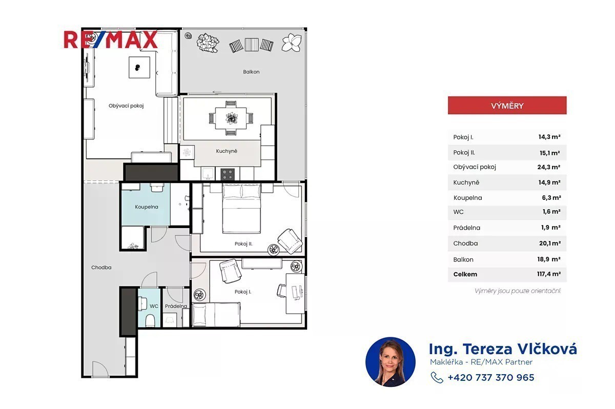 Hledáte prostorné a komfortní bydlení s nádherným výhledem do zeleně? Tento byt o velikosti 100 m² s terasou (cca 19 m²), sklepem a vyhrazeným krytým parkovacím místem se nachází v nejvyšším, 10. nadzemním podlaží domu z roku 2014 v ulici 17. listopadu. Z terasy si užijete jedinečný výhled na přírodní park Radouč. Byt je kompletně zařízen nábytkem a připraven k nastěhování. Součástí je moderní kuchyňská linka se spotřebiči, klimatizační jednotka umístěná v kuchyni a krb na dřevo v obývacím pokoji. Vytápění a ohřev vody jsou zajištěny centrálně. Dům je vybaven dvěma výtahy. V domě je rovněž zaveden optický kabel, smlouvu s poskytovatelem internetu si sjednává a hradí nájemce. Podmínky pronájmu: nájemné: 26 000 Kč/měsíc zálohy na služby: 4 000 Kč/měsíc elektřina: přepis na nájemce (doporučená záloha 1 500 Kč/měsíc) kauce: 52 000 Kč provize RK: 26 000 Kč + DPH (31 460 Kč) Byt je určen pro dvě dospělé pracující osoby, nekuřáky, bez domácích mazlíčků. Lokalita nabízí veškerou občanskou vybavenost. Park Radouč láká k procházkám či sportovním aktivitám. Výborná dopravní dostupnost - na okraj Prahy i do Liberce cca 40 minut jízdy. Byt je volný a k nastěhování dle dohody.V případě zájmu o prohlídku mě prosím kontaktujte prostřednictvím formuláře a uveďte základní informace o sobě. Těším se na vás na prohlídce. Ing. Tereza Vlčková | realitní makléřka