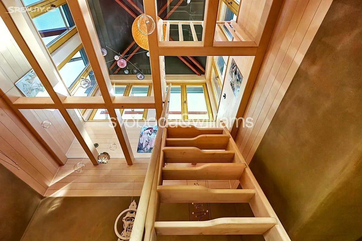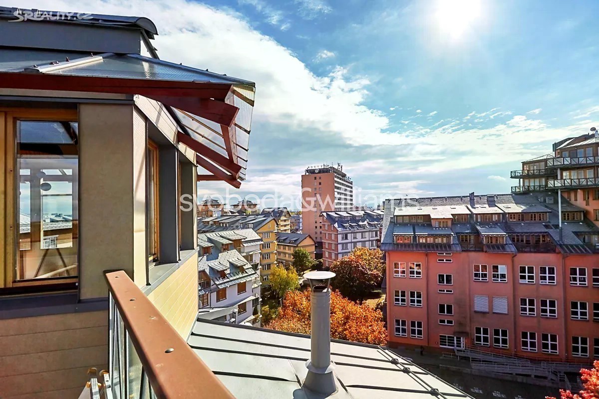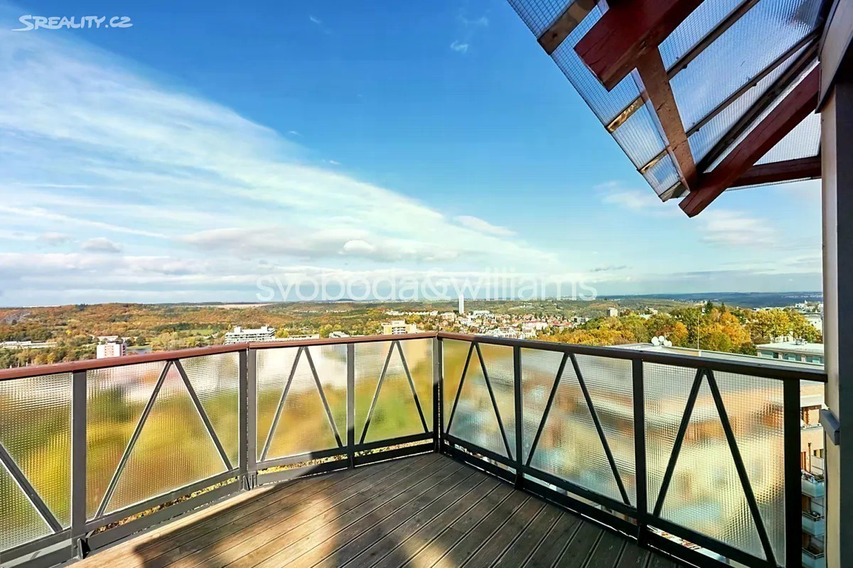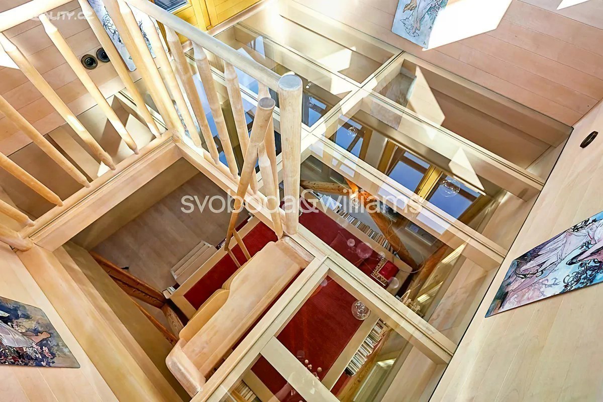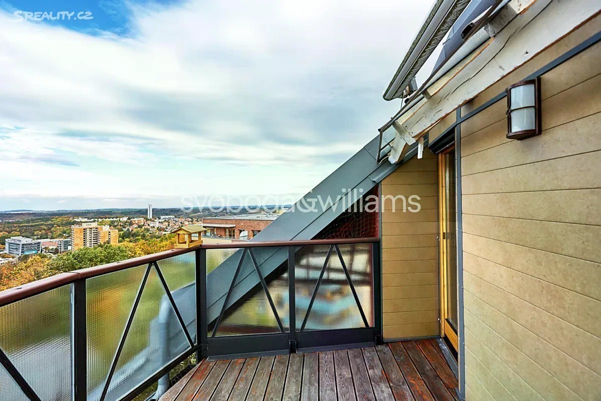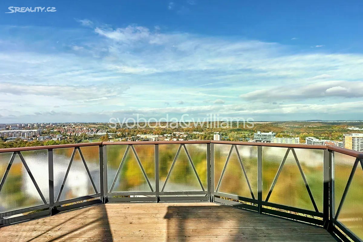 Mezonetový podkrovní byt od autora Tančícího domu má několik balkónů i terasu a je zařízený dle zásad Feng-Shui. Vyhledávaná čtvrť Petřiny vyniká bohatou infrastrukturou, perfektním spojením s centrem a blízkostí zelených ploch. Dispozice bytu v 7., 8. a 9. podlaží je původně 5+1 a v současnosti je užívaný jako 4+1. Vstupní úroveň tvoří obývací pokoj, kuchyň, velká ložnice s koupelnou, 2. ložnice, samostatná toaleta a prostorná vstupní hala. O patro výše je otevřený prostor s vlastní koupelnou a schody do věže - observatoře se vstupem na terasu s panoramatickým výhledem do širokého okolí. Ze všech místností je díky přilehlému balkónu nebo terase přístup na čerstvý vzduch. Dům i interiér bytu včetně nábytku navrhl architekt Vlado Milunić, který projekt zpracovával souběžně s Tančícím domem. Okna i podlahy jsou dřevěné, omítky hliněné. Na útulnosti prostoru dodávají masivní dveře a krbová kamna. Kuchyně je plně zařízena spotřebiči Miele, ve vzdušné koupelně je masážní vana. K bytu přísluší velkoprostorový sklep, vytápění zajišťuje centrální kotelna. Vše potřebné je v pěším dosahu: mateřské a základní školy, gymnázium, menší obchody i supermarket, dětská hřiště, pošta či lékárna. Centrum je vzdáleno pár minut přímé jízdy metrem nebo tramvají, místo nabízí také snadnou dostupnost letiště. Krátkou procházkou lze dojít do rozlehlé Obory Hvězda, nedaleko je park s oblíbenou inline dráhou Ladronka. Podlahová plocha 136 m2, terasa 16,7 m2, balkóny 29,2 m2, sklep 14,5 m2.
