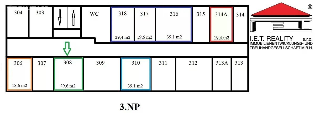 Pronájem kanceláře č. 308, 29,6 m², situované ve 3.NP komerční budovy na ul. Kroftova v Brně. Jedná se o jednu samostatnou místnosti s přímým vstupem a vlastnímpřívodem vody s umývadlem. Jednotka je vybavena skříněmi. V rámci podlaží je k dispozici sdílené sociální zařízení s kuchyňkou. Kancelář má vlastní zabezpečovací okruh s přístupem 24/7 a k pronáimu je volná ihned. Možné je využívat také omezenou kapacitu parkovacích míst.