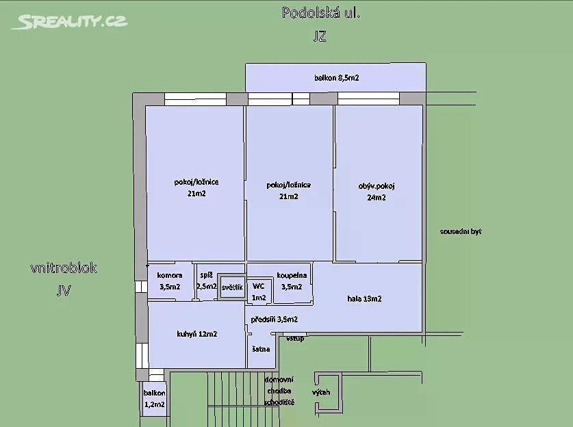 Pronájem zajímavě řešeného bytu 3+1, 115m², 5. patro v r. 2022 zrekonstruovaného zděného bytového domu z r. 1930. Výtah. Dva balkony. Dispozice bytu: ze vstupní předsíně se šatnou (3,5m²) je přístupná kuchyň (12m²) a prostorná hala (13m²) ze které je přístup do obývacího pokoje (24m²), do 2. pokoje/ložnice (21m²), do koupelny (3,5m²) a na toaletu (1m²). Třetí pokoj/ložnice (21m²) je přístupný z přes 2. pokoj. Ke kuchyni patří spíž (2,5m²) a menší balkon (1,2m²). Z obývacího pokoje resp. z 2. pokoje je přístupný balkon (8,5m²). Vytápění, včetně teplé vody zajišťuje nová domovní plynová kotelna. Dům byl v rámci rekonstrukce zateplený a proběhla výměna oken. V suterénu domu je k dispozici sklepní kóje a v přízemí dobře zajištěná místnost pro uložení dětských kočárků, kol apod. V domě je instalováno elektronické zabezpečovací zařízení. Nabízený byt je k nastěhování od 1.11.2025. Klidná ulice. Světlý, slunný byt. Balkon a okna obývacího pokoje a 2x ložnice jsou situovány jihozápadním směrem do málo frekventované Podolské ulice, s pohledem do vrostlé zeleně a s mimořádně krásným výhledem na Vltavu, Vyšehrad, Malou Stranu a zejména na panorama Pražského Hradu. Dobré parkování - možnost parkování pro rezidenty P4 cca 1.200,-Kč/rok. Zastávka tramvaj "Kublov" cca 3min/180m. Podolský plavecký stadion cca 6min./350m.