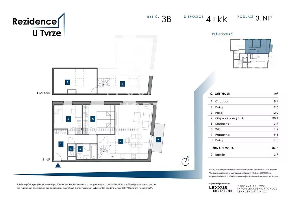Byt 4+kk o ploše 86,7 m² s balkonem (3,7 m²), sklepem a možností garážového stání je rozložen ve 3. podlaží Rezidence U Tvrze. Komorní projekt nabízí kvalitní bydlení v klidné části Malešic s rychlým spojením do centra. Prostorný obývací pokoj propojený s kuchyňským koutem poskytuje přímý vstup na balkon i schodiště k horní galerii. V dolní části se nachází dvě ložnice, koupelna s vanou a samostatné WC. Horní část doplňuje galerie s dalším pokojem a pracovnou, která se snadno přizpůsobí vašim potřebám. Součástí standardu jsou vysoce kvalitní materiály a moderní technologie: energeticky úsporný systém SMARTPANEL zajišťuje optimální mikroklima, podlahové vytápění ve všech obytných místnostech garantuje maximální pohodlí. Hliníková okna s trojskly poskytují vynikající tepelně-izolační i akustickévlastnosti. Vzduchotechnika s centrální rekuperací a regulací CO₂ přináší stálý přísun čerstvého vzduchu. Chytrá domácnost TapHome umožňuje ovládání topení, osvětlení i zabezpečení bytu na dálku. Lokalita Malešic nabízí ideální kombinaci klidného prostředí plného zeleně a veškeré občanské vybavenosti. V těsné blízkosti najdete Malešický park, botanickou zahradu i přírodní park Smetanka. Na dosah jsou restaurace, kavárny, obchodní centrum Oáza Malešice, mateřské i základní školy. Do centra Prahy se dostanete pohodlně a rychle - autobusová zastávka Malešické náměstí je vzdálená jen 500 metrů a přímým spojem jste na metru Skalka za pouhých sedm minut, do centra Prahy dojedete celkově do 30 minut. Do budoucna se v lokalitě plánuje další rozvoj veřejných prostranství a dopravní infrastruktury, včetně nové cyklostezky na místě původního viaduktu, která propojí Malešice se širší sítí pražských cyklotras.