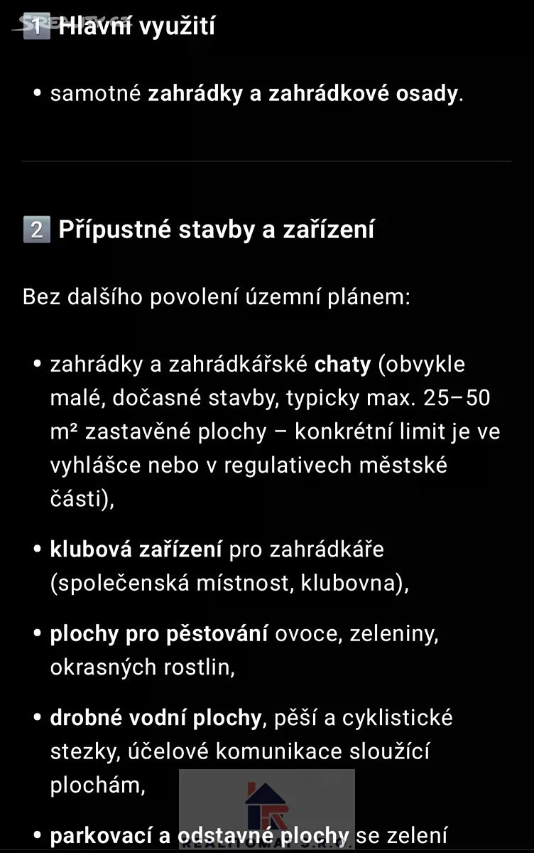 Prodej pozemků se zahrádkářskou chatkou - atraktivní lokalita Hloubětín Nabízíme k prodeji soubor pozemků s chatkou v zahrádkářské kolonii ZO ČZS „Silvána“ v Hloubětíně. Část pozemku kde stojí chata ve svahu s krásným výhledem je dle územního plánu v PZO - Zahrádky a zahrádkové osady. Druhá část pozemku, kde jsou vzrostlé stromy je v LR - lesy a rekreace. Pozemky jsou v osobním vlastnictví a nabízejí zajímavou možnost rekreace nebo investice s potenciálem rekonstrukce či rozšíření pro celoroční bydlení. Povoleno je tedy zastavěná plocha 25 m2 v 1. Podzemním podlaží - ve svahu, 25 m2 v prvním nadzemním podlaží a podkroví (25m2). Teoreticky by byla možná užitná plocha až 70 m2. Jen pár metrů od pozemku se nachází obytná zástavba s cenou 20 000 Kč/m2. Popis nemovitosti: Parcely: ********* přístupová cesta 1308/1 Chatka: Dříve sloužila k bydlení, možnost rekonstrukce, zateplení,. Přístup: zajištěn cestou 1308/1. Voda: přivedena celoročně, podružný vodoměr, rozúčtování dle spotřeby. Elektřina: zavedena s podružným měřením, samostatné odběrné místo (PRE) Odpad: vlastní zajištění, aktuálně suchý záchod, dle stavebního úřadu možná realizace odpadní jímky k vyvážení, možnost kompostování dle osadního řádu. Právní vztahy a poplatky: Pozemky v soukromém vlastnictví; členství v ZO ČZS „Silvána“ není povinné. Členský poplatek: 1 000 Kč/rok; nájemné za společné cesty a vodu: cca 200 Kč/rok pro členy, cca 5 000 Kč/rok pro nečleny. Stavební úpravy se řídí obecnými předpisy, kolaudace chatky není vyžadována ZO. Výhody lokality: Klidná, přístupná a atraktivní lokalita pro rekreaci. Možnost přestavby či rekonstrukce chatky k rekreačnímu nebo trvalému bydlení. Historie a tradice kolonie, dlouhodobě udržované sousedské vztahy. Rozměr chaty 3 x 5 m2 + sklep. Možnost 5 x 5 m2 x 3 podlaží.