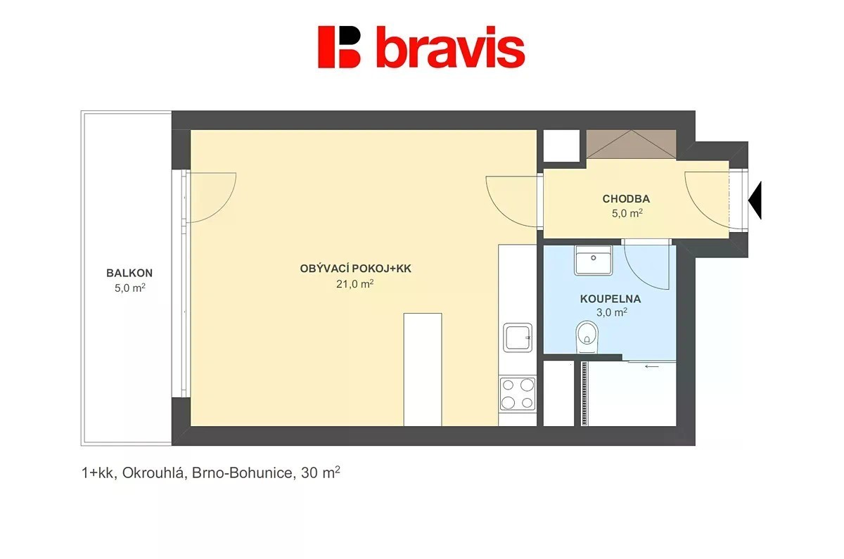 Pronájem bytu 1+kk 30 m² Okrouhlá, Brno - Bohunice