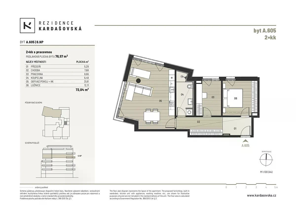 Hledáte byt, který nabídne dostatek prostoru, klid a příjemné světlo po celý den? Tento byt 3+kk (76,6 m²) v 6. NP nabízí okna na sever a západ, velký otevřený obývací prostor a klidné zázemí v čistě rezidenčním domě. Po vstupu do bytu vás přivítá předsíň (5,3 m²) s místem pro vestavěnou skříň, na kterou navazuje chodba (7,7 m²) spojující všechny místnosti. Obývací pokoj s kuchyňským koutem (31,8 m²) tvoří srdce bytu - díky velkým francouzským oknům orientovaným na západ působí světlým a vzdušným dojmem. Ložnice (12,1 m²) a druhý pokoj (8,7 m²) jsou orientovány na sever, což zajišťuje klid a příjemnou teplotu i v letních měsících. Koupelna (6,5 m²) je vybavena sprchovým koutem a prakticky odděleným prostorem pro pračku a sušičku, takže zůstává vizuálně čistá a prostorná. Interiér v dekoru světlého dřeva a neutrálních tónů působí harmonicky a elegantně. Byt je již dokončený a připravený k osobní prohlídce. Dům má čistě rezidenční charakter - bez komerčních prostor. K pohodlí obyvatel přispívají zásilkové boxy, které zjednodušují každodenní fungování a pomáhají snižovat provozní náklady. Každý byt má přípravu pro venkovní stínění a přípravu pro nabíjení elektromobilu. Lokalita spojuje klid rezidenční čtvrti s výbornou dopravní dostupností. Tramvajová i autobusová zastávka jsou přímo u domu, metro Hloubětín jen dvě zastávky. V pěším dosahu je kompletní občanská vybavenost, přírodní park Smetanka i cyklostezka podél Rokytky. Snadné napojení na městský okruh a směr Mladá Boleslav ocení i ti, kdo často cestují mimo město. Možnost dokoupení parkovacího stání a sklepní kóje - za zvýhodněnou cenu při koupi společně s bytem. Kolaudace: listopad 2025. Prodej přímo od developera - bez provize. Současná cenová nabídka platí do konce roku 2025. Zavolejte si o termín prohlídky nebo vyplňte kontaktní formulář - ozveme se vám do 24 hodin.