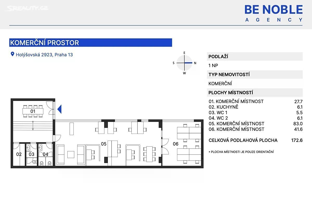 Prodej moderní a reprezentativní kanceláře u metra Luka, ulice Holýšovská - Praha 5, Stodůlky. Nabízíme k prodeji moderní, hezky prosvětlený a plně vybavený kancelářský prostor o ploše 172,6 m². Jedná se o prostor, který spojuje atraktivní adresu, promyšlenou dispozici a kvalitní provedení, a je vhodný pro tým 20+ osob. Dominantou je velkorysý open space o rozloze 83 m², který je rozdělen do několika funkčních zón oddělených zvukově izolačními příčkami: • Posezení pro pracovníky a návštěvy • Různě oddělená pracovní místa • Jednací místnost Součástí je dále samostatná místnost pro osm osob (42 m²). Celá tato část je velmi prosvětlená díky panoramatickým oknům podél celé jedné dlouhé stěny, ze kterých je výhled do velké zelené předzahrádky s hezkými terénními úpravami, o kterou se navíc stará SVJ. Dispozici doplňují větší multifunkční předsíň, dvě oddělené toalety a plně vybavená kuchyň. Prostor je kompletně vybavený kvalitním kancelářským nábytkem a připravený k okamžitému užívání bez nutnosti dalších investic. Je zde dobře řešené osvětlení, nadstandardně vysoké stropy, propracovaná vzduchotechnika, profesionální zvuková izolace, kamerový systém, alarm a mnoho dalšího. Za zmínku stojí výborně fungující SVJ a nízké provozní náklady - se vším všudy, včetně údržby zeleně, se vejdete do cca 7 000 Kč měsíčně. Velkým benefitem je pohodlné parkování zdarma, jak pro návštěvníky, tak pro vaše pracovníky, a samozřejmě i blízkost stanice metra Luka. Budova, ve které se kancelář nachází, je výborně udržovaná a působí reprezentativním dojmem. Kancelář má bezbariérový přístup a vlastní vstup z ulice. Zahrada před domem nabízí odpočinková místa a celkově působí velmi příjemně. Tato nabídka je zajímavá i z investičního pohledu. Současný vlastník je připraven zůstat v nájmu, což novému majiteli přináší stabilní a předvídatelný výnos - odhadovaně kolem 5 % ročně. Kancelářský prostor je tak vhodný nejen pro vlastní využití jako sídlo společnosti, call centrum nebo kontaktní místo, ale také jako bezpečná a výnosná investice. Pokud hledáte moderní kanceláře ve výborné lokalitě s kompletním zázemím a vynikající dostupností, tato nabídka je přesně pro vás. Rádi vám poskytneme více informací a domluvíme osobní prohlídku. Be Noble agency