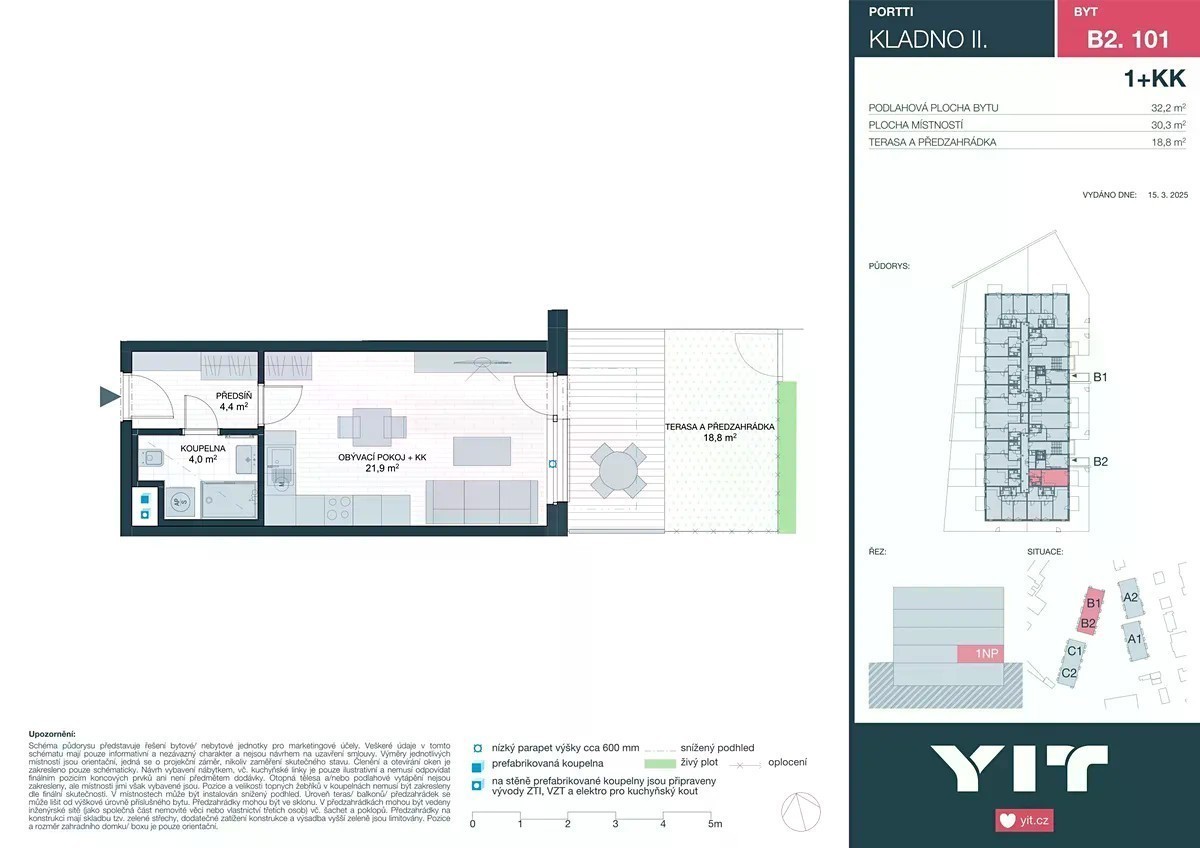 Byt 1+kk o celkové rozloze 32,2 m² s terasou s předzahrádkou 18,8 m² je situován v 1.NP projektu PORTTI Kladno II. Cena zahrnuje bytovou jednotku, sklepní kóji a DPH. V rámci našeho prvního mimopražského projektu PORTTI Kladno II nabízíme nové byty v Kladně na prodej. Ve dvou moderních bytových domech vznikne celkem 102 bytů o dispozicích 1+kk až 4+kk a rozloze od 28 m² do 99 m², k nimž budou náležet balkony, terasy či předzahrádky. V parteru vybudujeme rovněž dvě komerční jednotky. V každém bytovém domě bude umístěna kočárkárna a venkovní místo pro mytí kol a psů. Samozřejmostí jsou sklepy a parkovací stání ve vnitřních krytých garážích, jejichž střechy pokryje zeleň. K dispozici bude také venkovní parkování.