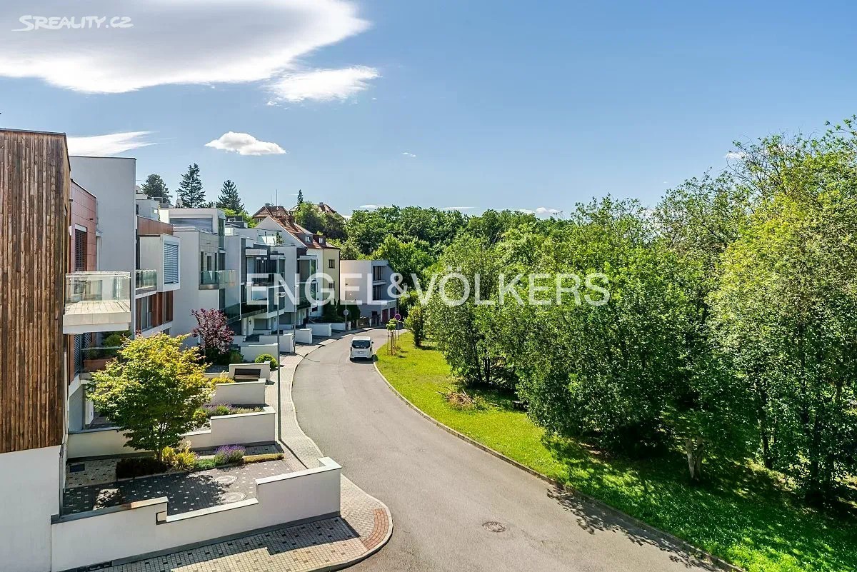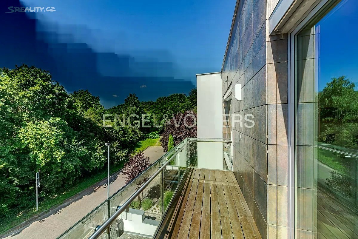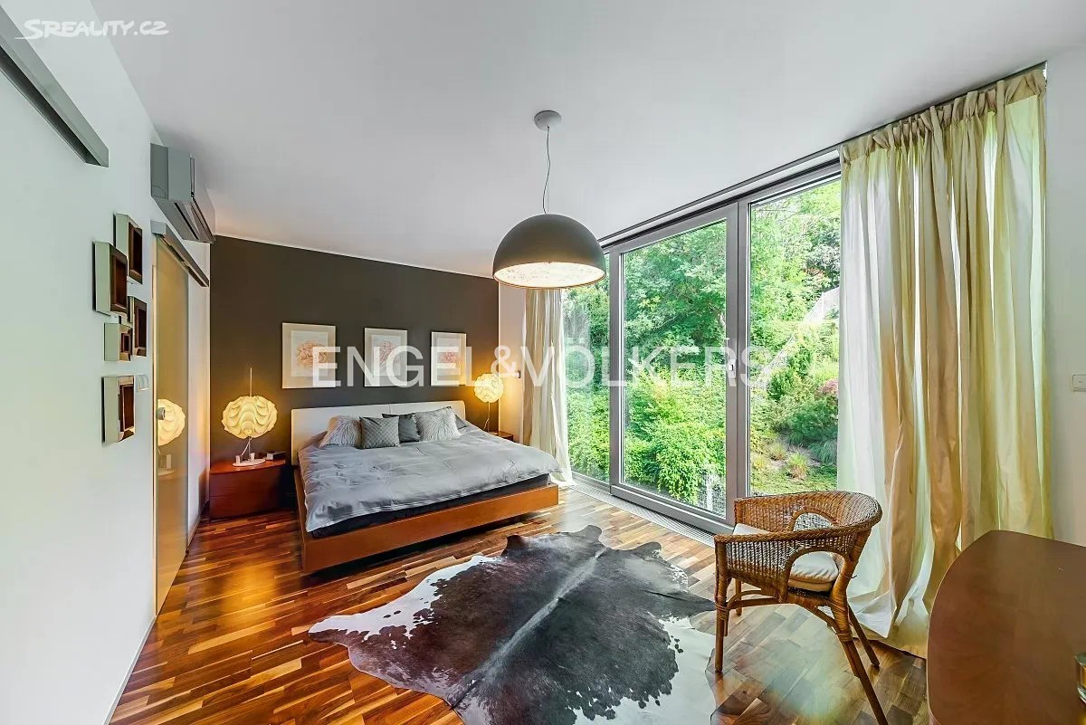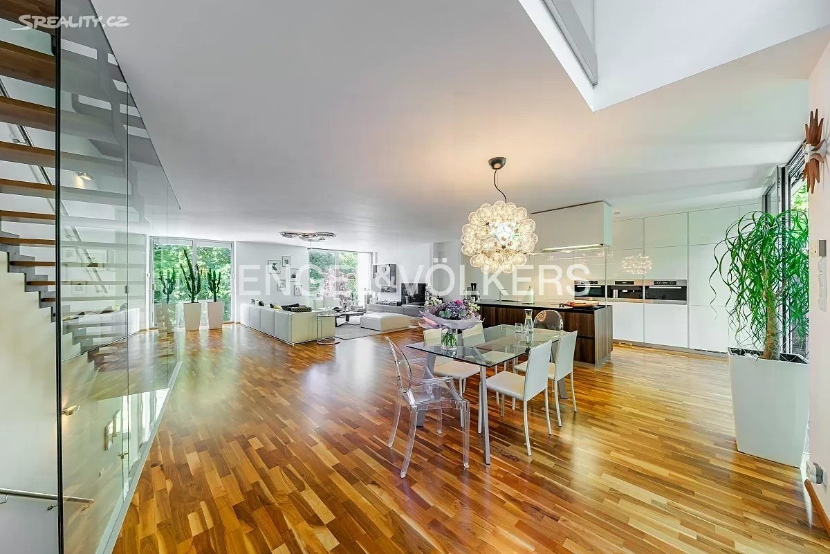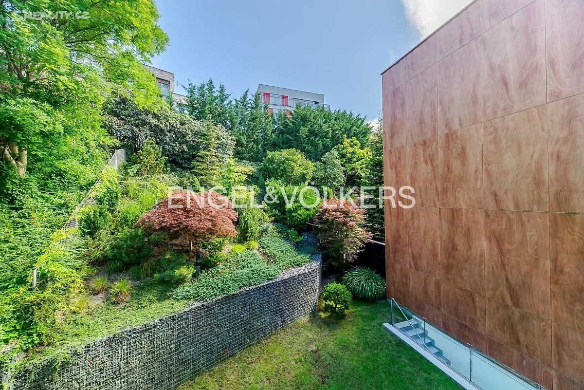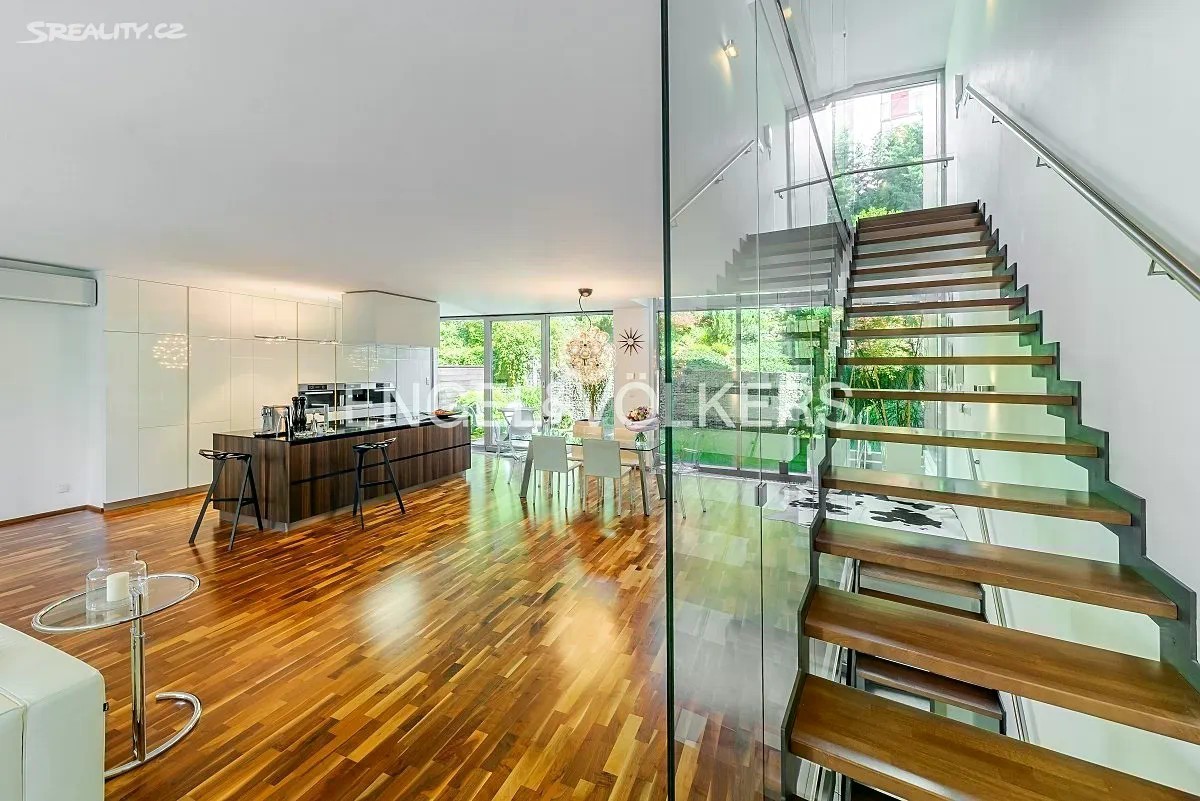 Vila z roku 2009 se nachází v ulici Pod Císařkou a je součástí architektonicky oceněného rezidenčního projektu Atriové vily Císařka. Moderní řadový dům s dispozicí 5+kk nabízí vnitřní užitnou plochu 300 m² a je ideální volbou pro rodinné bydlení s důrazem na soukromí, kvalitu a prostor. Dispozice domu je rozložena do čtyř podlaží propojených elegantním proskleným schodištěm. V nejnižším podlaží se nachází garáž pro dvě auta, vstupní hala, technické zázemí a koupelna. Hlavní obytné patro vyniká prostorným obývacím pokojem s designovou kuchyní Poliform Varenna Twelve se spotřebiči Miele a přímým vstupem na soukromou zahradu. Druhé patro nabízí hlavní ložnici s vlastní koupelnou a šatnou, dvě další neprůchozí ložnice, sdílenou koupelnu a balkon. V nejvyšším podlaží se nachází pracovna nebo další ložnice s přístupem na střešní terasu s přípravou na wellness zónu (koupelna, vířivka apod.). Dům splňuje vysoké standardy jak po technické, tak designové stránce. Interiér tvoří kombinace dřevěných podlah a kamenné dlažby, velkoformátová hliníková okna s dvojskly a venkovním stíněním, klimatizace v každém pokoji, centrální vysavač i rošty z tropického dřeva. Vytápění zajišťuje plynová kotelna. Lokalita na pomezí Hřebenek a Smíchova vyniká jedinečnou kombinací vilového klidu a blízkosti centra města. Dům je situován v tiché slepé ulici obklopené zelení, jen pár minut od Anděla či Malé Strany. V pěším dosahu se nachází školy, obchody, restaurace i veškerá občanská vybavenost. Výborné dopravní napojení zajišťuje Plzeňská ulice, tunel Mrázovka i blízké tramvajové linky.