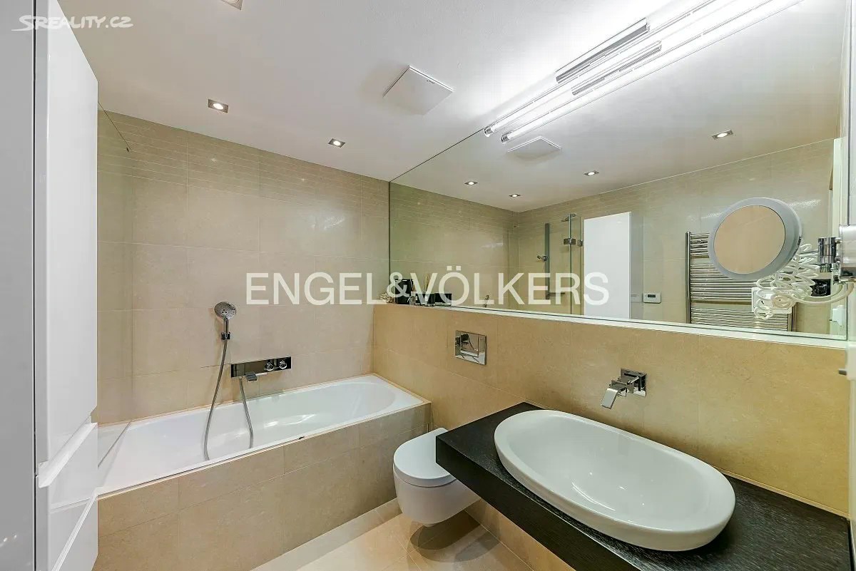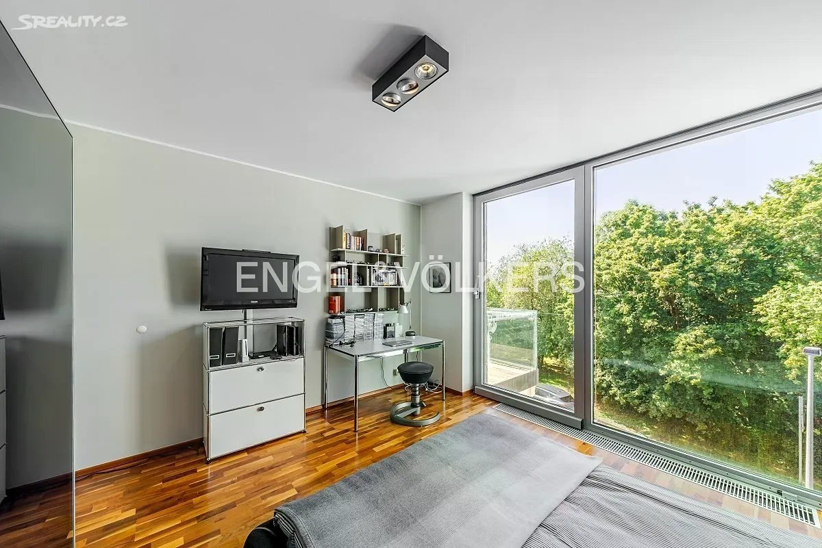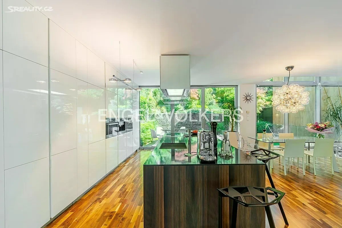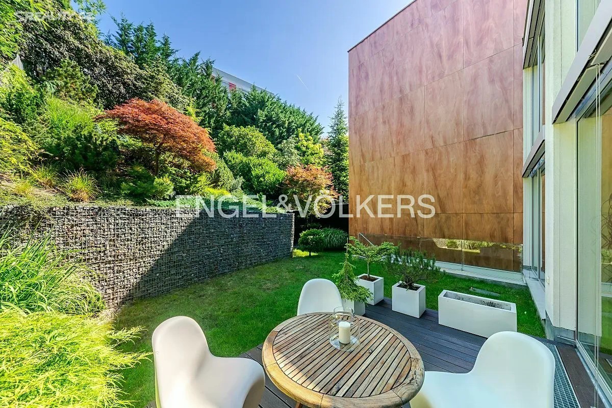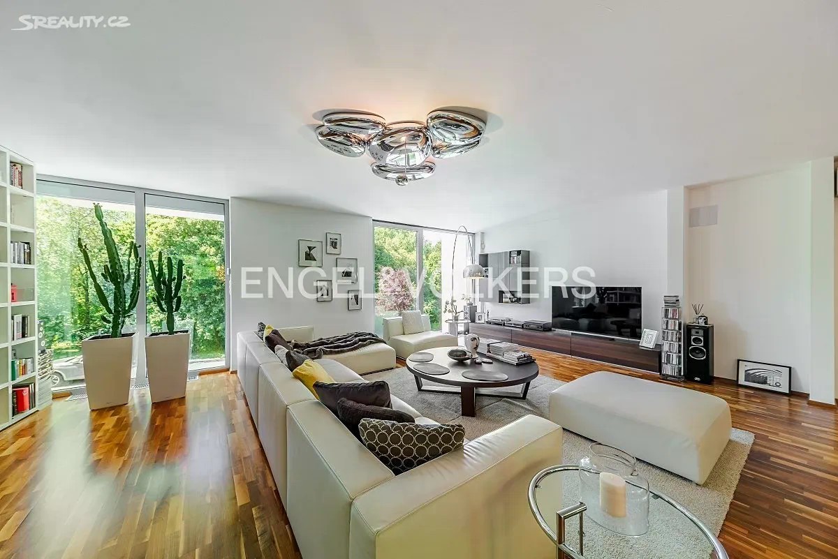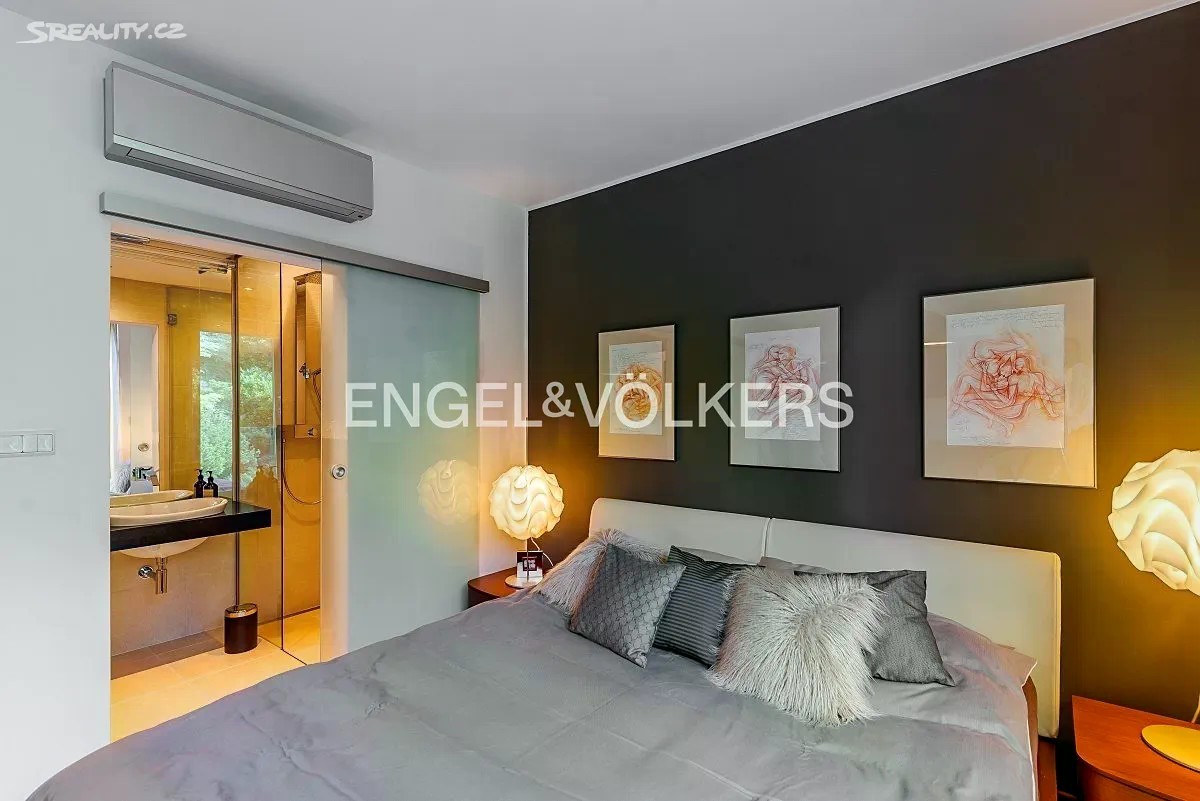 Vila z roku 2009 se nachází v ulici Pod Císařkou a je součástí architektonicky oceněného rezidenčního projektu Atriové vily Císařka. Moderní řadový dům s dispozicí 5+kk nabízí vnitřní užitnou plochu 300 m² a je ideální volbou pro rodinné bydlení s důrazem na soukromí, kvalitu a prostor. Dispozice domu je rozložena do čtyř podlaží propojených elegantním proskleným schodištěm. V nejnižším podlaží se nachází garáž pro dvě auta, vstupní hala, technické zázemí a koupelna. Hlavní obytné patro vyniká prostorným obývacím pokojem s designovou kuchyní Poliform Varenna Twelve se spotřebiči Miele a přímým vstupem na soukromou zahradu. Druhé patro nabízí hlavní ložnici s vlastní koupelnou a šatnou, dvě další neprůchozí ložnice, sdílenou koupelnu a balkon. V nejvyšším podlaží se nachází pracovna nebo další ložnice s přístupem na střešní terasu s přípravou na wellness zónu (koupelna, vířivka apod.). Dům splňuje vysoké standardy jak po technické, tak designové stránce. Interiér tvoří kombinace dřevěných podlah a kamenné dlažby, velkoformátová hliníková okna s dvojskly a venkovním stíněním, klimatizace v každém pokoji, centrální vysavač i rošty z tropického dřeva. Vytápění zajišťuje plynová kotelna. Lokalita na pomezí Hřebenek a Smíchova vyniká jedinečnou kombinací vilového klidu a blízkosti centra města. Dům je situován v tiché slepé ulici obklopené zelení, jen pár minut od Anděla či Malé Strany. V pěším dosahu se nachází školy, obchody, restaurace i veškerá občanská vybavenost. Výborné dopravní napojení zajišťuje Plzeňská ulice, tunel Mrázovka i blízké tramvajové linky.