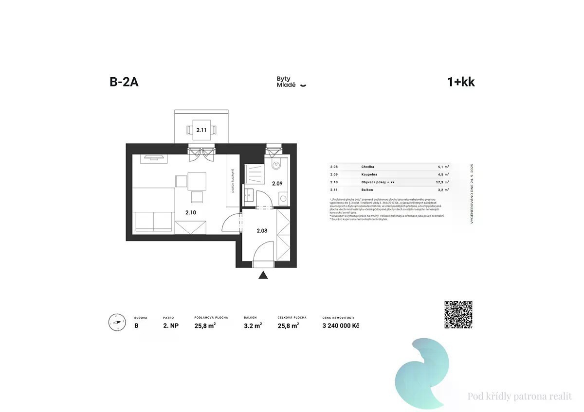 REALDOMUS Vám představuje projekt Byty Mladé, který vyroste v žádané lokalitě Mladé na jihovýchodě Českých Budějovic. Dvě moderní budovy nabídnou celkem 37 bytů v dispozicích 1+kk, 2+kk, 3+kk, 4+kk, 5+kk. Každý z bytů má balkon nebo terasu a přidělenou sklepní kóji. Venkovní a vnitřní parkovací místa jsou samozřejmostí. Velkou výhodou těchto bytů budou nízké provozní náklady, zajištěné díky kvalitnímu provedení stavby a napojení na městské dálkové vytápění. Nabízený byt č. B-4A o dispozici 1+kk, výměře 27,7 m2 a balkonem 3,2 m2, se nachází v prvním patře budovy B. Disponuje vstupní chodbou, koupelnou a obývacím pokojem s kuchyňským koutem. V ceně je zahrnuto standardní vybavení kvalitními zařizovacími předměty: sprchový kout/vana, umyvadlo, toaleta, obklady, dlažby, vnitřní dveře včetně dřevěných zárubní a podlahové krytiny. Možnost výběru kuchyňské linky u partnera projektu za zvýhodněnou cenu. V docházkové vzdálenosti MHD, škola, školka, supermarket Penny, sportoviště. V přípravě je i nová cyklostezka, vedoucí přímo před domem. Nedaleko je počítáno také s výstavbou retail parku s množstvím obchodů, restaurací a dalších služeb. Předpokládaný termín dokončení je duben 2027. Ideálních nabídka bytů pro jednotlivce, páry i rodiny. Využijte už teď jedinečné příležitosti a najděte bydlení nebo investici v tomto projektu. Pro podrobnější informace kontaktujte realitního makléře.