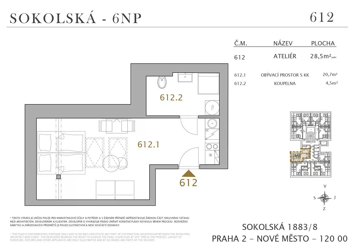 Ve výhradním zastoupení vlastníka nabízíme světlou, zcela nově zrenovovanou ubytovací jednotku v posledním šestém nadzemním podlaží o velikosti 28.5m2. Jedná o podkrovní jednotku orientovanou do klidného vnitrobloku. Kupní cena zahrnuje podlahové vytápění, klimatizaci, podlahové krytiny, přípravu na kuchyňskou linku, kompletně vybavenou koupelnu se sprchovým koutem a přípravou na pračku. Dům se nachází v lukrativní lokalitě Prahy 2, v ulici Sokolská, v docházkové vzdálenosti do centra. Veškerá vybavenost v blízkém okolí, stanice autobusu i metra jen několik minut chůze. V objektu bude k dispozici prostor pro recepci. Součástí prodeje je komora na stejném podlaží o velikosti 2,9m2. Dům prochází renovací včetně společných prostor a výtahu a k předání bude v říjnu 2025.