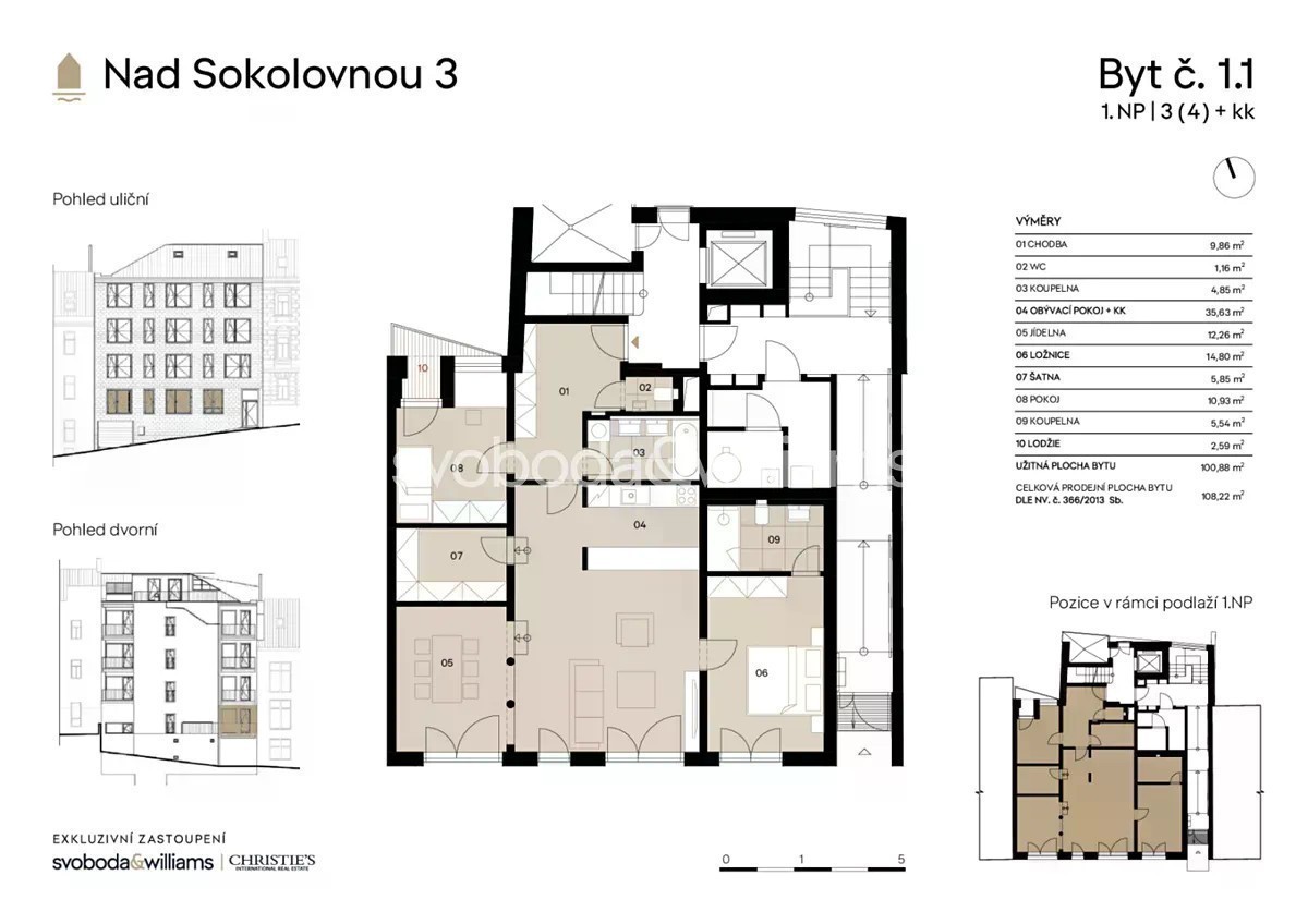 Nadstandardní klimatizovaný byt s lodžií a parkováním tvoří součást nové komorní rezidence v Podolí, žádané lokalitě jen pár zastávek tramvají z centra Prahy. Dispozice prostorného bytu situovaného v 1. podlaží novostavby zahrnuje obývací pokoj propojený s jídelnou a přípravou pro kuchyňský kout, 2 ložnice, šatnu, koupelnu s vanou, samostatnou toaletu a vstupní halu. Jídelní část lze jednoduchým přepažením oddělit a vytvořit tak další samostatný pokoj. Lodžie, orientovaná do klidného vnitrobloku, je přístupná z ložnice. K bytu náleží parkovací stání v zakladači. Moderní bytový dům s výtahem a cihlovou fasádou byl navržen s důrazem na detail a výběr kvalitních materiálů. Vysoký standard provedení zahrnuje dřevohliníková okna s izolačními trojskly a elektrickými předokenními žaluziemi, třívrstvé dubové podlahy českého výrobce Esco, elegantní koupelny s velkoformátovými obklady a dlažbou v odstínu slonové kosti, klimatizaci a podlahové vytápění doplněné topným žebříkem. Podolí patří mezi vyhledávané pražské čtvrti díky své poloze u nábřeží Vltavy a blízkosti centra, kam se lze pohodlně a rychle dostat tramvají. Lokalita s kompletní občanskou vybaveností se pyšní impozantní dominantou Podolské vodárny a je známá hlavně jako čtvrť rekreačně - sportovní a vodní. K aktivnímu odpočinku i zábavě láká plavecký stadion, yacht club, areál Žluté lázně či ostrov Císařská louka, nákupy lze obstarat v obchodní galerii Arkády Pankrác. Procházkou se dá dojít přes Podolské schody na pověstmi opředený Vyšehrad, odkud se otevírají působivé výhledy na město. Podlahová plocha 108,22 m2, lodžie 2,59 m2.