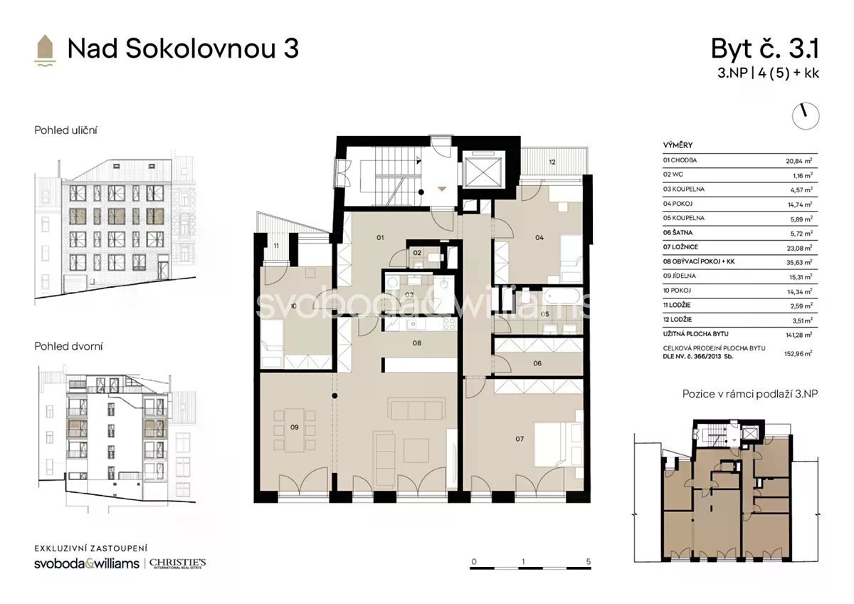 Nadstandardní, více než 150metrový klimatizovaný byt se dvěma lodžiemi a parkováním tvoří součást nové komorní rezidence v Podolí, žádané lokalitě jen pár zastávek tramvají z centra Prahy. Byt lze snadnou úpravou rozdělit na dvě samostatné jednotky. Dispozice prostorného bytu situovaného ve 3. podlaží novostavby je aktuálně řešena jako 4+kk a zahrnuje obývací pokoj s jídelnou a přípravou pro kuchyňský kout, 3 ložnice, šatnu, koupelnu s vanou, samostatnou toaletu a vstupní halu. Ke dvěma ložnicím, orientovaným na severovýchod, přiléhají lodžie. Jednoduchým oddělením jídelní části od obývacího pokoje příčkou je možné vytvořit další pokoj, a tím změnit dispozici na 5+kk, možností je také vytvořit novou příčku a vchodové dveře ve vstupní hale, čímž vzniknou zcela samostatné jednotky 3+kk a 2+kk s lodžiemi (s kuchyní v původní šatně, kde jsou již připraveny rozvody). Moderní bytový dům s výtahem a cihlovou fasádou byl navržen s důrazem na detail a výběr kvalitních materiálů. Vysoký standard provedení zahrnuje dřevohliníková okna s izolačními trojskly a elektrickými předokenními žaluziemi, třívrstvé dubové podlahy českého výrobce Esco, elegantní koupelny s velkoformátovými obklady a dlažbou v odstínu slonové kosti, klimatizaci a podlahové vytápění doplněné topným žebříkem. K bytu náleží 2 garážová stání. Podolí patří mezi vyhledávané pražské čtvrti díky své poloze u nábřeží Vltavy a blízkosti centra, kam se lze pohodlně a rychle dostat tramvají. Lokalita s kompletní občanskou vybaveností se pyšní impozantní dominantou Podolské vodárny a je známá hlavně jako čtvrť rekreačně - sportovní a vodní. K aktivnímu odpočinku i zábavě láká plavecký stadion, yacht club, areál Žluté lázně či ostrov Císařská louka, nákupy lze obstarat v obchodní galerii Arkády Pankrác. Procházkou se dá dojít přes Podolské schody na pověstmi opředený Vyšehrad, odkud se otevírají působivé výhledy na město. Podlahová plocha 152,96 m2, lodžie 2,59 m2 a 3,51 m2.