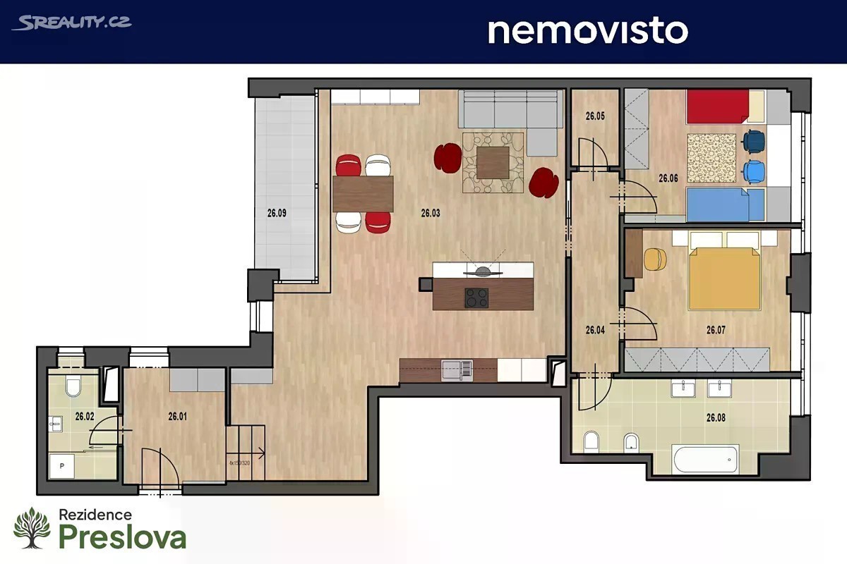 Poslední nové byty NA PRODEJ v developerském projektu Rezidence Preslova, který se nachází v centru Ostravy u parku Komenského sady. Zažijte prostor, komfort a bezpečí. Hlavní výhody projektu: - máme zkolaudováno = nastěhování ihned - dřevěná okna s trojskly a venkovními žaluziemi - kvalitní dřevěná podlaha a keramická dlažba - komfortní podlahové vytápění s termostatem - možno dokoupit garážové stání a sklep Rodinná bytová jednotka č. 26. Velkoryse řešený byt je umístěný do druhého nadzemního podlaží. Celková podlahová plocha 117 m2 nabídne obývací pokoj s kuchyní a jídelnou o výměře 54 m2 se vstupem na terasu. Užívejte si nadstandardní komfort a prostor. Celkem dva pokoje. Jeden o výměře 14,6 m2 a druhý o výměře 13,8 m2. Podlahové vytápění má ovládání v každé místnosti. Koupelna nabídne dvě umyvadla, vanu a toaletu s bidetem. K dispozici je i druhá samostatná toaleta. Maximální soukromí poskytnou elektricky ovládané venkovní žaluzie. Rezidence nabízí podzemní parkování, garážové stání je možno dokoupit za cenu 429.900,- vč. DPH. Zakoupit si můžete také prostorný sklep. Vše potřebné od obchodů, restaurací, zdravotního střediska nebo koníčků pro děti máte v docházkové vzdálenosti. Tenisové kurty, sportoviště, Komenského sady, vnitřní bazén i venkovní koupaliště pouhých 5 minut chůze od domu. V okolí se nachází prestižní 1st International School of Ostrava, základní i mateřská škola, vyhlášené Matiční gymnázium a Ostravská univerzita. Kontaktujte výhradního prodejce, společnost NEMOVISTO a domluvte si osobní prohlídku bytů ještě dnes.