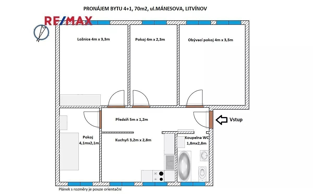 Dobrý den, nabízíme Vám k dlouhodobému pronájmu prostorný byt 4+1 o rozloze 70m2, který se nachází v atraktivní a vyhledávané lokalitě, v přízemí cihlového domu v ulici Mánesova. Tento byt je ideálním místem pro mladou rodinu, která hledá pohodlné a příjemné bydlení v blízkosti veškeré občanské vybavenosti a s možností sportovního vyžití v okolí. Dispozice s rozměry místností najdete v plánu bytu. Byt je vybaven plynovým kotlem, který zajišťuje efektivní topení a ohřev vody, což přispívá k nízkým nákladům na energie. Na podlahách se nachází lino v ložnici a pokoji je zátěžový koberec v koupelně dlažba. Součástí obýváku je elektrický krb s dálkovým ovládáním. Kuchyně je prakticky řešena a vybavena kuchyňskou linkou, plynovými kamny, ele. troubou a myčkou, což ocení každý, kdo rád vaří a tráví čas v kuchyni. Prostor je dostatečně prostorný, aby se do něj vešla i jídelní část. Nájemné bytu činí 12.000.-Kč/měsíc. Zálohy na služby (SV) spojené s užíváním bytu za 1 osobu činí 600 Kč (každá další osoba 600,-Kč navíc). Zálohy na elektřinu a plyn hradí nájemce po přepisu přímo dodavateli energií, přepis zajistí makléř. Výše měsíčních záloh je závislá od počtu osob v bytě. Pro zajištění pronájmu je požadována vratná kauce ve výši 25.000 Kč. Pronajímatel si vyhrazuje právo vybrat nájemce na základě jím zvolených kritérií. Podmínkou trvalý měsíční příjem z pracovní činnosti, bezdlužnost, osobní setkání. Pro max. 4 osoby. Při podpisu nájemní smlouvy je nutné složit nájem na aktuální měsíc včetně záloh na služby, vratnou kauci a provizi za zprostředkování ve výši jednoho nájmu + DPH. Byt je ideální pro dlouhodobý klidný pronájem. Parkování je k dispozici v ulici u domu. Vřele doporučuji. Více informací o podmínkách nájmu Vám rád sdělím po telefonu.