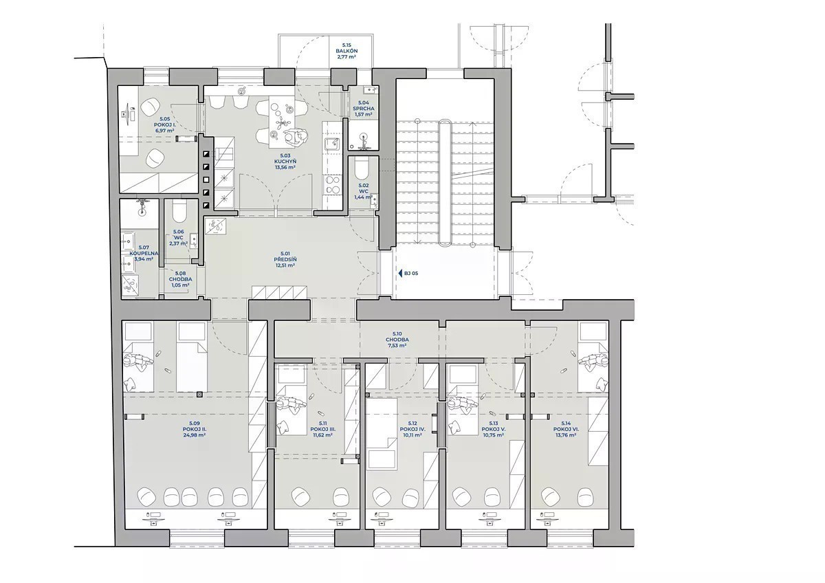 Nabízíme k pronájmu prostorné pokoje v nově zrekonstruovaném bytě na Jaselské 2 - byt je po kompletní rekonstrukci, připraven k nastěhování k 01.12. (aktuálně se dokončují poslední detaily). Nabízíme jednotlivé pokoje v bytě ve 3. NP krásného historického domu na rohu Jaselské a Marešové. Skvělá adresa v centru Brna, vše po ruce a výborná dostupnost MHD. Společné zázemí tvoří velká kuchyně s jídelnou a balkonem, předsíň, 2 koupelny + 2 samostatné WC, takže nebude ráno třeba nervózně přešlapovat a čekat v řadě. Každý pokoj má vlastní spací patro, které zvětšuje plochu pokoje a nabízí vice soukromí. Pronajímá se po pokojích (viz půdorysy a karty). Dostupné pokoje a výměry (pokoj + spací patro): Pokoj č. 1 - 10,73 m² - cena 8 000 Kč/měs. Pokoj č. 2 - 24,98 m²- cena 14 900 Kč/měs. Pokoj č. 3 - 18,49 m² - cena 9 900 Kč/měs. Pokoj č. 4 - 15,97 m² - cena 9 900 Kč/měs. Pokoj č. 5 - 17,05 m² - cena 9 900 Kč/měs. Pokoj č. 6 - 20,02 m² - cena 11 900 Kč/měs. Zálohy na energie + 1 500 Kč/osoba/měs. Kauce ve výši jednoho měsíčního nájmu. Bez provize. Pokoje jsou přizpůsobeny pro studenty. Celý byt bude vybaven 2xlednicí, 2xmikrovlnkou, myčkou, pračkou, rychlým internetem a v každém pokoji bude možnost připojit se na optický kabel. V řešení je i vybavení bytu tiskárnou a skenerem. Do bytu bude chodit jednou za čtrnáct dní uklízečka, která je již v ceně nájmu - bydlení jak v 5* hotelu. Pokoje budou vybaveny dle individuální potřeby. (pracovní stůl, židle, postel/matrace, skříně. Bonusy bytu: balkon do vnitrobloku, vysoké stropy, dobře zvukově izolované pokoje - jak mezi sebou, tak od ulice. Ideální pro jednotlivce, nebo sdílení pokoje s kamarády, kteří chtějí bydlení v centru s vlastním pokojem a příjemným společným zázemím. Nájemní smlouva bude na jednotlivé pokoje, tedy si sami můžete vybrat případné spolubydlící. Pro více informací, dostupnost konkrétních pokojů a prohlídku pište/volejte. Prohlídky plánujeme od 24.11. - 28.11., kvůli posledním úpravám bytu/pokojů. Upřednostňuji kontaktováním přes emailovou adresu, kde uvedete i své tel. číslo, na které Vás budu kontaktovat, abychom domluvili na společné prohlídce.