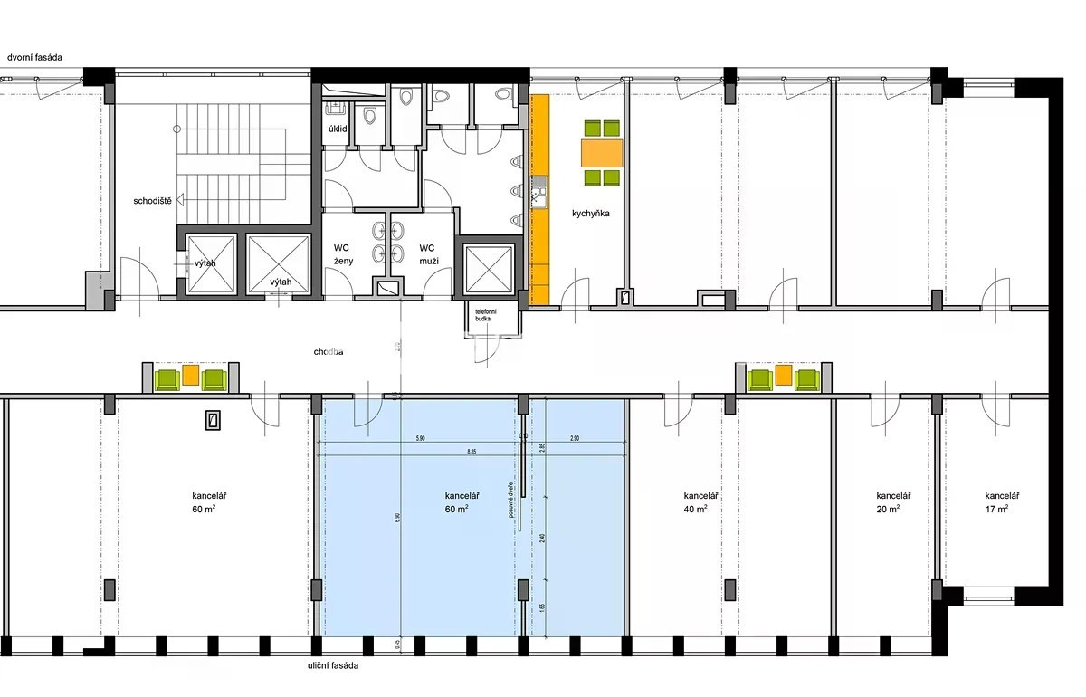 Nabízíme k pronájmu dvě propojené kanceláře v rámci moderní administrativní budovy v centru města Brna. Celková výměra je 60m2 a prostor je rozdělen na kancelář 39m2 a 21m2 dřevěnými posuvnými dveřmi. Menší kancelář lze využívat např. jako jednací místnost, místo pro vedoucího kanceláře apod. Vchod do kanceláře je přes větší 39m2 prostor. Podlaží má sdílené sociální zázemí, kuchyňku, je zde odpočinková zóna a zóna pro nerušené telefonování. Budova je vybavena recepcí/ ostrahou, výtahem, klimatizací a je zde k dispozici i sdílená zasedací místnost. Budova má vlastní odpočinkovou zónu se zelení a omezené podzemní parkovací stání. V okolí objektu je modrá parkovací zóna B. Podrobnosti Vám rádi poskytneme v RK.