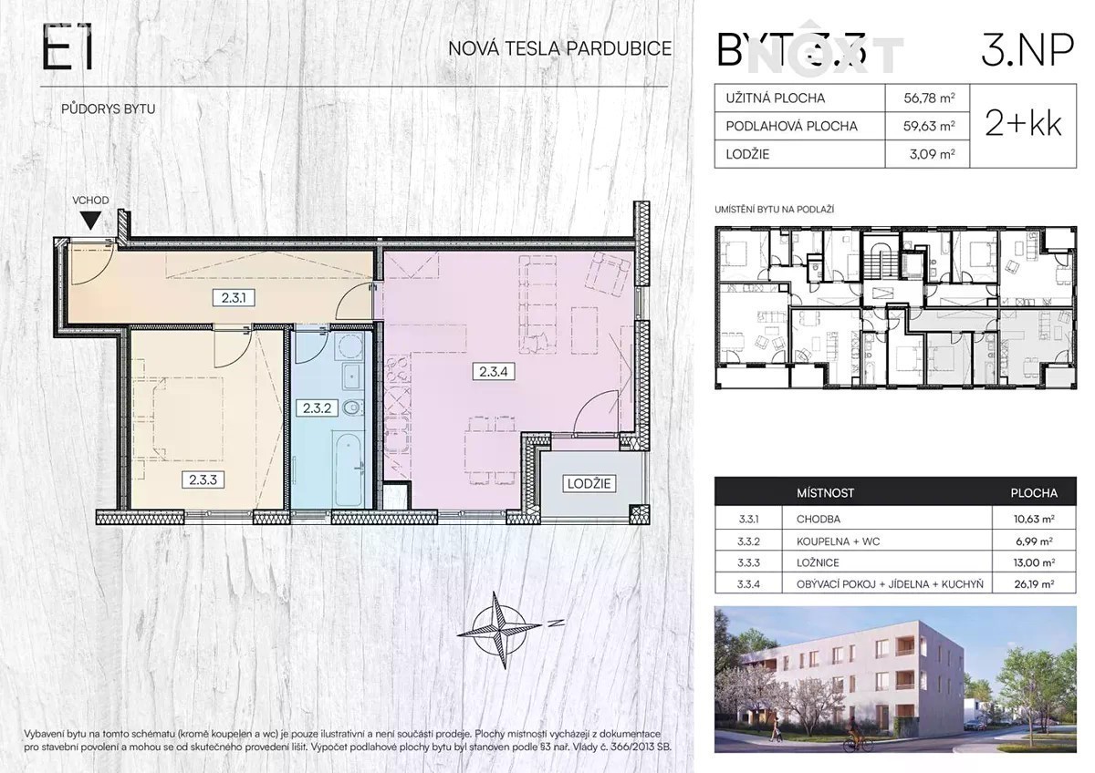 Nabízím k prodeji moderní byt 2+kk o celkové ploše 60 m² včetně lodžie, který se nachází ve třetím nadzemním podlaží nového bytového domu v atraktivním areálu Nová Tesla v Pardubicích. Byt je dispozičně velmi dobře řešený - prostorný obývací pokoj s kuchyňským koutem a jídelní částí poskytuje dostatek místa pro každodenní život, ložnice nabízí klidné zázemí a samozřejmostí je koupelna s toaletou a vstupní chodba. K bytu náleží lodžie o velikosti přes 3 m², ideální pro odpočinek na čerstvém vzduchu. Areál Nová Tesla, kde se byt nachází, patří k nejzajímavějším projektům současného bydlení v Pardubicích. Dům je součástí moderní dřevostavby, jejíž montáž se v létě 2025 blíží k finále a která představuje nový trend udržitelného a energeticky úsporného bydlení. Projekt kombinuje moderní architekturu s důrazem na kvalitu a komfort, zároveň navazuje na historii bývalého průmyslového areálu Tesly a přetváří jej v živou čtvrť s občanskou vybaveností i zelenými plochami. K bytu lze dokoupit kryté parkovací stání. Nová Tesla Pardubice nabízí výbornou dostupnost do centra města i na hlavní dopravní tahy, v okolí je široká nabídka služeb, obchodů, sportovišť i škol. Díky promyšlenému urbanistickému řešení a důrazu na příjemné prostředí se z této lokality stává atraktivní místo pro život jednotlivců, párů i rodin. Byt je ideální volbou pro ty, kteří hledají nové moderní bydlení v dynamicky se rozvíjející části Pardubic, s výhodami udržitelné dřevostavby a možností stát se součástí unikátního projektu, který posouvá kvalitu bydlení v regionu na novou úroveň. Pro komunikaci uvádějte evidenční číslo zakázky N114219.