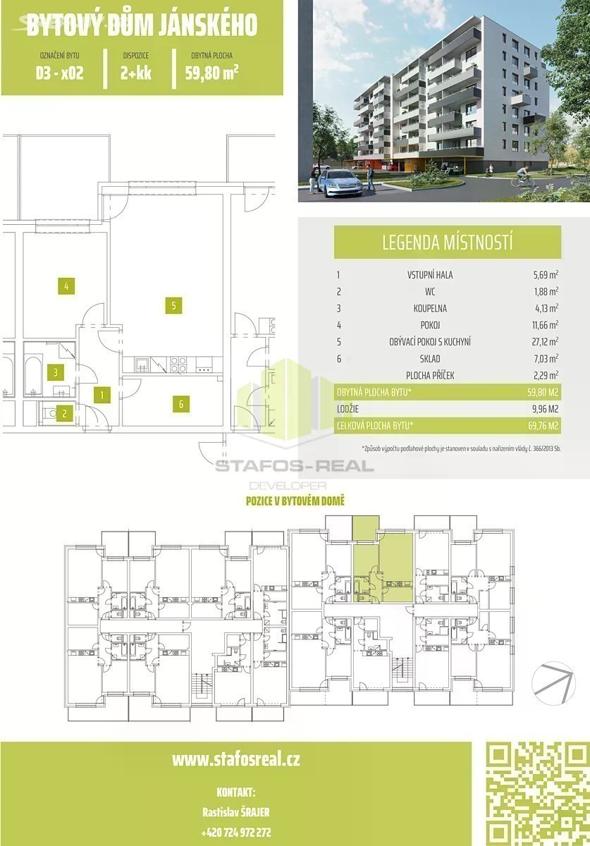 Představujeme vám jedinečnou příležitost k pronájmu novostavby moderního bytu 2+kk s užitnou plochou 59,8 m2 a lodžií o rozloze 17 m2. Tento byt se nachází v 1. nadzemním podlaží kvalitní novostavby, která bude dokončena na přelomu září/říjen 2025. Těšit se můžete na prestižní lokalitu na ulici Janského, v oblíbeném olomouckém obvodu Povel. Lokalita je ideální pro každodenní život, ať už kvůli blízkosti centra města, Fakultní nemocnice či dálničního příjezdu do Olomouce, tak díky snadné dostupnosti širokého spektra obchodů, služeb a dopravních spojení. Vaše nové bydlení nabídne jihovýchodní orientaci a prostorný obývací pokoj s kuchyňským koutem a vstupem na lodžii. Součástí bytu je také ložnice, vstupní hala, velkoryse prostorná šatna, koupelna a samostatné WC. Interiér je dokonalý až do detailu - vinylovou podlahu doplňují okna s trojsklem, moderní keramické obklady a dlažba v koupelně, či klimatizace u vybraných bytů a vnitřní žaluzie. Výjimečnost tohoto bydlení dokreslují prvotřídní služby a zařízení objektu. Tento bytový dům patří do energetické třídy B, což znamená nižší náklady na bydlení. Dům také nabízí komfortní řešení zvukového a tepelného útlumu mezi byty i oddělení chodeb od výtahu, bezbariérový přístup, moderní výtah, vysokorychlostní internet a mnoho dalšího. Nájemné činí 15.100 Kč/měsíc plus náklady na bydlení cca 2.700 Kč a elektřinu. Byt se pronajímá nevybavený, součástí je kuchyňská linka se spotřebiči a lednicí s mrazákem. Kauce je ve výši dvou měsíčních nájmů, s možností rozdělení na dvě splátky. K bytu je také možnost pronajmout jednu ze čtyř variant parkovacích stání a dle dostupnosti také sklep. Odměna RK ve výši jednoho nájmu + 21% DPH. Začněte Vaší novou životní kapitolu bydlení a vychutnejte si radost z bydlení v zbrusu novém bytě. Prověřujeme evidenci exekucí, insolvencí a dluhů na zdravotním pojištění našich potenciálních nájemníků. Pro lepší představu o tomto bydlení vám doporučujeme shlédnout virtuální prohlídku, která vám také poskytne možnost změřit jakýkoliv rozměr tohoto bytu. Volné od listopadu/prosince 2025. Kompletní výběr bytů v tomto domě najdete v kartě projektu a na našich stránkách.