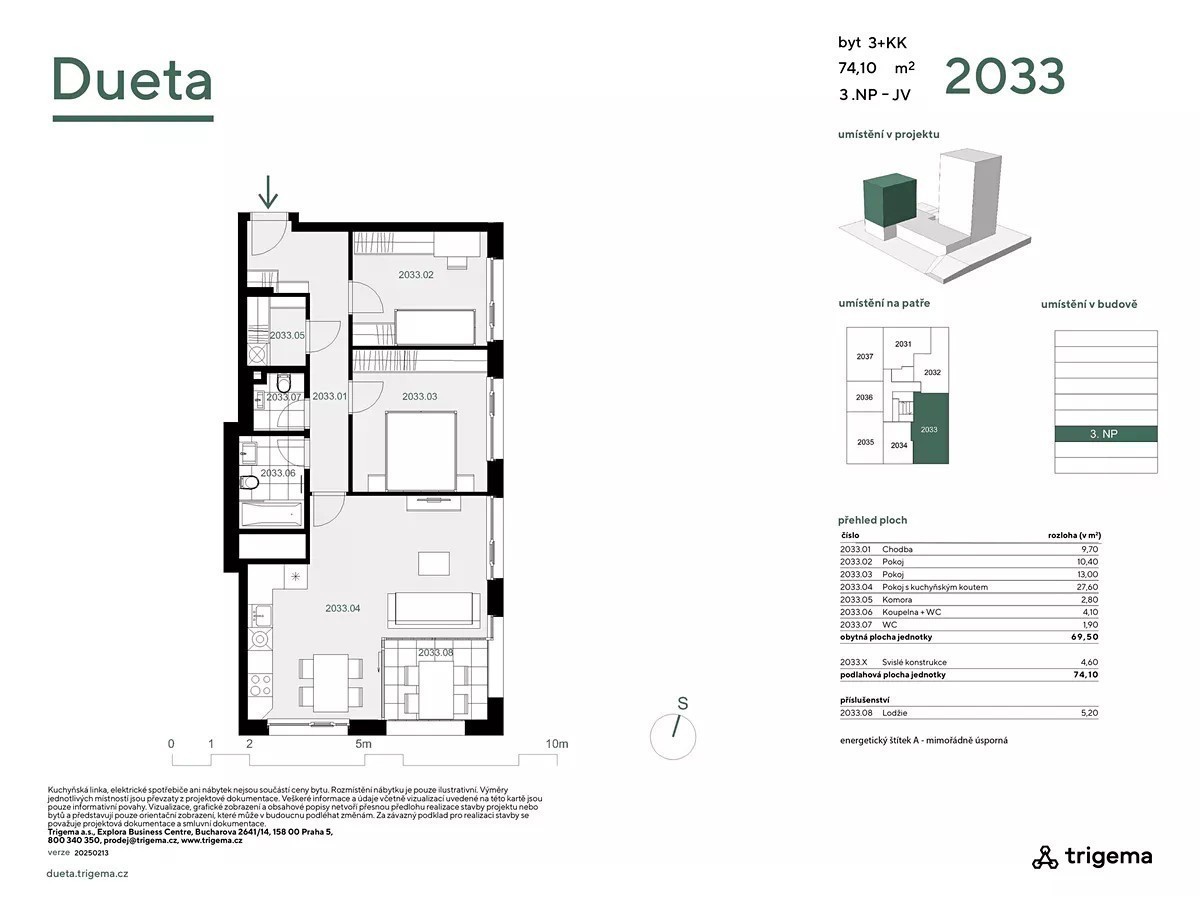 Byt č. 2033: Velkorysý 3+kk s lodžií a JV orientací Novostavba bytu v úspěšném developerském projektu pouhých 5 minut od budoucí stanice metra trasy D! Místo výstavby přímo navazuje na Kamýcký les a přilehlý park, nabízí překrásné výhledy do zeleně i na Prahu. 40 % bytů prodáno během prvních 6 měsíců, výstavba již zahájena. Byt č. 2033 o dispozici 3+kk a podlahové ploše 74,1 m² nabízí prostor a komfort pro rodinné bydlení. Nachází se ve 2. nadzemním podlaží projektu Dueta Kamýk s jihovýchodní orientací, která zajistí slunné dopoledne. Hlavní částí je obývací pokoj s kuchyňským koutem (27,6 m²), doplněný o dvě ložnice (10,4 m² a 13,0 m²). Lodžie o velikosti 5,2 m² a komora (2,8 m²) zvyšují praktičnost bytu. Součástí bytu je koupelna s WC (4,1 m²) a samostatné WC (1,9 m²). Hlavní benefity bytu č. 2033: • Velkorysá dispozice 3+kk s lodžií • Jihovýchodní orientace pro světlé dopoledne • Energetická třída A - mimořádně úsporná • Ideální pro rodiny hledající moderní bydlení Vhodné pro: Rodiny hledající prostorné bydlení s moderním zázemím. Byty jsou vybaveny nadstandardními technologiemi pro zdravé bydlení- rekuperací, podlahovým vytápěním, předokenními žaluziemi a kvalitními materiály, které zaručují pohodlí i úsporný provoz. Dům je ve výstavbě s předpokládanou kolaudací 7/2027. Součástí projektu budou také komerční prostory se službami - plánován je supermarket, fitness a další drobné služby. Výjimečná lokalita přímo u Kamýckého lesa nabízí klid a zeleň na dosah ruky, zároveň také velmi dobrou dostupnost díky plánované stanici metra Nové Dvory na trase D. V okolí je navíc skvělá občanská vybavenost. Dueta Kamýk je ideálním řešením jak pro vlastní bydlení, tak jako chytrá investice v rychle se rozvíjející lokalitě. Další nabídku bytů je možné nalézt na našich webových stránkách.