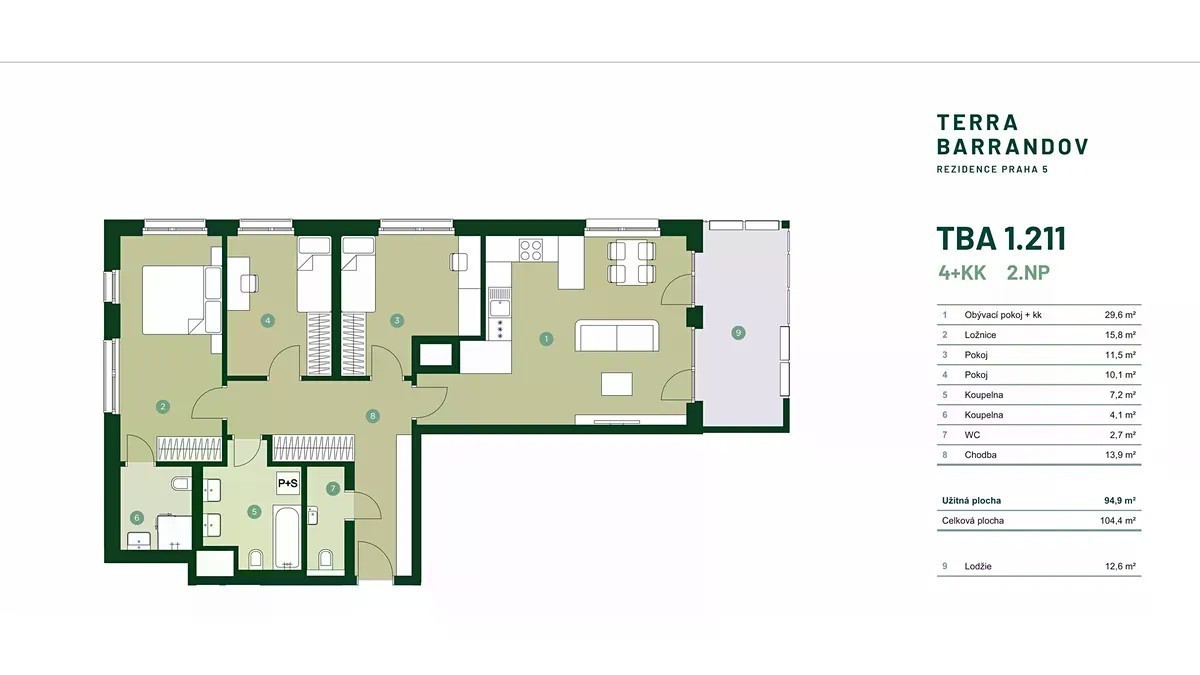 Terra Barrandov Praha 5, ulice Silurská 4+kk 104,4 m2 s lodžií 12,60 m2 v 2. nadzemním podlaží Orientace bytu: ZSV Nabízíme moderní a světlý byt 4+kk v 2. nadzemním podlaží prestižního projektu Terra Barrandov. Tento prostorný byt s praktickým uspořádáním a vysokým standardem nabízí ideální prostředí pro komfortní život. Dispozice zahrnuje velký obývací pokoj s kuchyňským koutem a přímým vstupem na lodžii a tři ložnice. Koupelny jsou zařízeny vanou, nebo sprchovým koutem, druhá toaleta zvlášť. Praktická komora a předsíň s dostatkem úložných prostor. K bytu náleží sklepní kóje. Možnost dokoupení garážového stání. Součástí bytu jsou technologické prvky, které výrazně zvyšují komfort bydlení a zároveň přispívají k energetické úspornosti: podlahové vytápění, systém dochlazování a řízené větrání s rekuperací. Tyto standardy zajišťují příjemné vnitřní klima během celého roku a nižší provozní náklady. Byt je navržen s důrazem na funkčnost a každodenní pohodlí, nechybí kvalitní materiály, dostatek denního světla, ani promyšlené dispoziční řešení. Projekt Terra Barrandov nabízí nejen moderní bydlení, ale také prostředí podporující komunitní život. Obyvatelé mohou využívat sdílené prvky, jako je komunitní zahrada se skleníkem, klubovna, dětské hřiště nebo místo na grilování. Obyvatelé mají navíc k dispozici společnou střešní terasu. Projekt je rozvržen do několika objektů, což přispívá k většímu soukromí, klidné atmosféře a příležitostem ke komunitnímu setkávání. Lokalita Silurské ulice na Barrandově nabízí výbornou dostupnost do centra Prahy, pouhých 8 minut MHD, a zároveň přírodu doslova za rohem. V okolí najdete mateřskou i základní školu, obchody, lékárnu, kavárny, hřiště i několik zastávek tramvaje a autobusu. Milovníci přírody ocení blízkost Chuchelského háje s Mariánským pramenem nebo vyhledávaného Prokopského údolí, ideálního pro běh, procházky i cyklistiku. Nabídka je vhodná pro všechny, jak pro páry, rodiny s dětmi, ale i jako investiční nemovitost pro dlouhodobý pronájem. Díky spojení praktické dispozice, kvalitního provedení, šetrných technologií a atraktivní lokality jde o zajímavou příležitost s dlouhodobou hodnotou. V případě zájmu nás neváhejte kontaktovat a navštivte klientské centrum developera JRD, kde je možné využít virtuální prohlídku a vzorkovnu nabízených standardů. V nabídce je celkem 225 bytů různých velikostí od 1+kk po 4+kk, které jsou navrženy tak, aby vyhovovaly rozmanitým potřebám budoucích obyvatel.