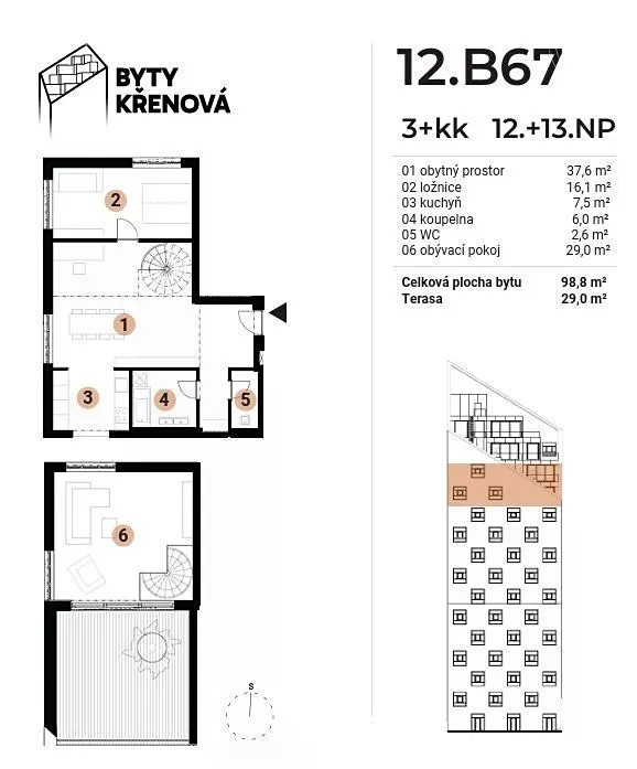 Přestavujeme Vám pokračování úspěšného projektu LOFT BLOK Křenová. Ikonická stavba, která přináší do centra města moderní design a výhledy, které vás nepřestanou bavit - Petrov, Špilberk i celé panorama Brna máte doslova na dosah. Tento projekt spojuje špičkovou architekturu, promyšlené dispozice a nadstandardní technické řešení. Ať už hledáte nový domov, nebo investici, která si drží hodnotu, tady najdete obojí - v té nejlepší brněnské lokalitě ve středu města. Bytová jednotka, která je řešená jako mezonet, o dispozici 3+kk a velikosti 98,80 m2 se nachází ve 12.NP a 13.NP z celkových 16.NP. K bytu náleží prostorná terasa (29 m2). Díky umístění ve vyšším podlaží se můžete těšit na krásný výhled směrem na město a dostatek denního světla. Standard bytu Světlé prostory, kvalitní vinylové podlahy a keramická dlažba Interiérové dřevěné dveře s obložkovými zárubněmi Bezbariérový přístup se dvěma výtahy Kompletní příprava na kuchyň a digestoř Klimatizace Centrální vytápění napojené na městskou teplárnu Optický internet, TV a audiotelefon u vstupu Možnost dokoupení garážového parkovacího stání a sklepní jednotky Jen pár kroků od Vašeho prahu naleznete kavárny, restaurace, obchody, dětská hřiště i zelené plochy pro relaxaci. Stačí nasednout na kolo a po přilehlé cyklostezce vyrazíte k brněnské přehradě či do klidných lesů Hádů. Moderní bydlení v centru Brna tak spojuje to nejlepší z nejlepší z - dynamiku velkoměsta a klid domova, který se Vám nikdy neomrzí. Do úplného centra Brna se dostanete za pár minut pěšky nebo tramvají, přičemž zastávky MHD se nacházejí v těsné blízkosti projektu. Hlavní vlakové a autobusové nádraží jsou vzdáleny jen pár minut chůze, což zajišťuje vynikající napojení nejen v rámci města, ale i na dálkové spoje. Autem jste na dosah městskému okruhu i nájezdům na dálnice D1 a D2. Ať už míříte do Prahy, Vídně nebo Bratislavy, hladké napojení Vám každý den ušetří cenný čas. Lokalita s vysokým potenciálem rozvoje - v blízkosti se plánují nové služby a vznikají další příležitosti, které zvýší komfort bydlení v docházkové vzdálenosti. Podívejte se na kompletní nabídku dalších jednotek na webu projektu BYTYKRENOVA.CZ - naleznete tam různé dispozice i velikosti, ze kterých si určitě vyberete. Předpokládaný termín dokončení je začátek roku 2027. Neváhejte nás kontaktovat - poradíme Vám s výběrem Vašeho vysněného bydlení či investice.