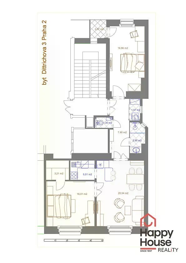 Nabízíme k prodeji nový byt 3+kk o podlahové ploše 76,12 m² s lodžií (2,07 m²) a sklepem. Byt se nachází ve 2. patře zrekonstruovaného činžovního domu s výtahem v ulici Dittrichova, v atraktivní lokalitě Nového Města v Praze 2. Dispozice zahrnuje prostorný obývací pokoj s přípravou na kuchyňský kout, hlavní ložnici s šatnou, další pokoj s vstupem na lodžii, koupelnu, samostatnou toaletu, technickou místnost a vstupní chodbu. Vysoké stropy dodávají prostoru vzdušnost. Byt je nabízen ve stavu white wall nabízí tedy ideální příležitost doladit si interiér podle vlastního vkusu a stylu. Kvalita provedení je ve vysokém standardu dřevěné podlahy v parketovém vzoru, stylová keramická dlažba, moderní sanita, špaletová okna a renovované původní dveře dodávají bytu osobitou kombinaci staré Prahy a moderního bydlení. K vytápění slouží vlastní plynový kotel zn. Junkers. Dům je klidný, s příjemnou atmosférou a velmi nízkými provozními náklady - měsíční poplatky činí pouze 2 255 Kč. Lokalita nabízí vše, co si můžete přát - výbornou dopravní dostupnost (metro B Karlovo náměstí i tramvaj Palackého náměstí do 2 minut chůze), pestrou nabídku restaurací, obchodů, služeb, kaváren, kulturního vyžití i relaxaci u řeky nebo na trzích na Náplavce. Díky své poloze, dispozici a nízkým provozním nákladům je vhodnou možností i na krátkodobé pronájmy. Cena je včetně právního servisu a provize RK. Ať už hledáte byt k vlastnímu bydlení nebo jako investici k pronájmu, rádi Vám poskytneme naše nadstandardní služby v oblasti správy nemovitostí.