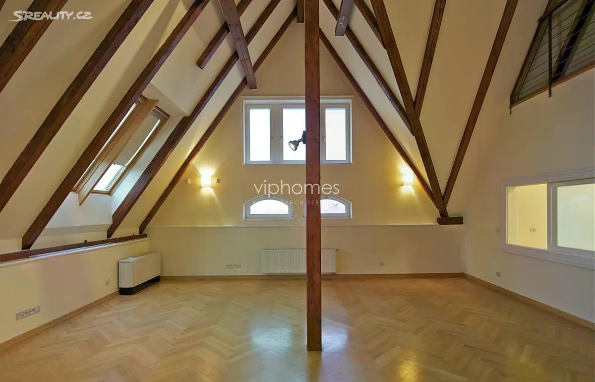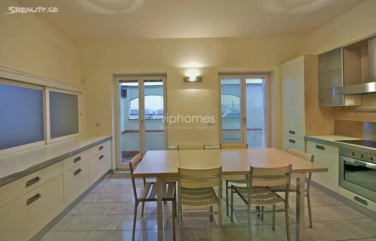 Stylový plně klimatizovaný podkrovní penthouse 5+kk (265m2) s možností parkování, s balkonem a velkou terasou situovaný v 5. a 6. patře rekonstruované novorenesanční budovy z konce 19. století Exklusivní lokalita plná zeleně, parků a nádherných zahrad V bezprostřední blízkosti se nachází romantický park “Kinského sady” romantická zahrada růží na Petříně a řada restaurací, kaváren, důležitých obchodů a služeb, jako například nákupní centrum “Nový Smíchov. Od Malé Strany, Kampy, Národního divadla dělí rezidenty jen několik minut klidné chůze. Francouzské lyceum v pěší dostupnosti. Vynikající dopravní dostupnost autem - napojení na Městský okruh, zastávka tramvají jen pár kroků od domu, stanice metra Anděl cca 4 minuty jízdy tramvaj Byt s výhledem na Pražský hrad a Petřín nabízí celkem. 4 ložnice, 3 koupelny,V úrovni vchodu ( spodní patro bytu nabízí vzdušný obývací pokoj s 8 m vysokým klenutým stropem, kompletně vybavenou kuchyň s balkonem a hezkým výhledem na nám. Kinských, hlavní ložnici s vlastní koupelnou (obklady mramor, Jacuzzi), vybavenou šatnou, 2.další koupelny a 2 ložnice s balkonem, šatnu a technické zázemí. V patře je umístěna 4 místnost / 4. ložnice s velkou terasou. Vybavení : na podlahách parkety, koupelny mramor, žaluzie, pračka, sušička, alarm, videotelefon, klimatizace. Úhrada za společné služby a spotřebu energií činí 20.000 Kč / měsíc. Úklid na vyžádání. Možnost pronájmu garáže přímo v domě za extra poplatek. K dispozici ihned.