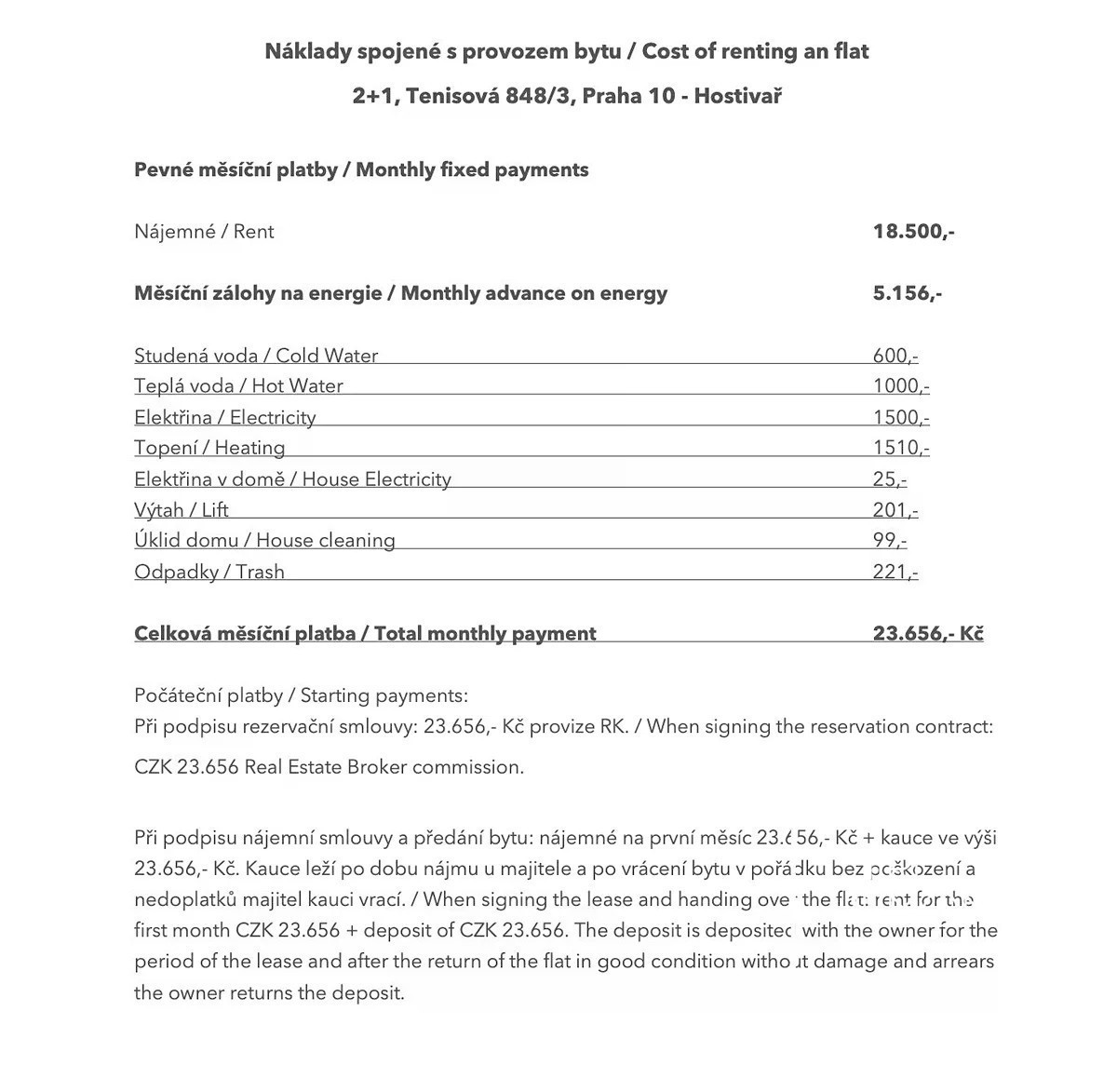 Nabízím vám velký byt 2+1 k pronájmu s výměrou 60 m2 v ulici Tenisová 848/3, Praha 10 - Hostivař. Byt prošel kompletní rekonstrukcí a je připraven k nastěhování. Nachází se ve zvýšeném přízemí (první nadzemní podlaží) revitalizovaného panelového domu. Byt obsahuje velký obývací pokoj, ložnici, samostatnou, plně vybavenou kuchyň, chodbu, koupelnu a wc. Dále je možné využívat společnou lodžii na chodbě domu s druhým bytem. V přízemí je umístěn sklep. Nájemné je 18.500,- Kč / měsíčně + zálohy na 5.155,- zálohy na energie a služby vč. elektřiny. Přesný rozpis je uveden ve fotografiích u této nabídky. Byt je v perfektním stavu a jedná se o velmi dobře udržovaný byt po rekonstrukci. Byt je připravený k nastěhování ihned. Stav a vybavení bytu odpovídá tomu, jak je uveden na fotkách. Při nastěhování se platí 23.656,- nájemné na první měsíc + 23.656,- kauce + 23.656,- provize.