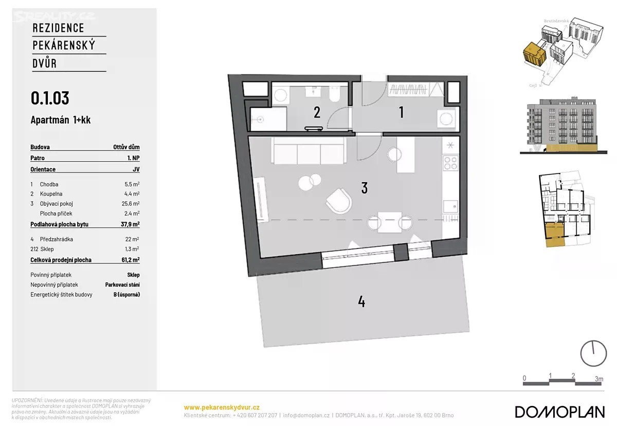 Bytové jednotky IHNED k nastěhování. Nabízíme k prodeji moderně navržené jednotky 1+kk o celkové ploše 45,0 m2 s předzahrádkou o velikosti 23,1 m2. Dispozičně jsou jednotky řešeny obývacím pokojem s kuchyňským koutem, koupelnou se sociálním zařízením a předsíní. Jako první v Česku přinášíme koncept klubového bydlení se širokou nabídkou služeb dostupných exkluzivně pro rezidenty (například wellness, fitness, recepci se službou concierge, grill pointy, workout zónu, dobíjecí stanice pro elektromobily, kola a další). V komplexu rezidence Pekárenský dvůr si vybíráte z bytů a apartmánů o dispozicích 1+kk, 2+kk, 3+kk, 4+kk, které z většiny disponují balkonem, terasou, předzahrádkou anebo kombinovaně. Téměř ke všem bytům a apartmánům náleží sklep na uložení potřebných věcí (za povinný příplatek). K jednotkám si můžete navíc přikoupit i prostorné parkovací stání umístěné ve dvoupodlažních podzemních garážích. Pekárenský dvůr představuje rozsáhlý bytový komplex s vlastním klidným vnitroblokem, který nabízí stylové komfortní bydlení v souladu s aktuálními světovými trendy. Architektura domů klade důraz na maximální prosvětlení interiérů, pracuje s vysoce kvalitními a nadčasovými materiály a zároveň odkazuje k industriální minulosti lokality. Skvělé bydlení, v dynamicky se rozvíjející čtvrti brněnských Zábrdovic, podtrhuje docházková vzdálenost historického centra města, výborná dopravní obslužnost, kompletní občanská vybavenost i blízkost oblíbených brněnských parků. Nyní Vám stačí pouze 15% z kupní ceny, s financováním koupě nemovitosti Vám rádi pomůžeme. Pro více informací o tomto výjimečném projektu nás neváhejte kontaktovat.