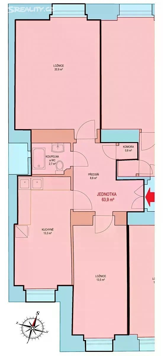 Nabízíme k prodeji byt v osobním vlastnictví o dispozici 2+1 s příslušenstvím a výměře 63,9 m2 (dle nař. vlády se započtením vnitřních příček a zabudovaných předmětů) ve 4. nadzemním podlaží cihlového domu v ulici Žerotínova, městské části Žižkov. Byt je neadaptovaný, vhodný k rekonstrukci, avšak plně funkční a v případě investiční koupě jej lze s nevelkým nákladem obratem pronajímat. Praktická dispozice bytu zahrnuje předsíň se vstupem do všech ostatních místností bytu, samostatnou kuchyň, obývací pokoj, ložnici, koupelnu společnou s WC a malou komoru. K bytu náleží zděná sklepní kóje v suterénu. Standardem bytu jsou špaletová okna (s orientací na jih do dvora a na sever do klidné ulice), starší kuchyňská linka s kombinovaným sporákem, původní dřevěné dveře do dřevěných zárubní, dřevěné parkety v pokojích a kuchyni a keramická dlažba v předsíni a koupelně, vana, kombi WC, starší plynový kotel (vytápění, ohřev vody). Samotný dům je dobře udržovaný, má např. nový výtah (zastávky v mezipatrech), ovládání dveří na čip, vyměněny páteřní rozvody vody, renovovanou střechu, osvětlení s pohybovými senzory, udržované společné části. Ulice Žerotínova se nachází v městské části Žižkov mezi vrchem Vítkov a parkem Parukářka. V blízkém okolí naleznete veškerou občanskou vybavenost a výborné dopravní spojení z nedalekých zastávek MHD (tram, bus) na metro trasy A (Jana Želivského), B (Palmovka) i C (Florenc). V případě, že Vás naše nabídka zaujala, neváhejte se přihlásit o podrobnější informace, popřípadě si rovnou sjednejte prohlídku tohoto bytu. Rádi se Vám budeme věnovat. Dovolujeme si upozornit, že majitel bytu si vyhradil právo finálního výběru zájemce o koupi a právo upřednostnit vyšší cenovou nabídku, než je inzerovaná cena.